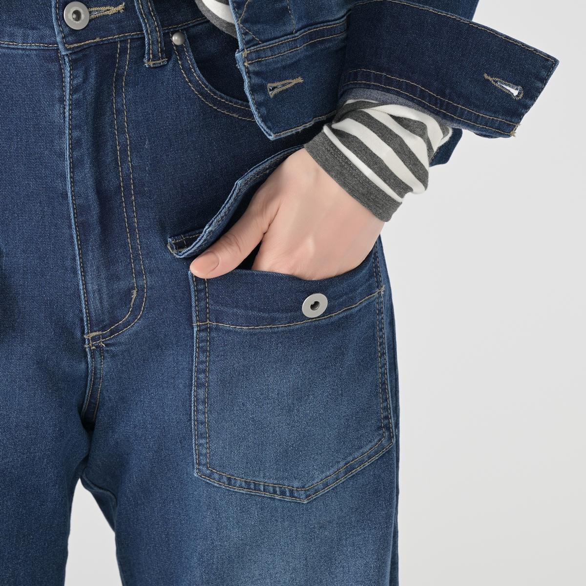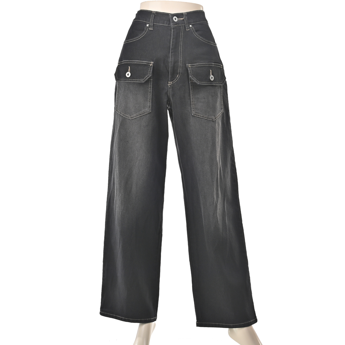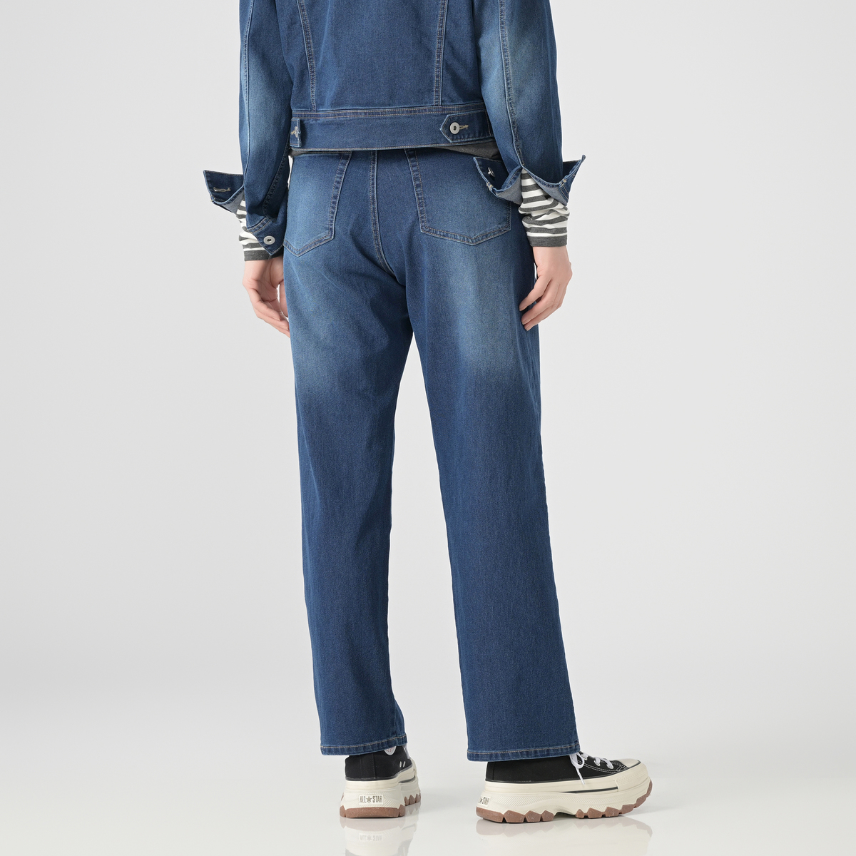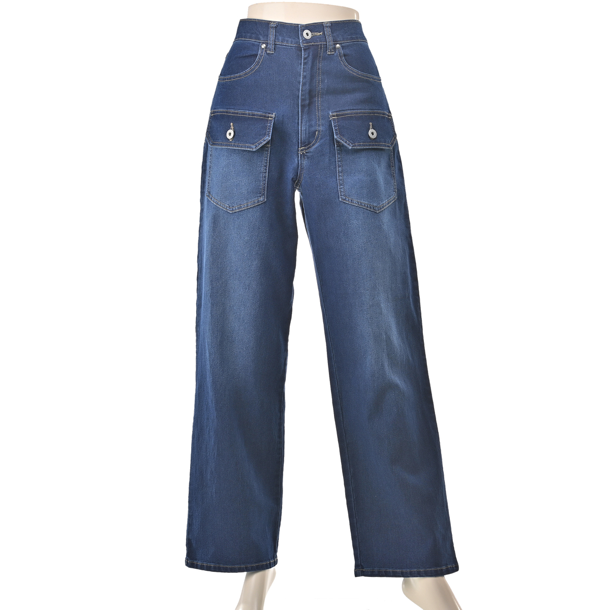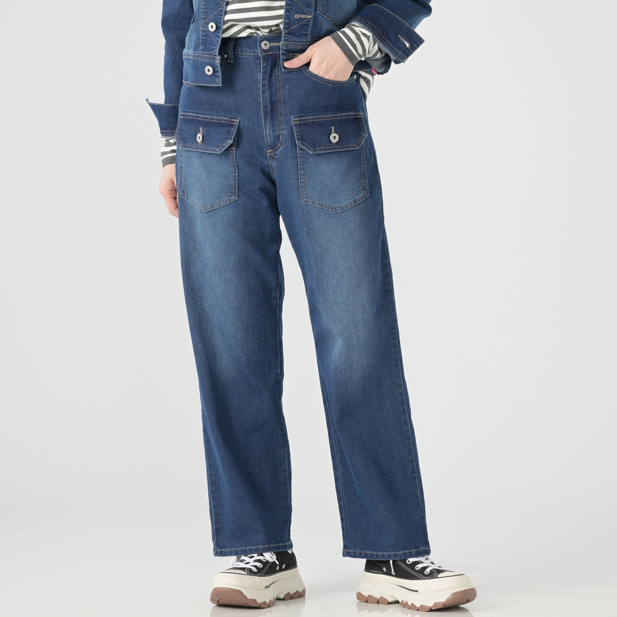 前身頃に大きなポケットを配したセミワイドデニムパンツ。セミワイドなシルエットで、通常のワイドパンツよりもボリューム控えめで、よりすっきりさせています