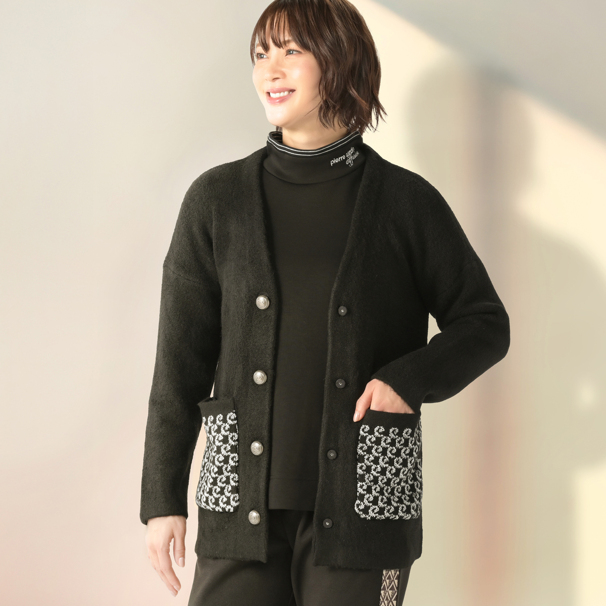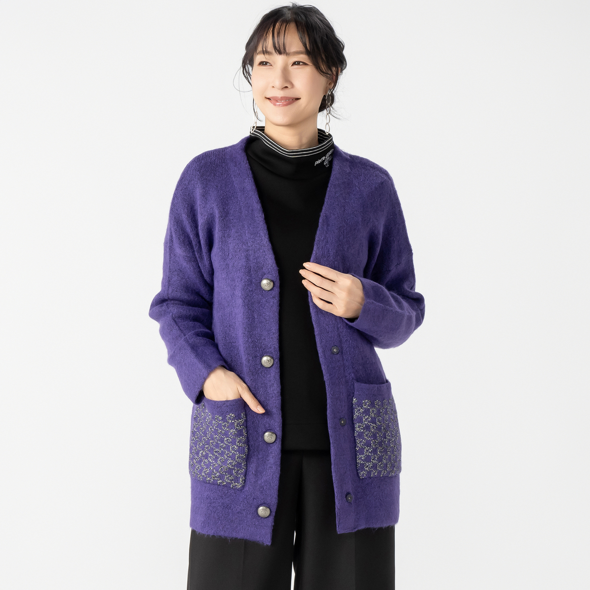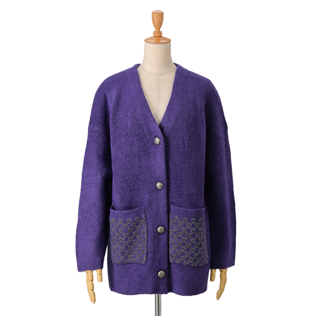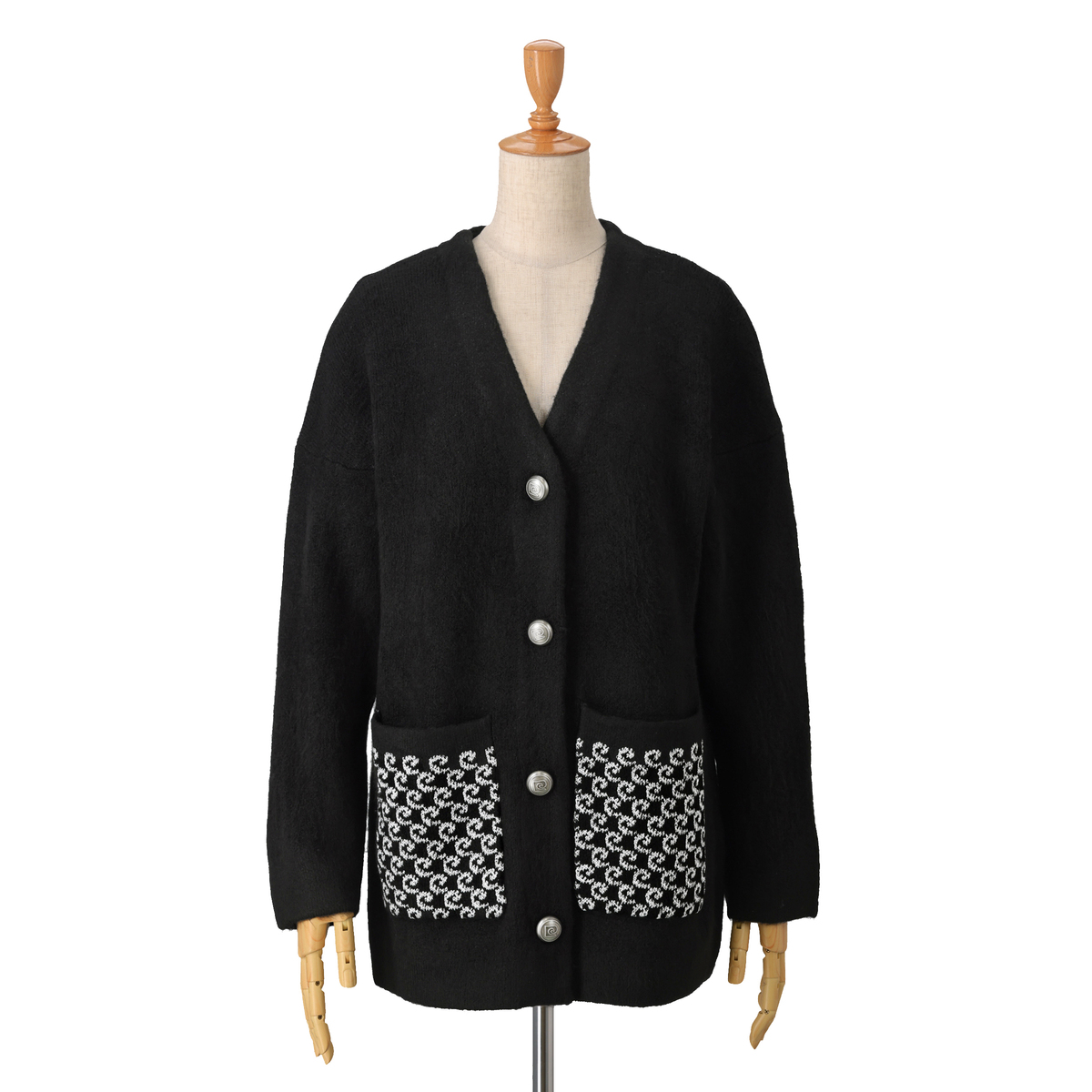 暖かみのあるブークレニット素材を贅沢に使用したVネックカーディガン。ポケットにはラメ糸を使ったブランドロゴのジャカード編みを施し、華やかさをプラスしています