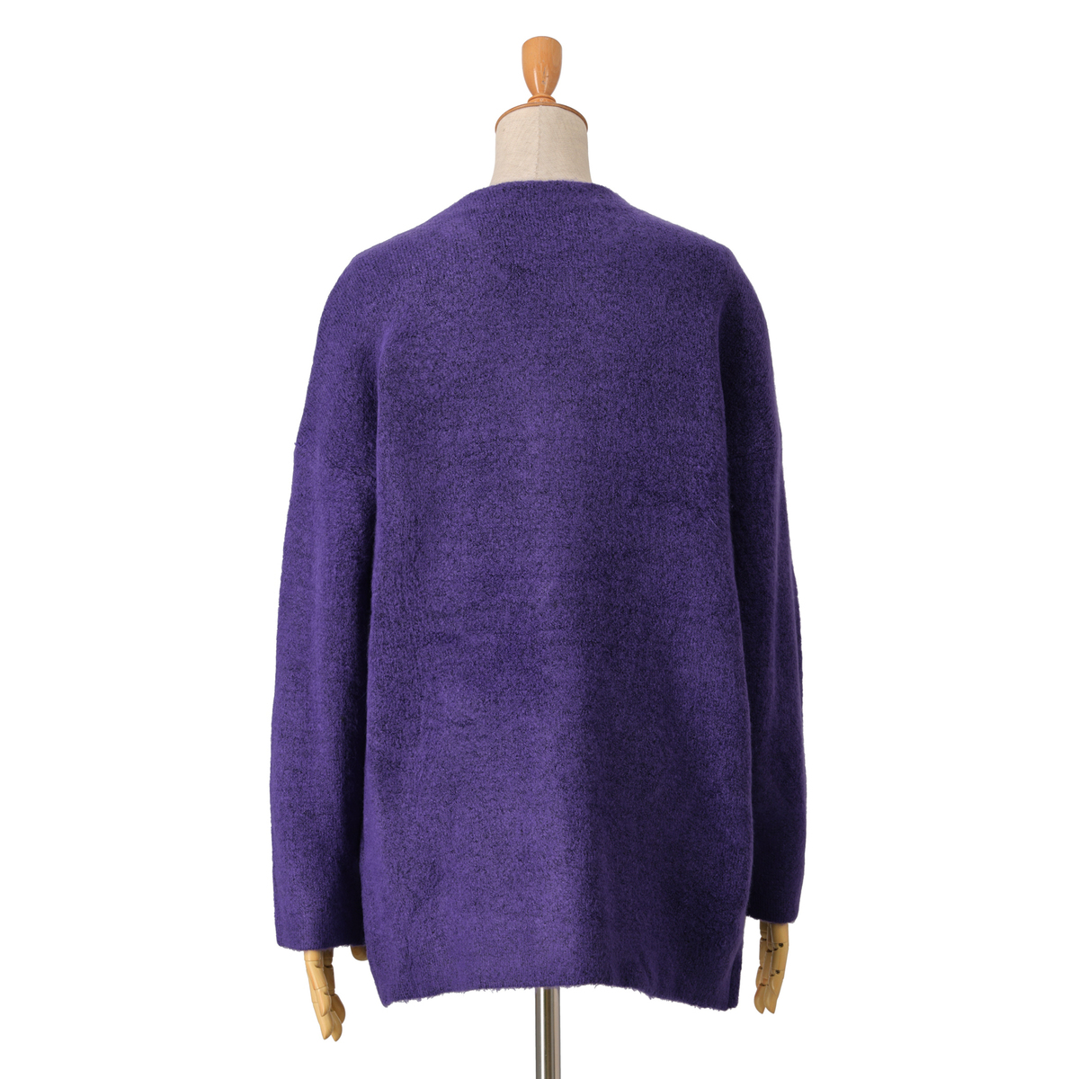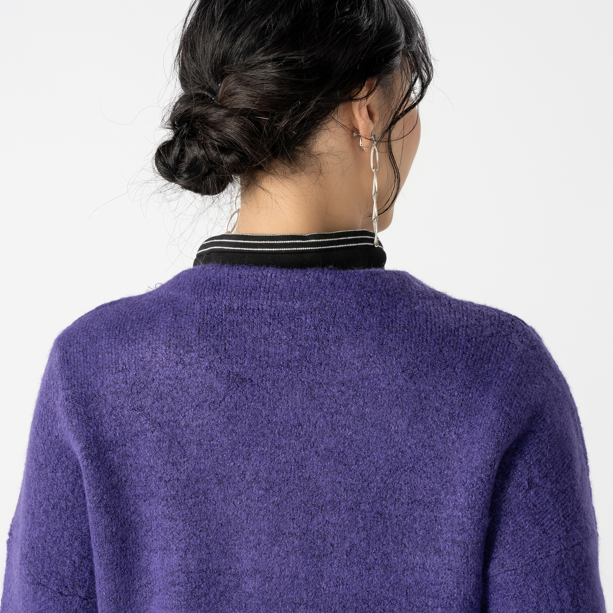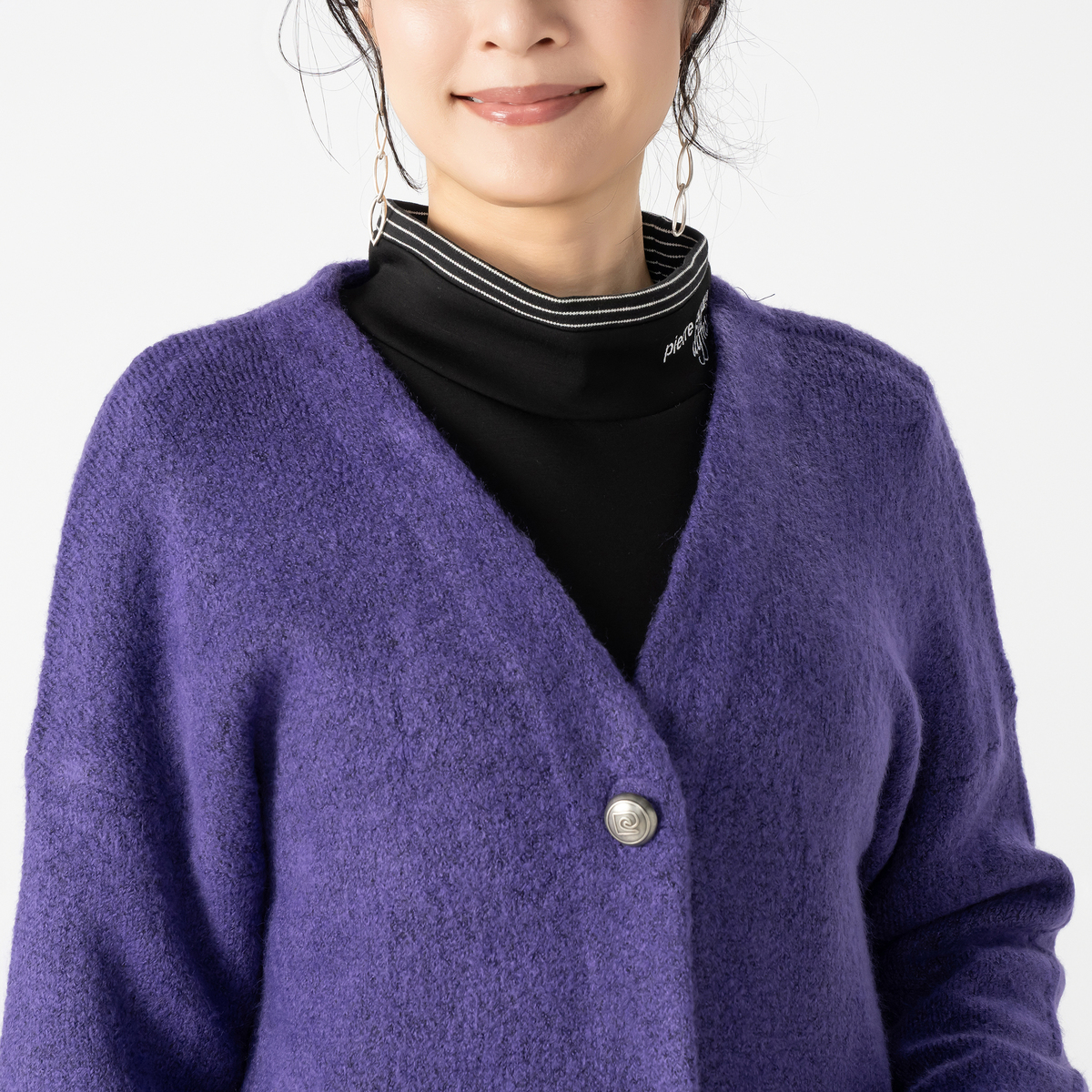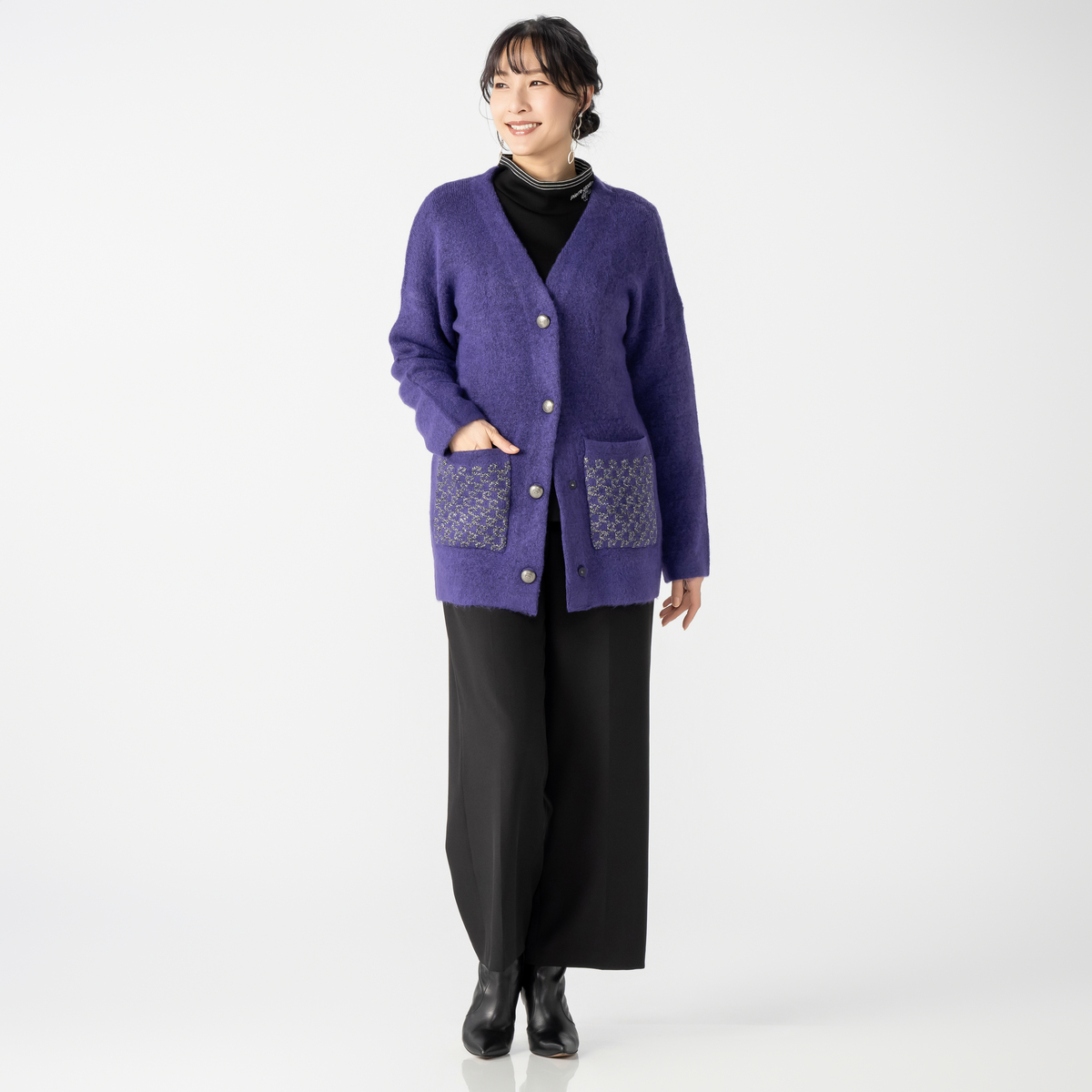 暖かみのあるブークレニット素材を贅沢に使用したVネックカーディガン。ポケットにはラメ糸を使ったブランドロゴのジャカード編みを施し、華やかさをプラスしています