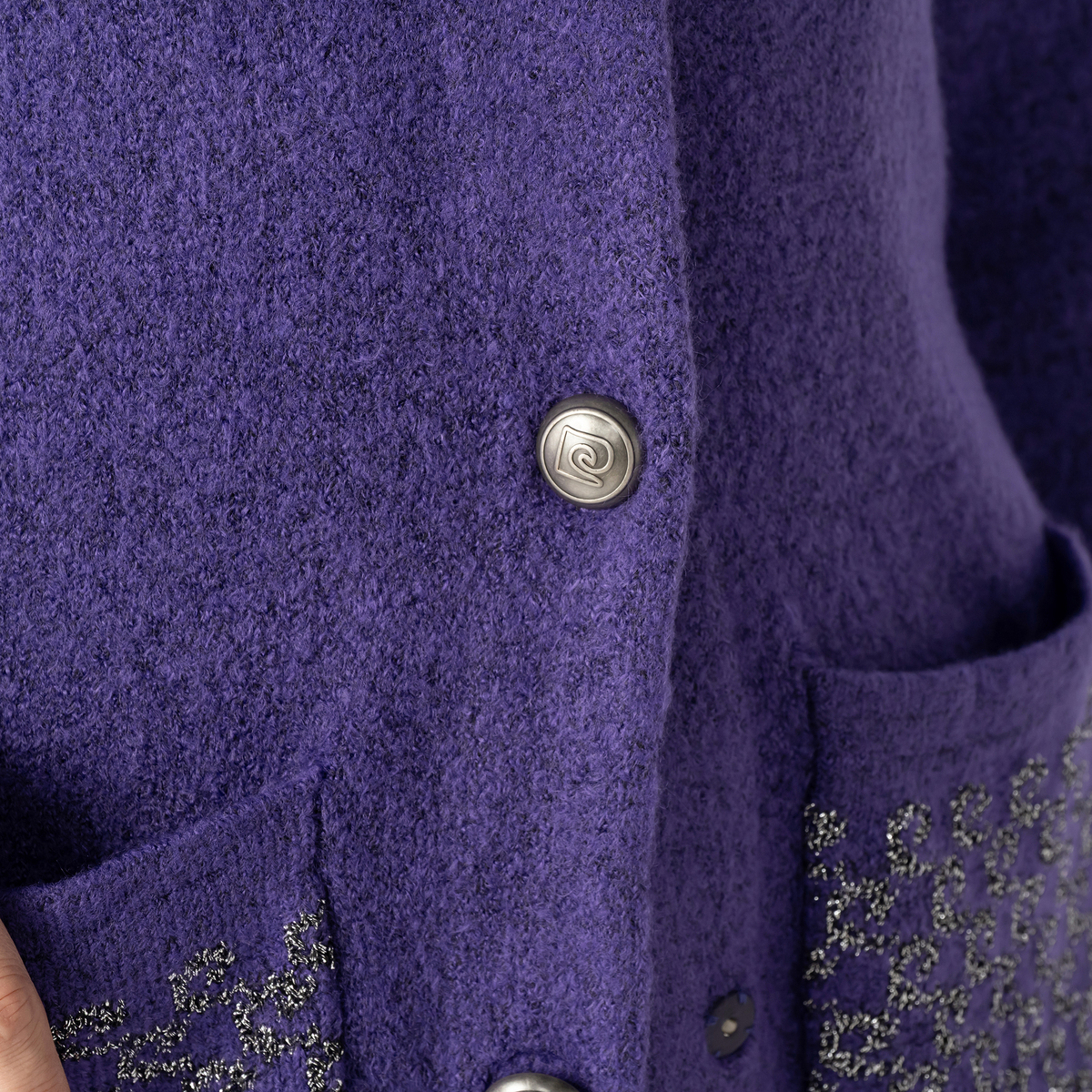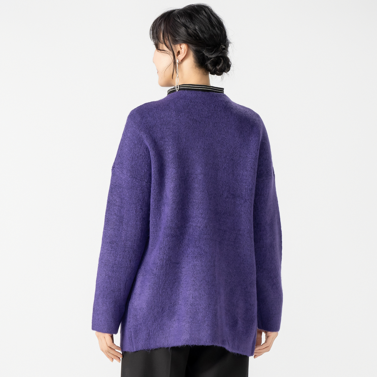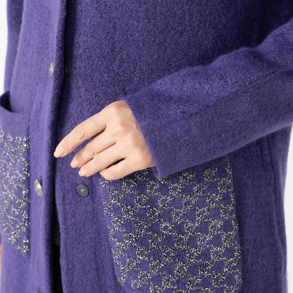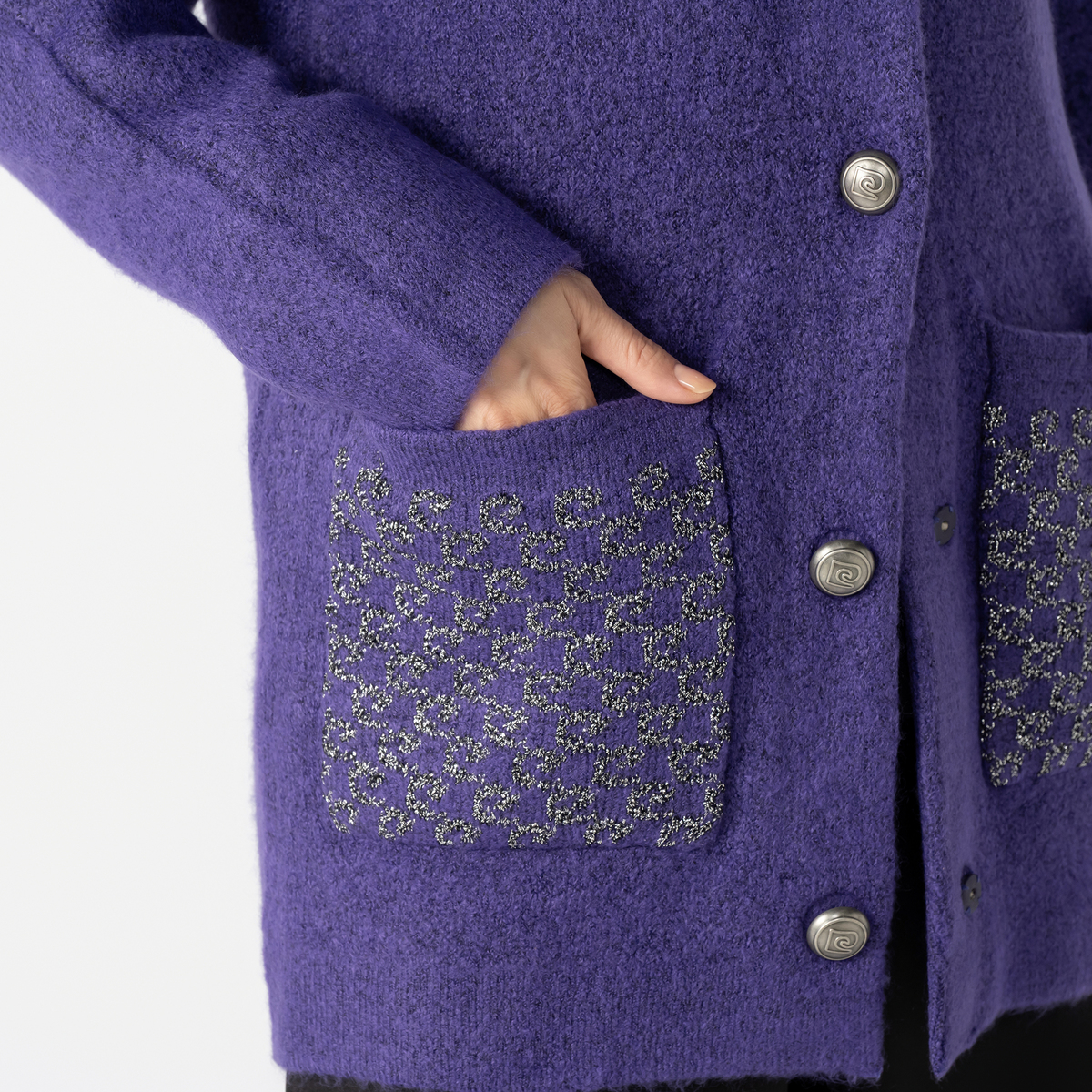 暖かみのあるブークレニット素材を贅沢に使用したVネックカーディガン。ポケットにはラメ糸を使ったブランドロゴのジャカード編みを施し、華やかさをプラスしています