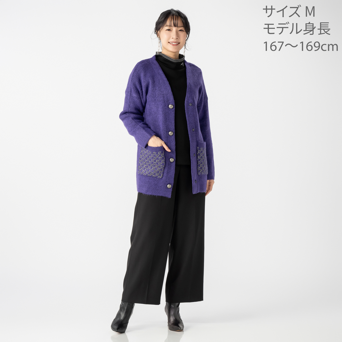 [商品寸法(ヌード)cm] サイズ バスト 着丈 S : 94(72〜80) 67 M : 100(79〜87) 67 L : 105(86〜94) 68 LL : 110(93〜101) 69 3L : 118(100〜108) 70 サイズ 裄丈 S : 71.5 M : 72 L : 72.5 LL : 73 3L : 73.5 [素材] アクリル60%、ポリエステル30%、ポリウレタン5%、ナイロン5% [お手入れ] 洗濯機洗い可 [注意事項] ※商品寸法の誤差は多少発生します。ご了承下さい ※蛍光増白剤入り洗剤を使用しないで下さい ※もみ洗いはお避け下さい ※洗濯後はすぐに脱水し、形を整えて干して下さい。長時間水につけたままにしないで下さい ※洗濯の際は裏返しにし、洗濯ネットを使用して下さい ※生地組織の特性から糸の浮いている部分があります。引っ掛かりにはご注意下さい ※デリケートな素材を使用していますので、爪やアクセサリーなどの引っ掛かりによりキズがつきやすくなっております。縫目や生地を強く引っ張らないよう注意して下さい ※素材の特性上、着用や洗濯・クリーニング時の摩擦により毛羽立ち、毛玉が発生します。その際はお早めに毛玉取り器等で手入れをして下さい ※アイロンの際は、あて布をご使用下さい ※染色の性質上、洗濯すると色落ちする事があります。淡色や白物と組み合わせての着用や洗濯はお避け下さい ※着用中の摩擦により他の衣料やバッグ、椅子等に色移りすることがあります。淡色・白の製品と組み合わせての着用や洗濯はお避け下さい ※また、雨や汗等で濡れた状態で着用すると色移りすることがあります。その際はお早めに洗濯をして下さい ※過度な引っ張りを受けると縫い目が開くことがありますので、取り扱いには注意して下さい ※ボタン、ホックの付いているものはボタン、ホックにアイロンを当てないで下さい ※洗濯後は重ね置きしないで下さい ※繊維の特性上、着用条件により繊維の先端が肌を刺激することがありますので、ご注意ください ※ドライクリーニング後、ビニールに入った状態で保管されたり、2種類以上の防虫剤を併用するとスリット糸(ラメ糸)部分の変色の原因となることがありますのでお避けください ※製品によっては、柄の出方が異なることがありますのでご了承下さい 【中国製】