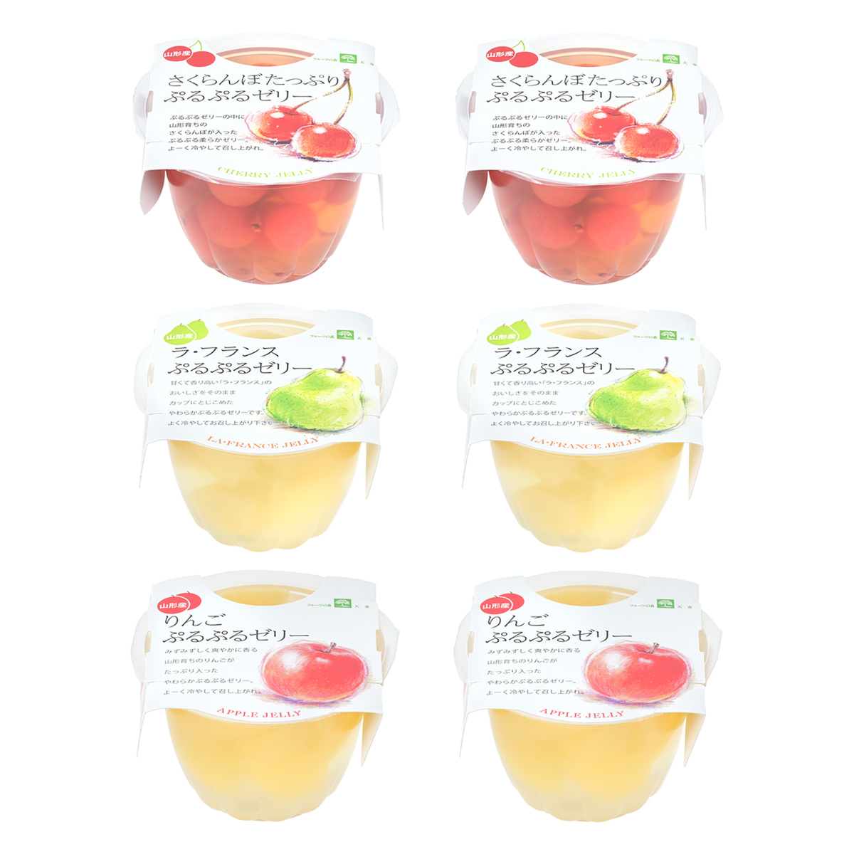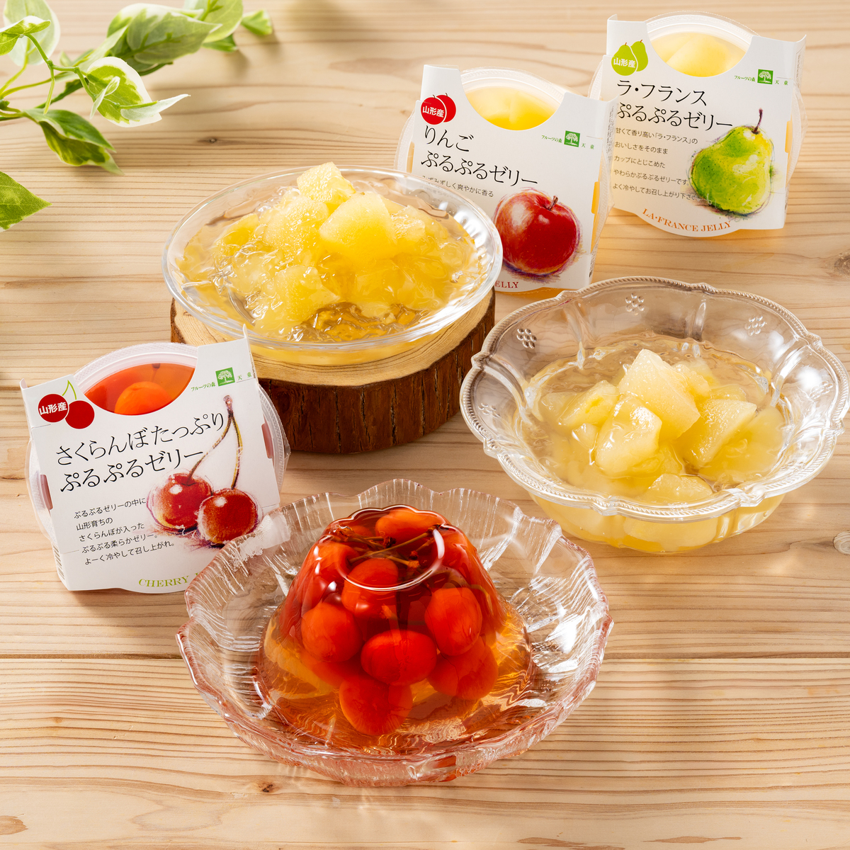 山形県産の3種の果物を使ったぷるぷる食感のゼリー。さくらんぼ、ラ・フランス、りんごの3つの味をセットにしました