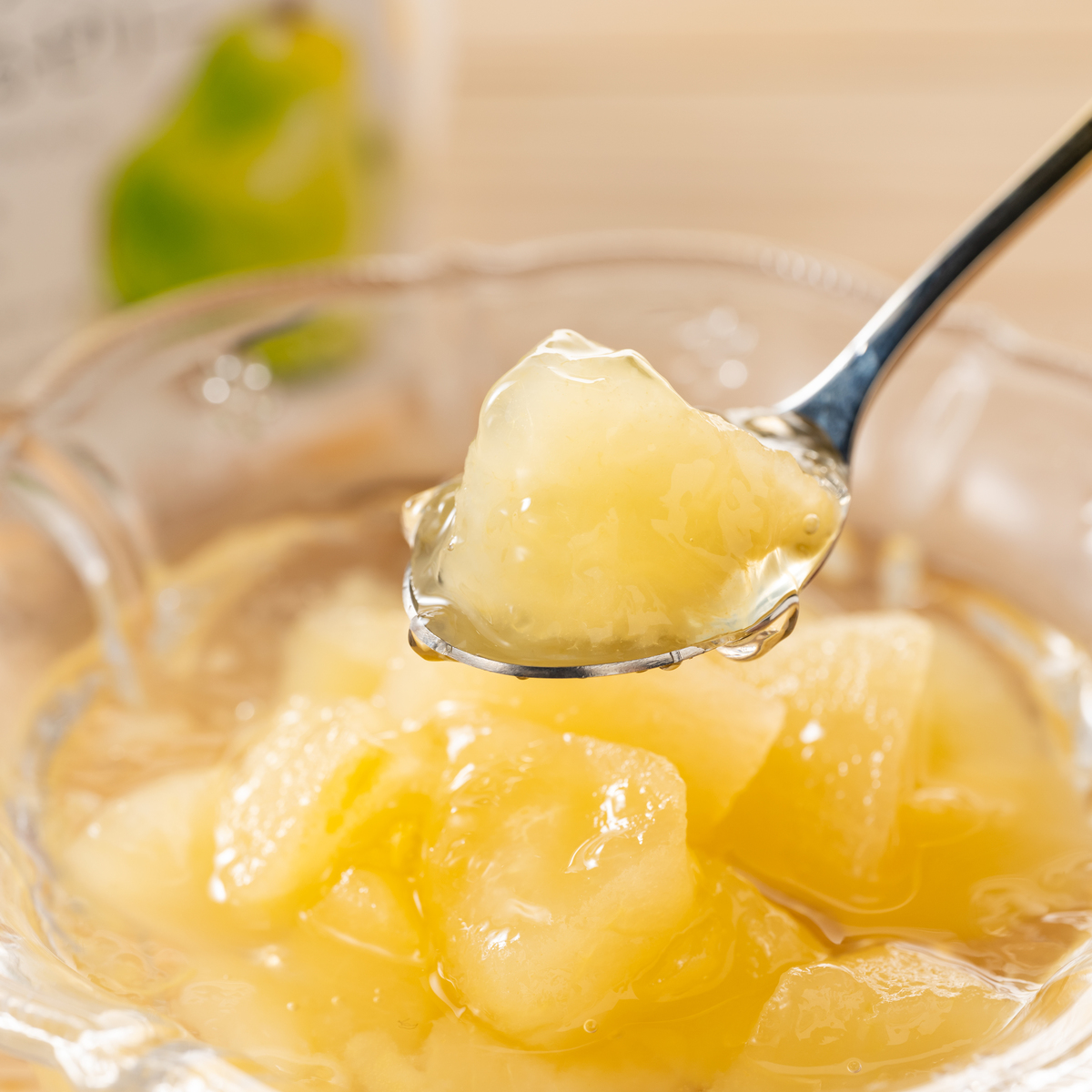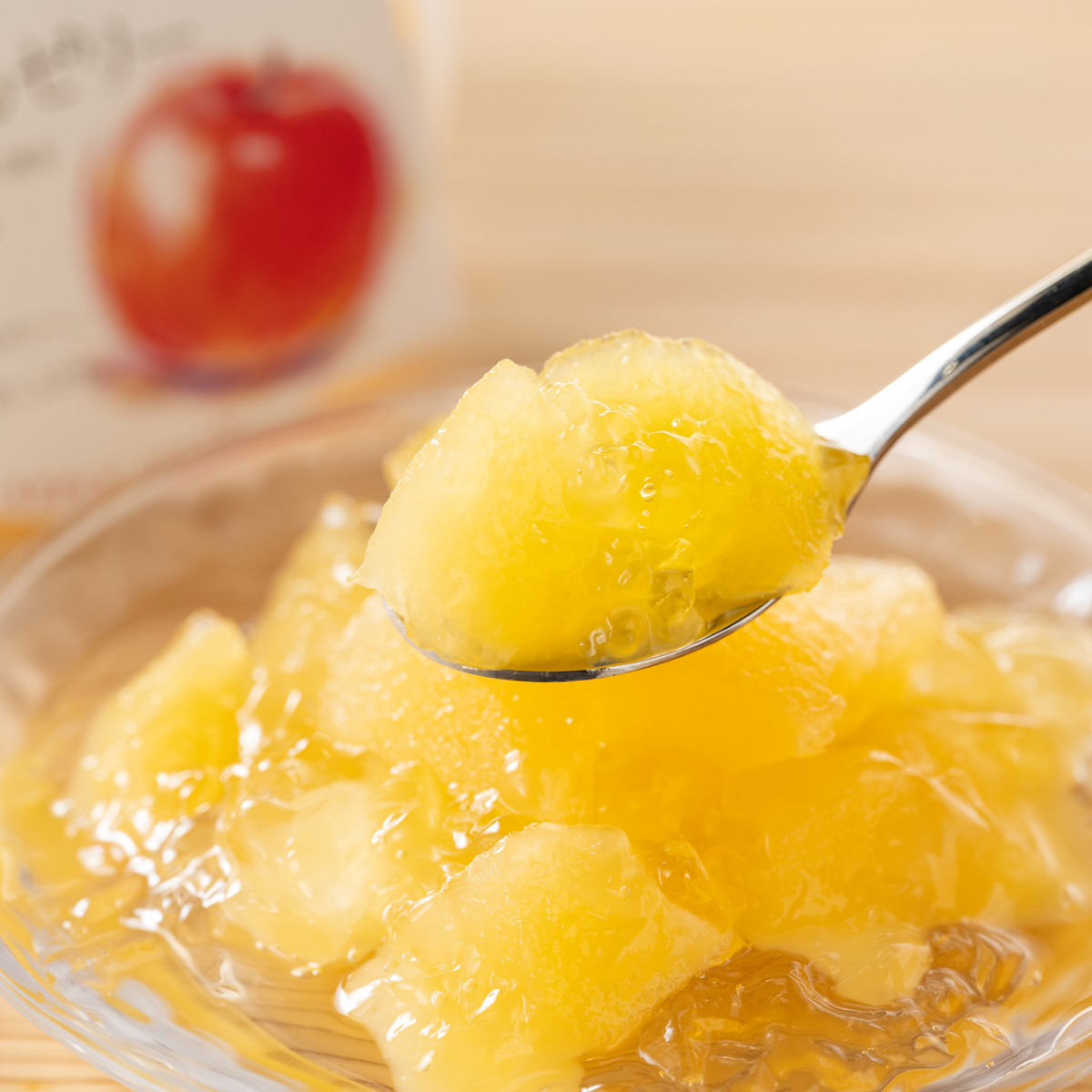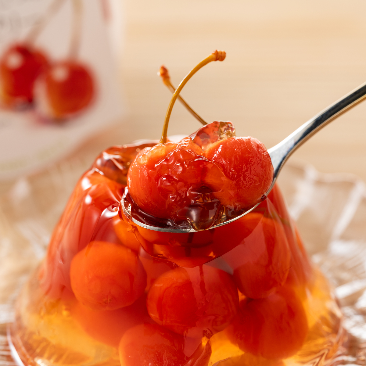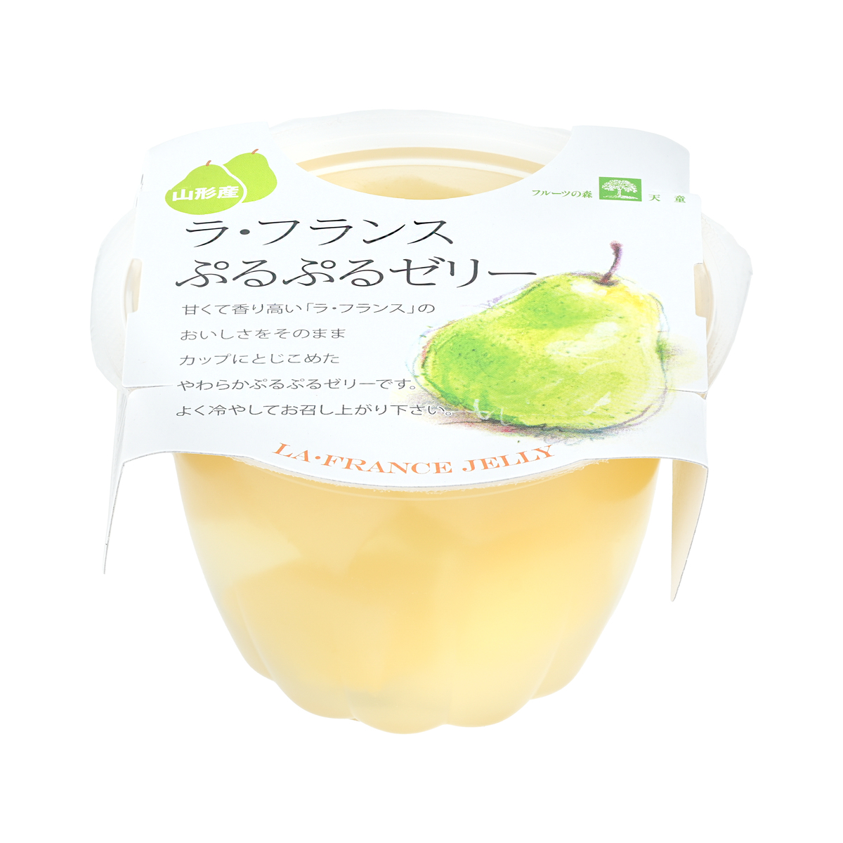 山形を代表するフルーツを「1年中楽しむ事はできないものか」という思いから生まれた商品。内容量240gのうち、ラ・フランスとりんごは約90g、さくらんぼは約79gが果物で、食べ応えのあるゼリーです