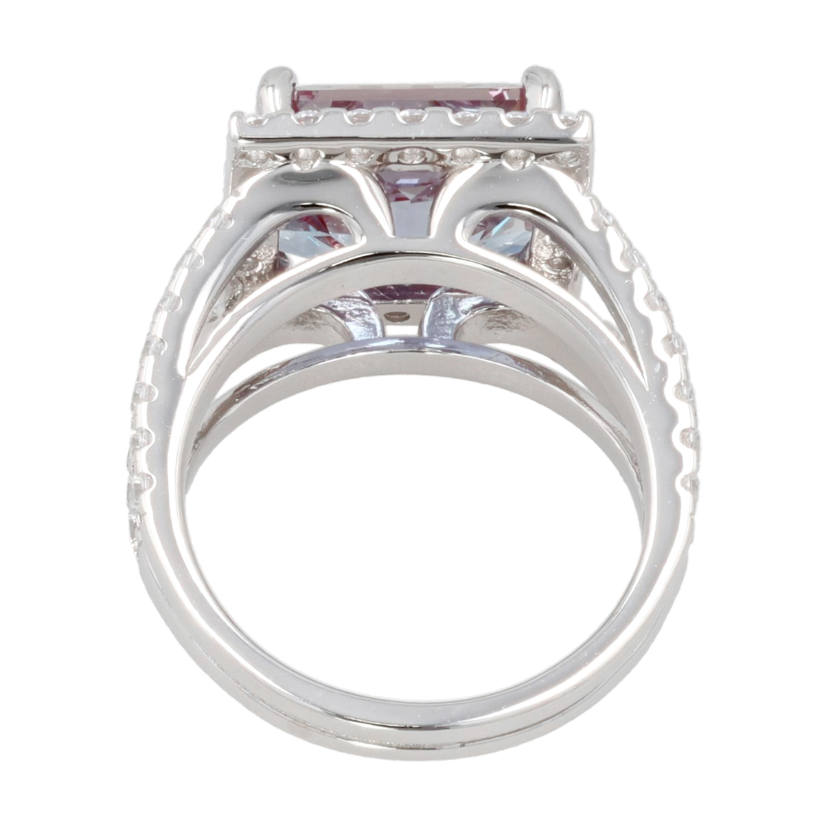 大粒のシンセティックアレキサンドライトをあしらったリング。2本に分かれたラインにキュービックジルコニアをあしらい、メインストーンを引き立てています