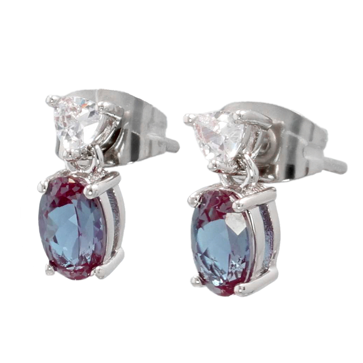 シンセティックアレキサンドライトの魅力をにお楽しみいただける、シンプルなデザインのイヤリングまたはピアスです。シンプルながらもキュービックジルコニアがシンセティックアレキサンドライトを際立たせます