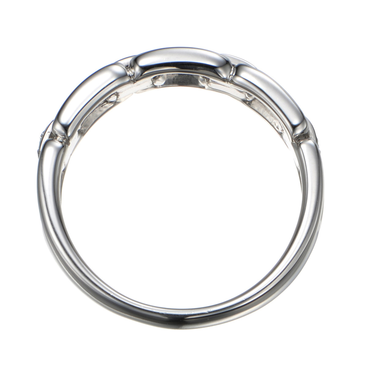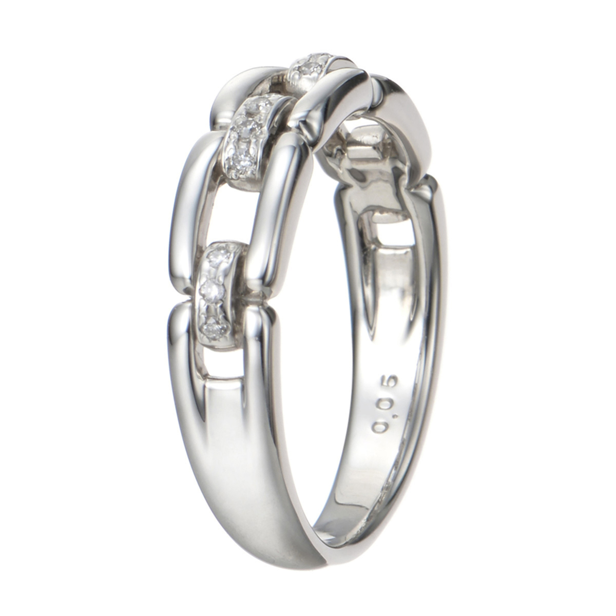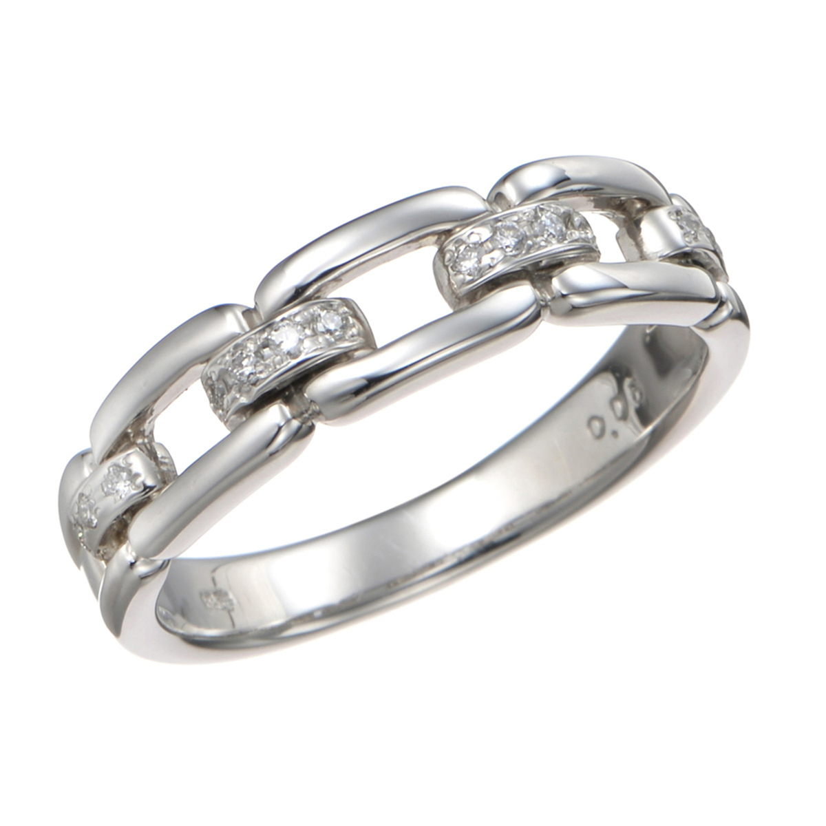 チェーンモチーフのスタイリッシュなリング。本物のチェーンを思わせる、立体的なデザインです。ポイントごとに配置されたダイヤモンドが純プラチナの光沢感と相まった、上品な仕上がりです