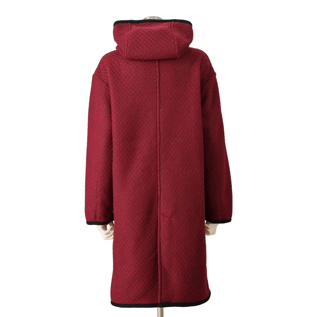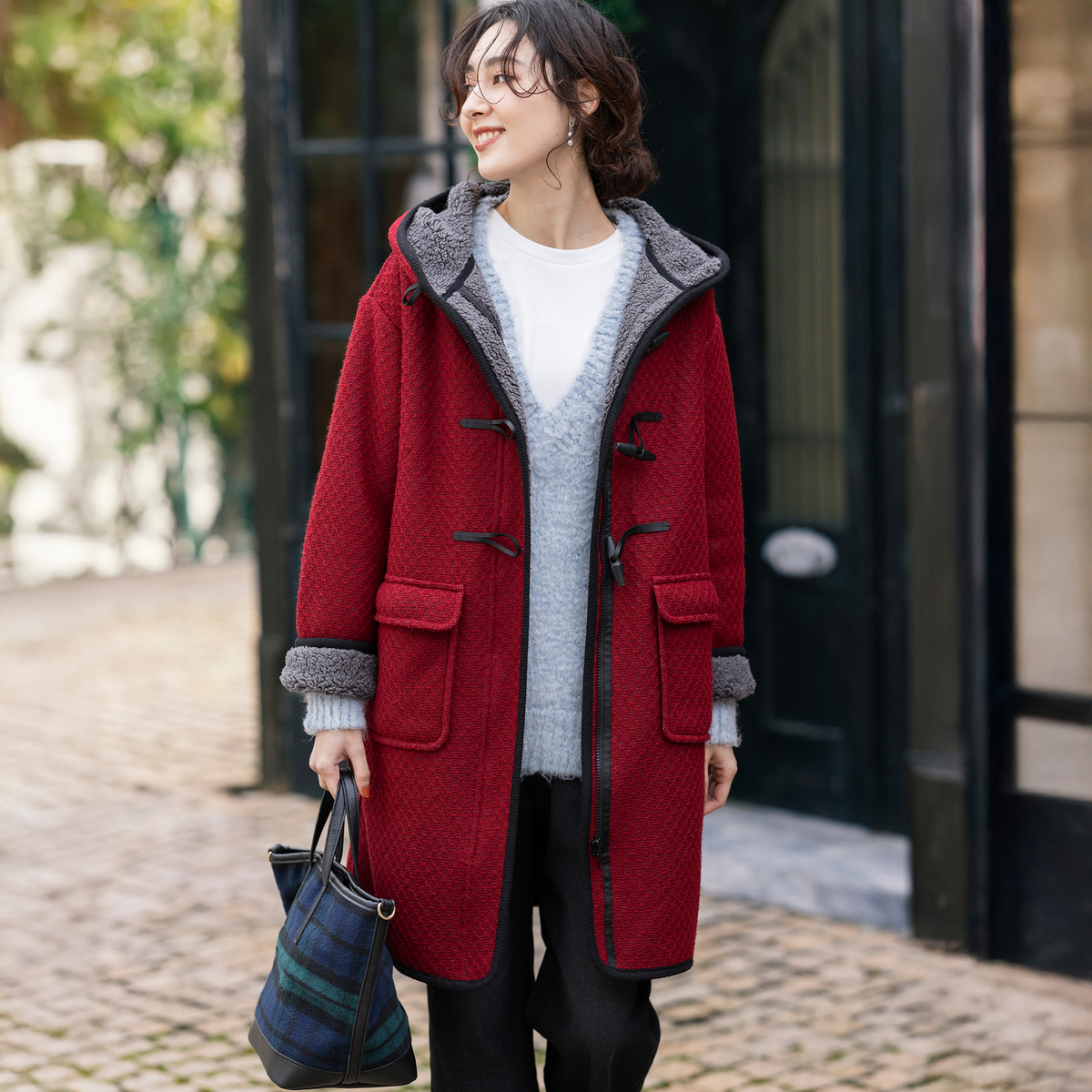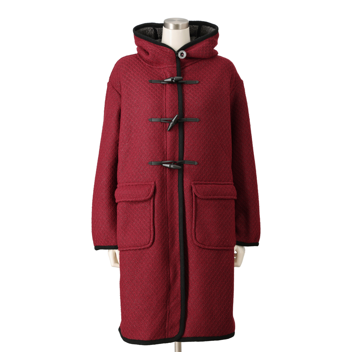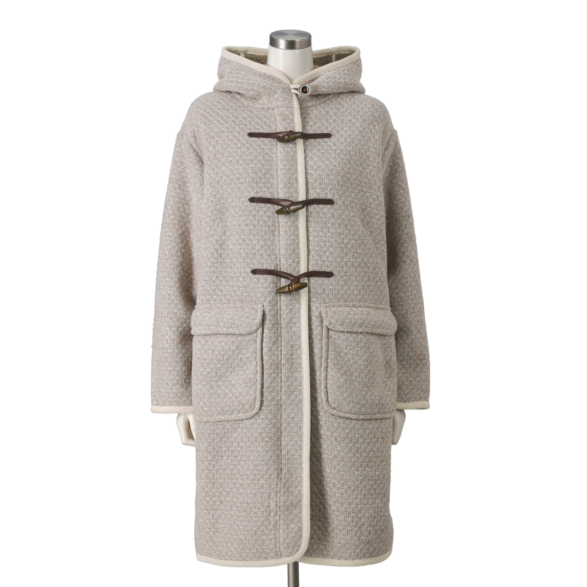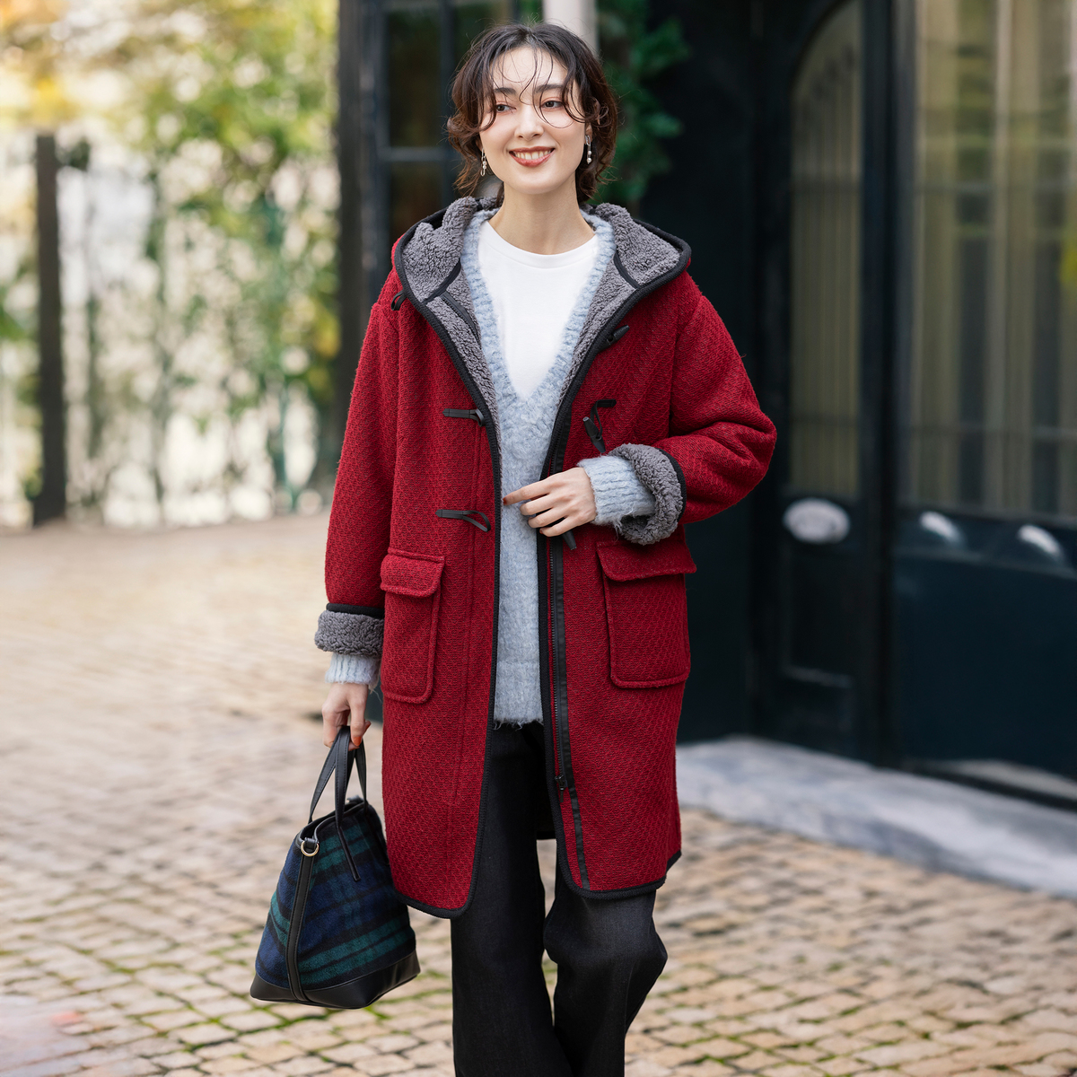 ジャガードニットのダイヤ柄とふわふわのボアを組合せた生地を使い、裏地なしの一枚仕立てで仕上げたダッフルコート。防寒性とおしゃれを両立しながら、ミドル丈でも軽やかに着こなせます