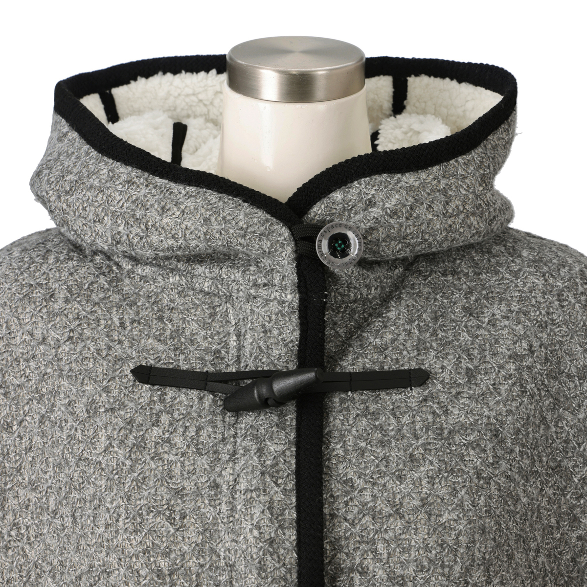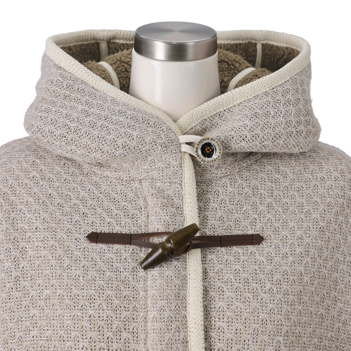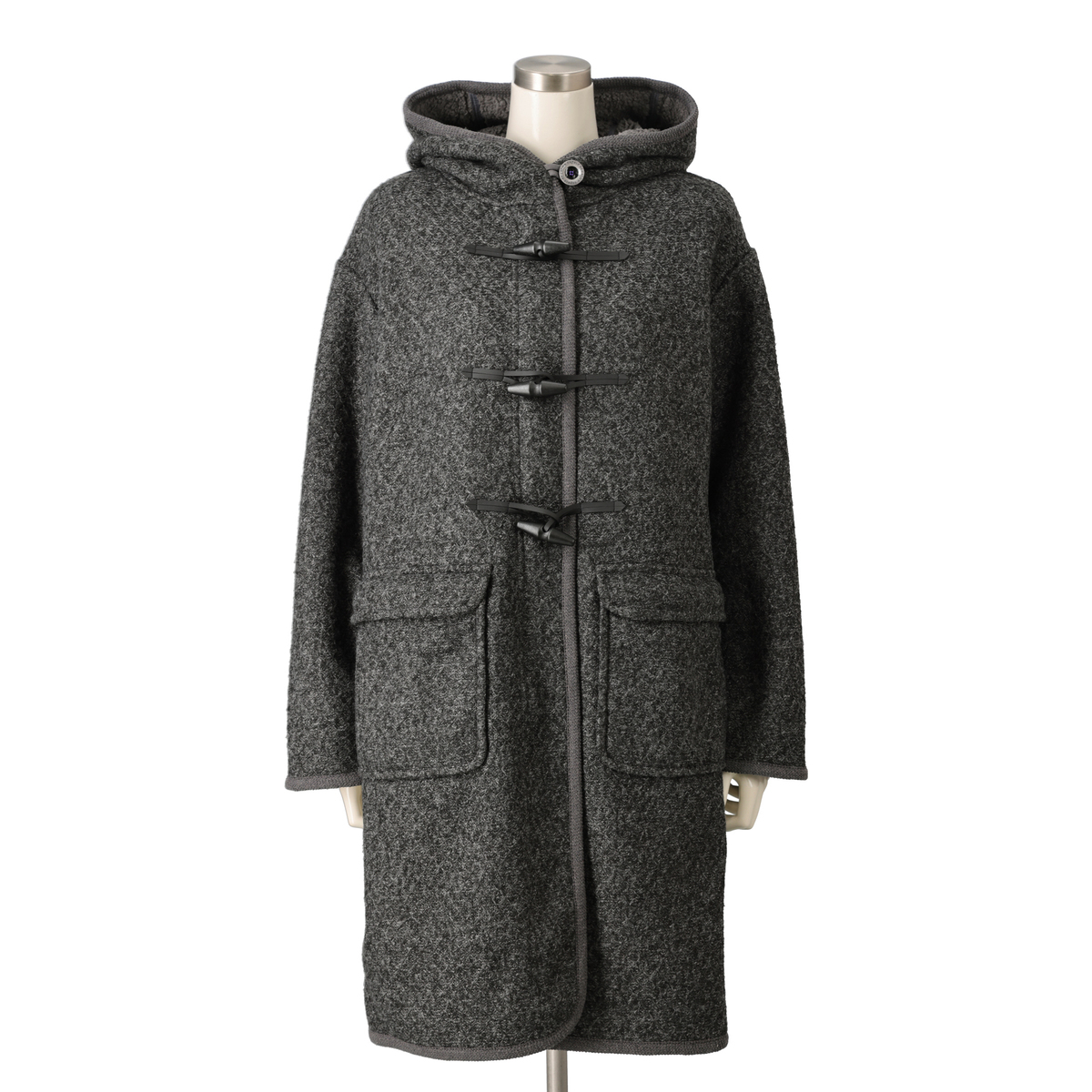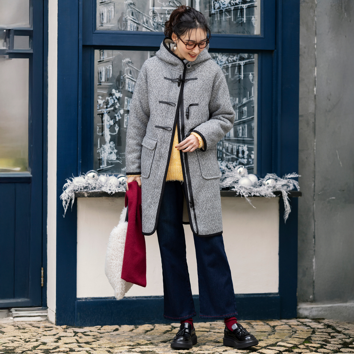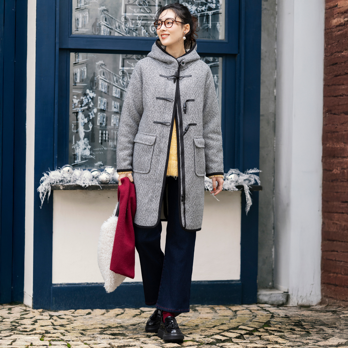 ジャガードニットのダイヤ柄とふわふわのボアを組合せた生地を使い、裏地なしの一枚仕立てで仕上げたダッフルコート。防寒性とおしゃれを両立しながら、ミドル丈でも軽やかに着こなせます