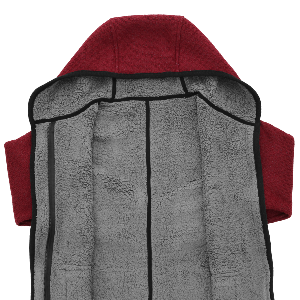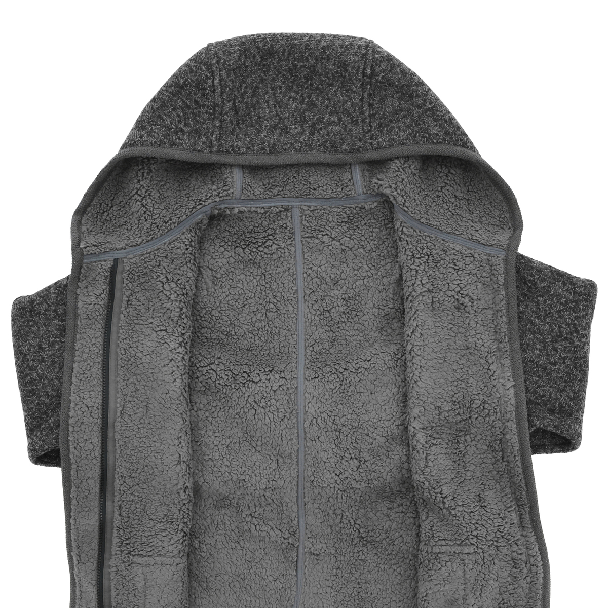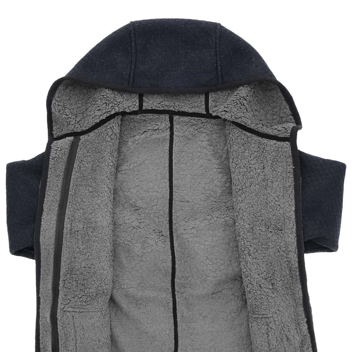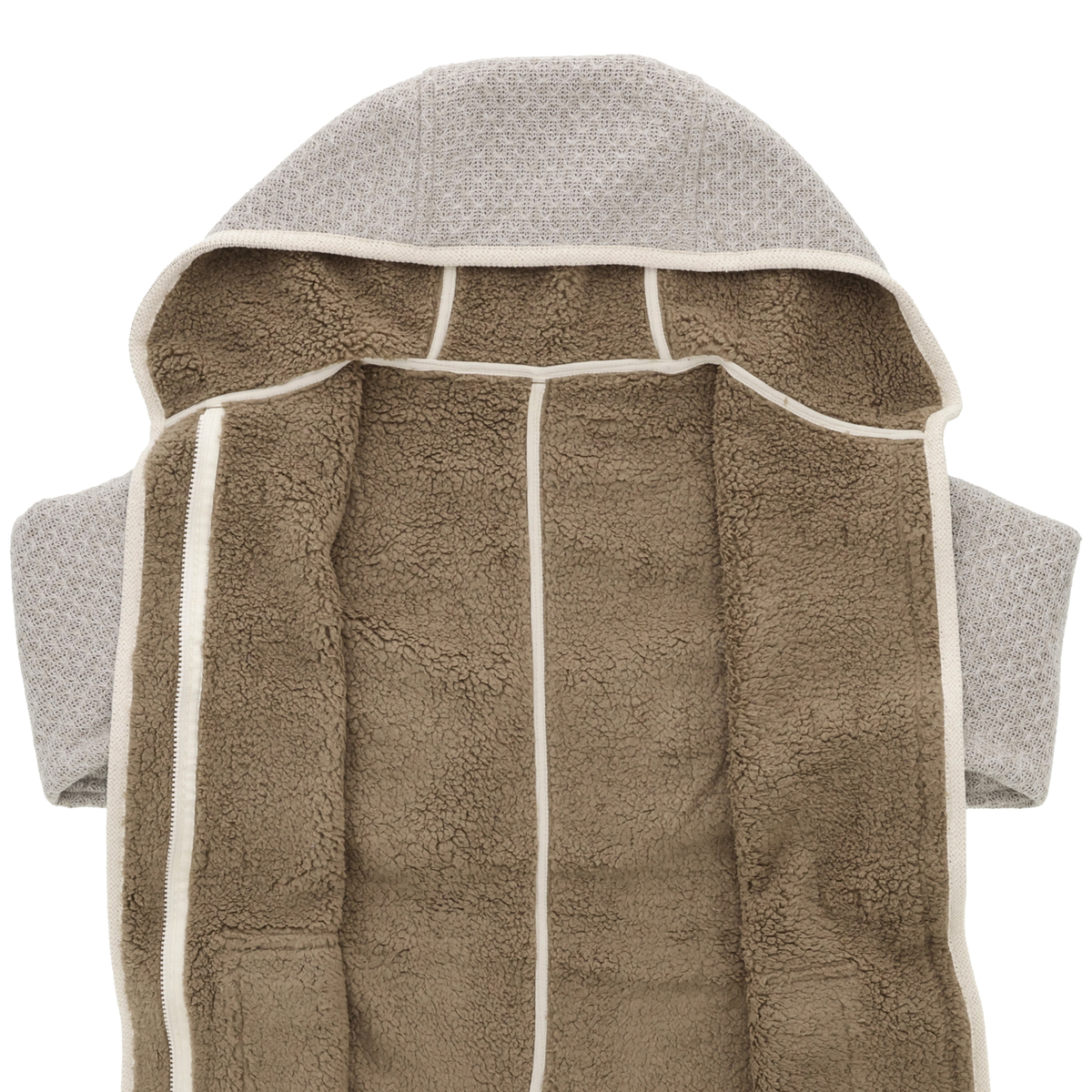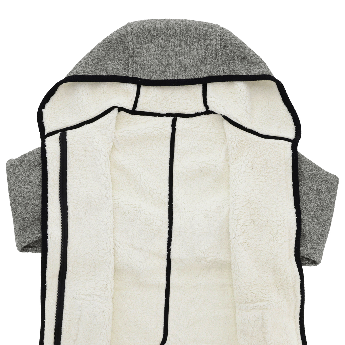 後ろ肩や袖口、胸にダーツを施し、体に馴染む立体パターンに。裾にはベンツを施し、歩きやすさも考えた設計です。前端からフード、裾、袖口にはボリューム感のあるニットテープでトリミングしました