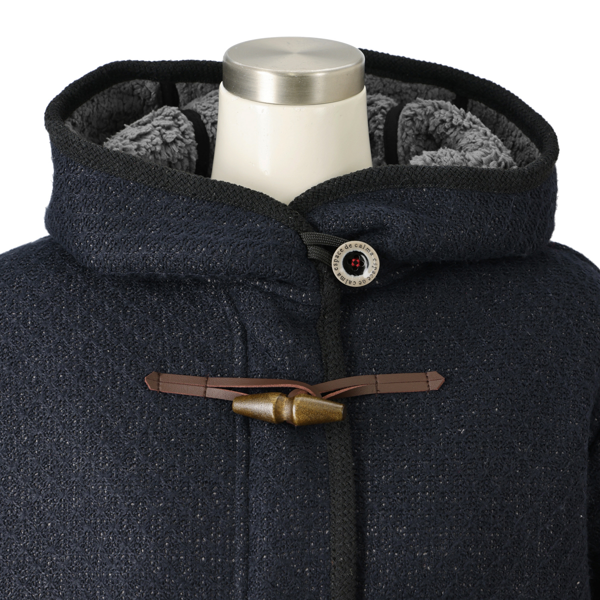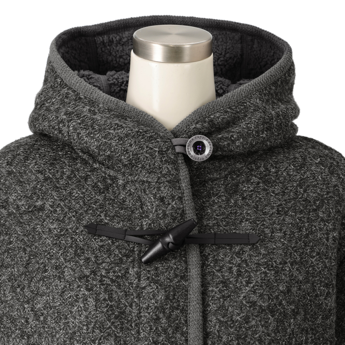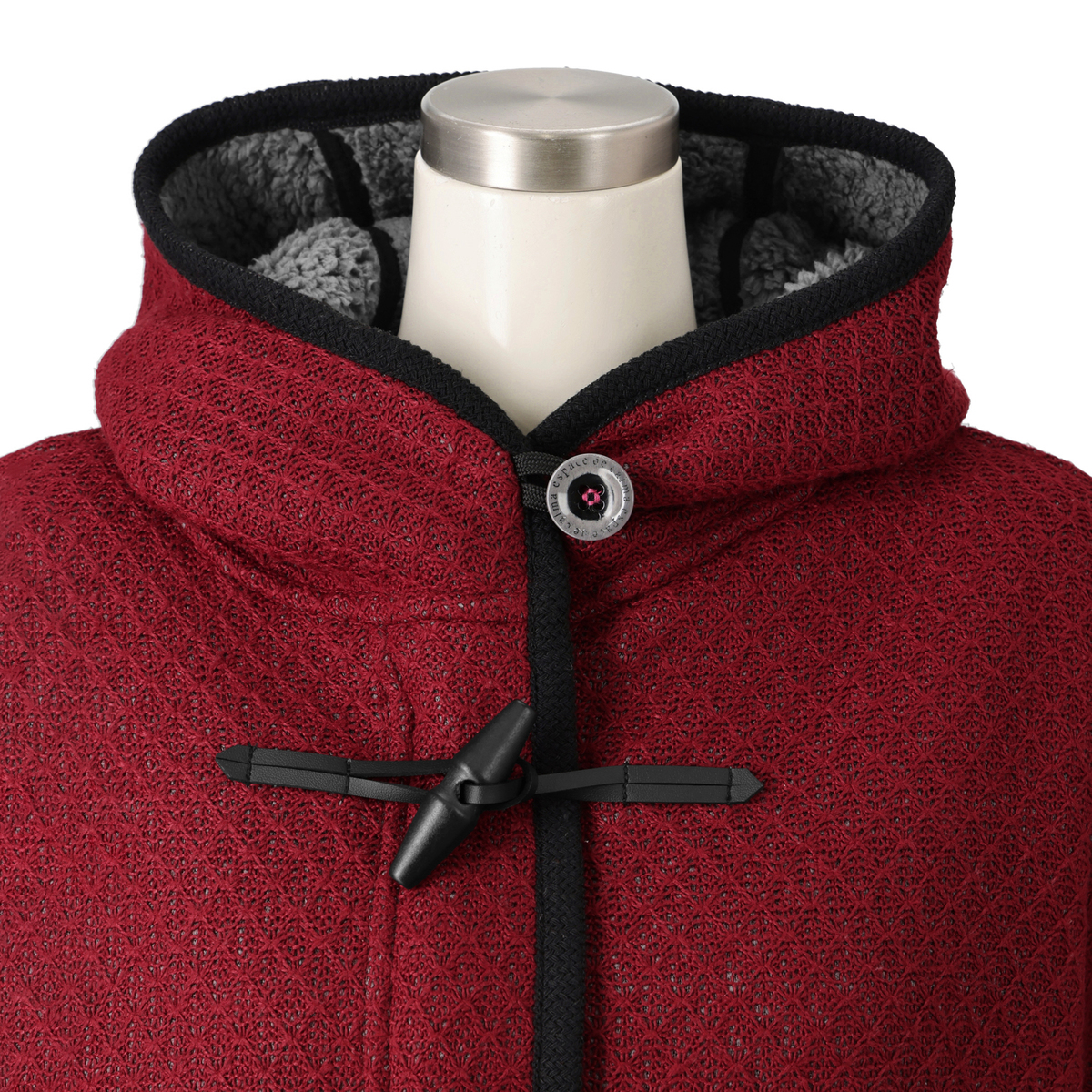 フードは顔まわりを立体的に見せるパターンで、被っていない時の小顔効果も発揮。前中心はファスナーと手袋をしたままでも留められるトグルボタン使いです。配色のボタン付け糸やブランドロゴ入りボタンもアクセントになっています