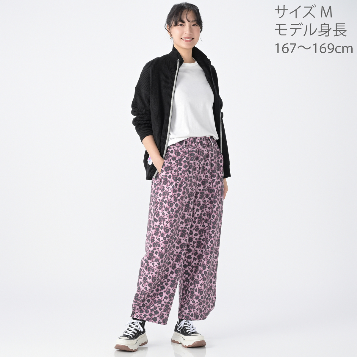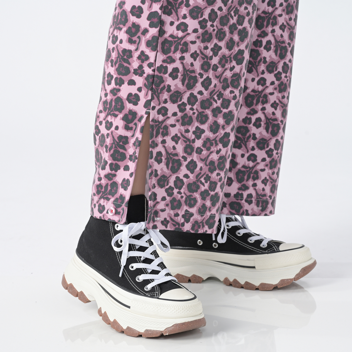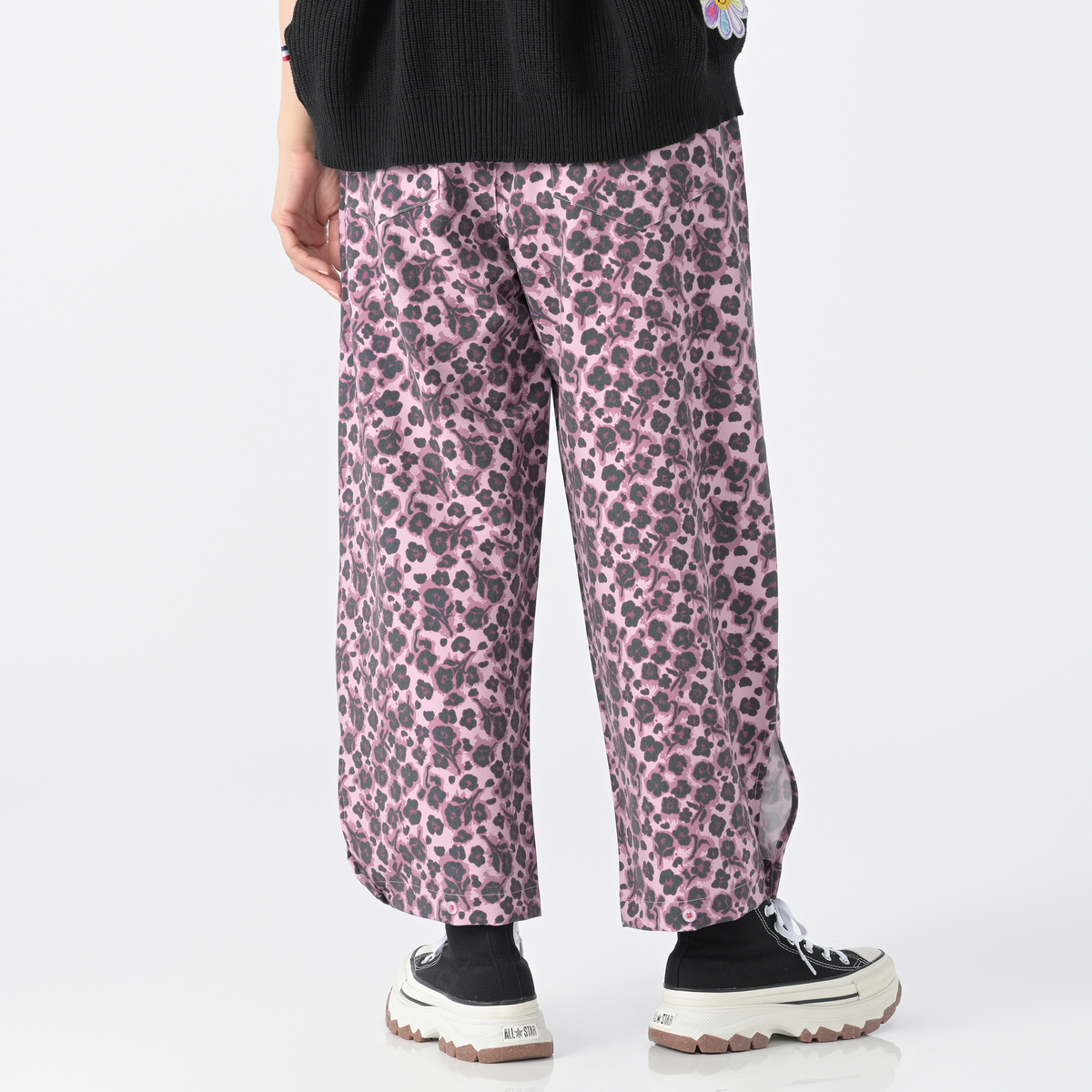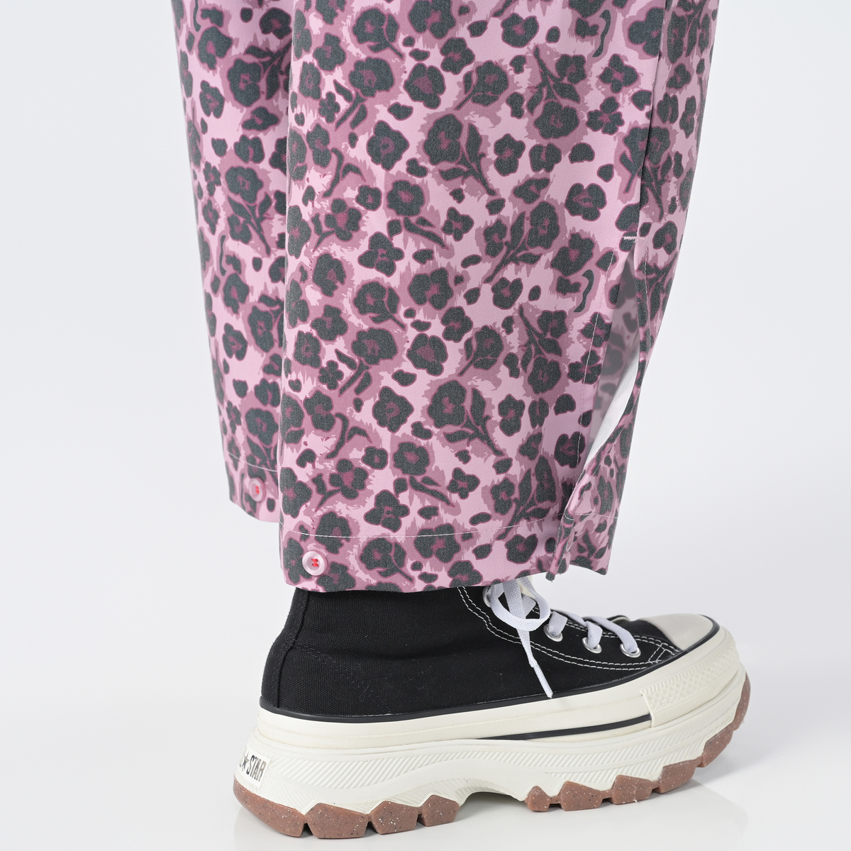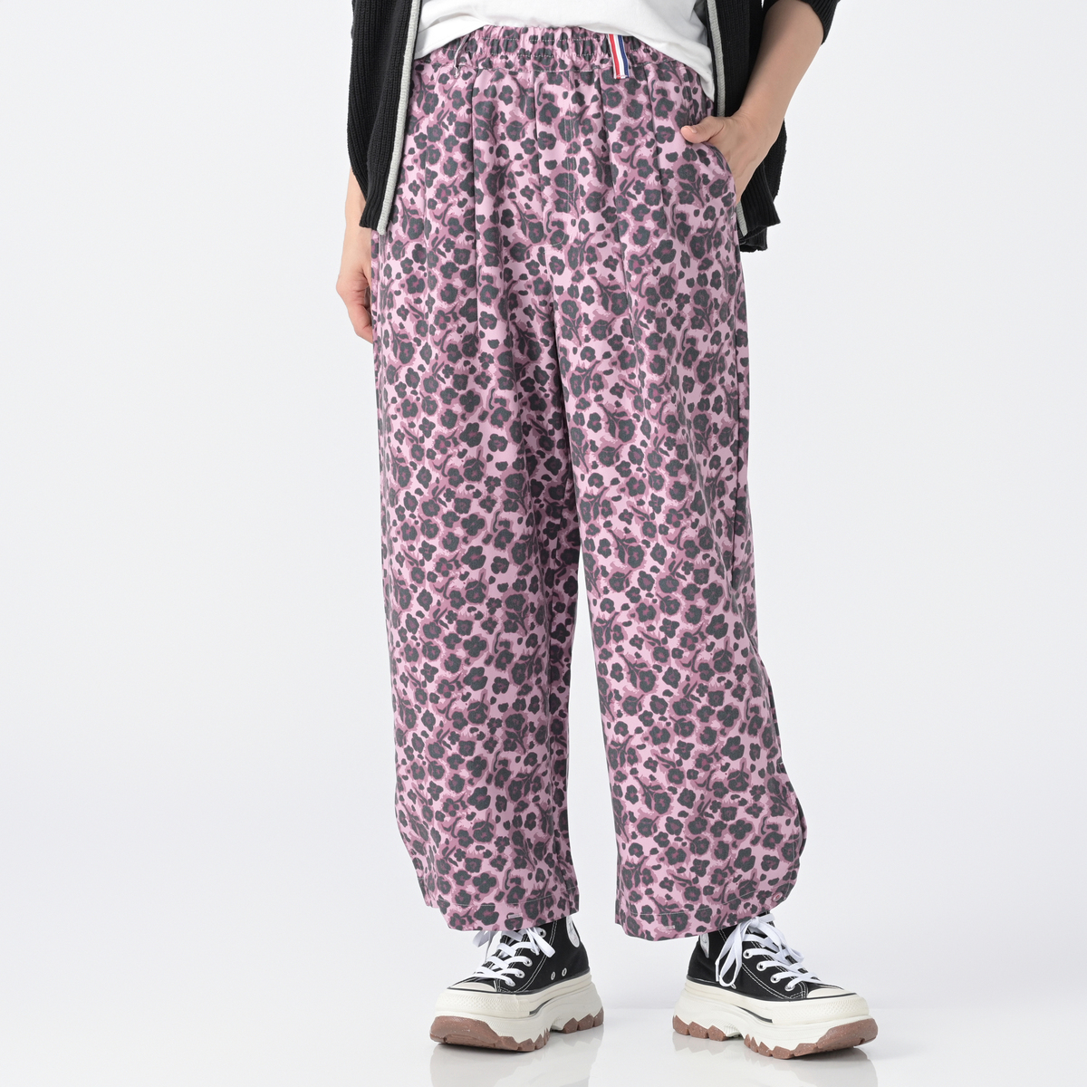 アニマル風の花柄が可愛くて、コーデの主役になります。 薄手ですが、冬はタイツ合わせで暖かく使えそうです。個人的にオールシーズン使える商品はありがたいです。 足首の調整ボタンが便利で、シューズに合わせてシルエットを変えられます。 着るたびにテンションが上がる、そんなパンツです。