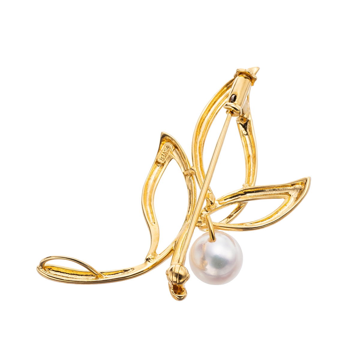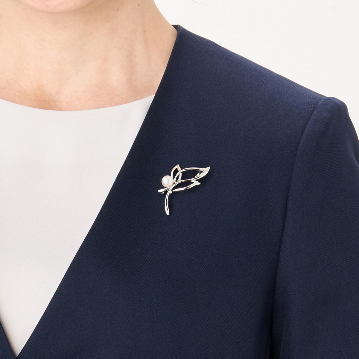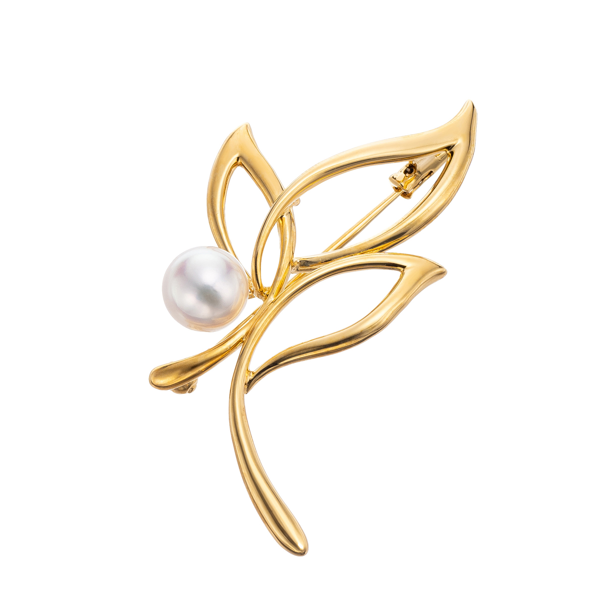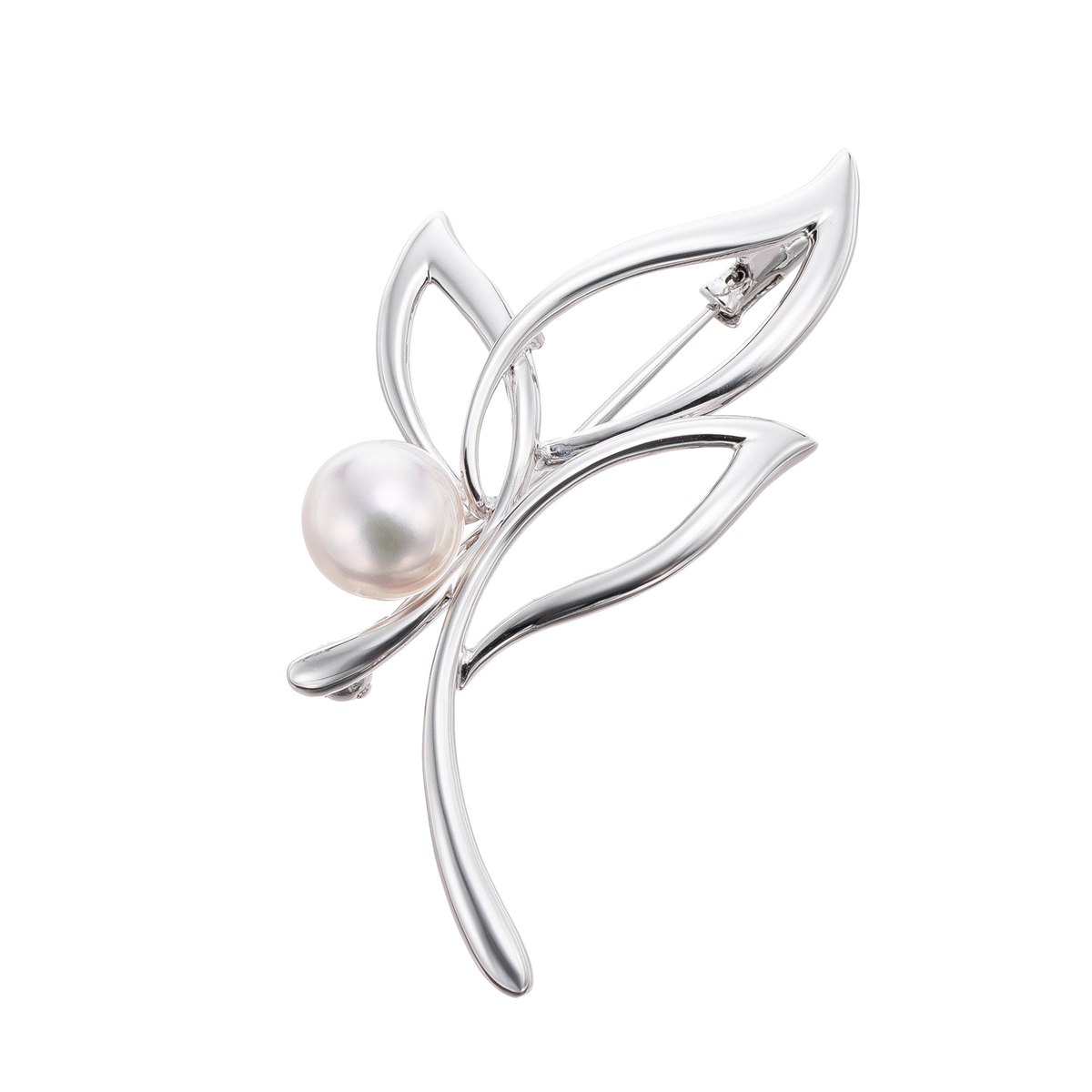 テリの美しいアコヤ真珠をあしらったブローチです。アコヤ真珠の上品な光沢が、胸元やストールに優雅な印象を添えます