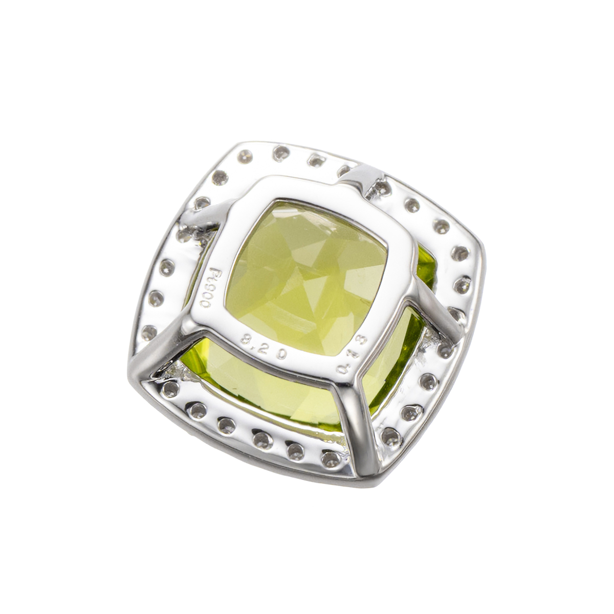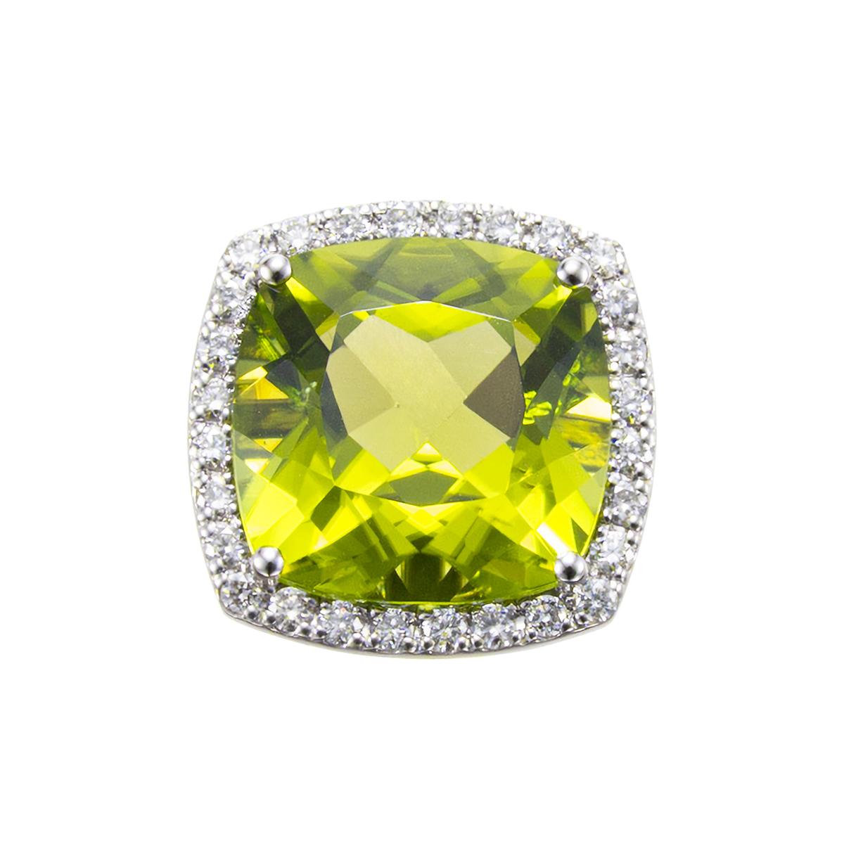 ペリドットをあしらったペンダントヘッド。3.0ctUP、クッションシェイプの石をセッティング。小粒のダイヤモンドで囲んで、可愛らしさと上品さを加えました