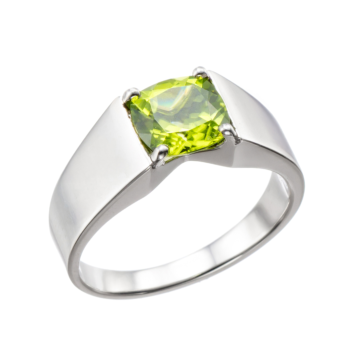 ペリドットをあしらったリング。1.5ctUP、クッションシェイプの石をセッティング。プラチナに爽やかなペリドット色合いが際立つデザインです