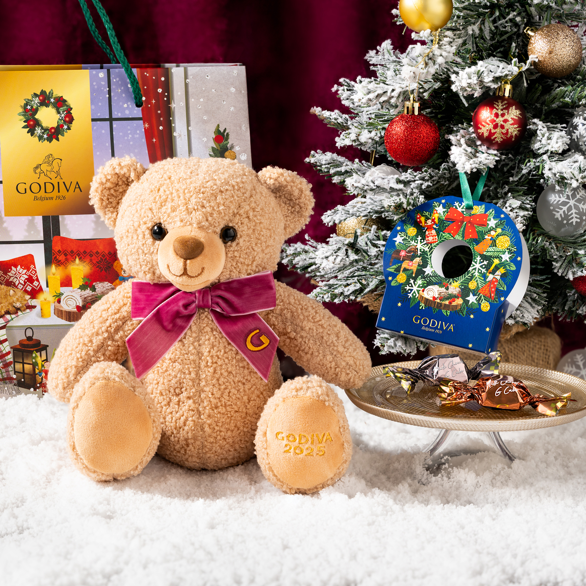 クリスマスの伝統的なブッシュドノエルをチョコレートで表現したコレクション。QVC限定カラーのピンクリボンがアクセントの限定ベアと、オーナメントパッケージのGキューブ2粒セット。贈り物や自分へのご褒美にぴったりです