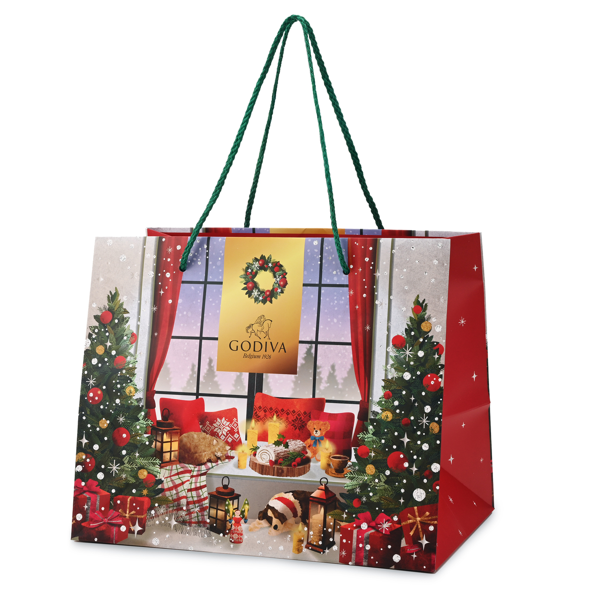 雪が舞い降る聖夜、クリスマスを祝う温かなひととき。ブッシュ ド ノエルを囲んで寛ぐペットたち、オーナメントで飾ったクリスマスツリーや美しいラッピングのギフトボックスをデザインしたショッパーです