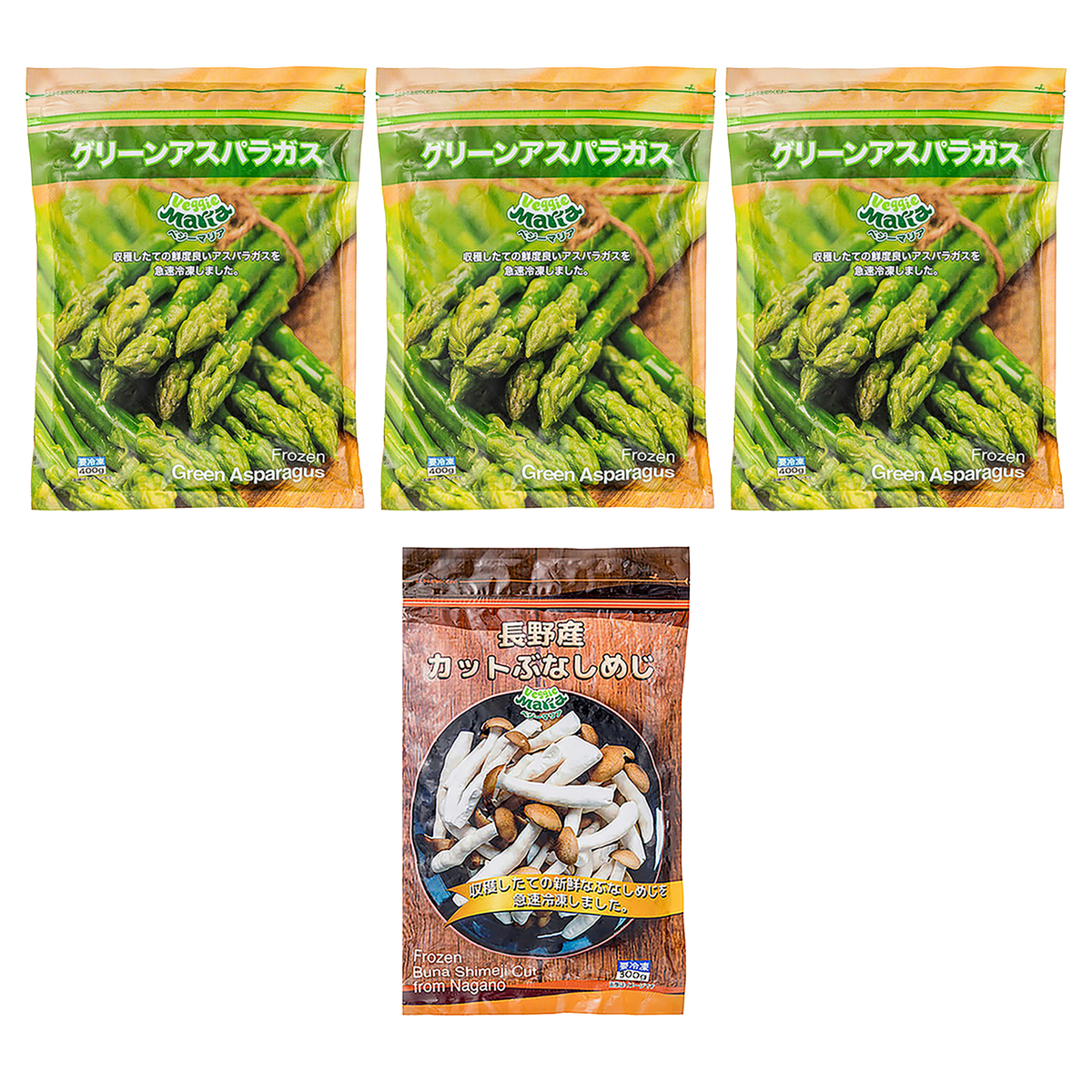 [アレルギー物質特定原材料8品目] なし [商品内容] ・アスパラ400g×3袋 ・ぶなしめじ300g×1袋 [保存方法] 開封前:冷凍庫に保管してください(ー18℃以下) 開封後:開封後はお早めにお召上がりください [お召し上がり方] <アスパラガス> ●電子レンジの場合 凍ったままの本品を皿にのせ、ラップをかけて下記の時間を目安に加熱してください 100g:500W/約2分 600W/約1分30秒 150g:500W/約3分 600W/約2分30秒 ※機種によって加熱時間は多少異なります ※調理後はかなり熱くなっておりますのでラップを取り除く際などは、やけどに十分御注意ください ●ボイルする場合 冷凍のグリーンアスパラガスを、沸騰したお湯に入れ、約1分〜1分30秒程茹でてください ※温めすぎは調理不良の原因になります ●炒める場合 冷凍のグリーンアスパラガスを4〜5本程お皿にのせ、ラップをかけてレンジで約30秒〜1分程温め、お好みでカットし、そのまま炒め物でご使用ください ※油がはねることがありますので、ご注意ください <ぶなしめじ> 加熱してお召上がりください。調理中にやけどにご注意ください [注意事項] <アスパラガス> ※解凍後、及び加熱後はお早めにお召上がりください ※解凍後の再凍結はできませんので、ご注意ください ※デリケートな商品ですので、輸送中にアスパラの先がかけてしまう場合がございますが、商品の特長上ご了承くださいませ ※茎の部分にアスパラ本来の繊維質が残る場合がございますが、商品に問題はございません <ぶなしめじ> ※本商品は加熱調理してありません ※調理時のやけどにご注意ください ※解凍後の再凍結はお止めください ※電子レンジで加熱する場合は袋から出してから加熱してください ※個体差があるため大きさにバラつきがあります。ご容赦ください [原料原産地] ぶなしめじ(長野県) [原産国] アスパラ:ペルー ぶなしめじ:日本 [原材料] アスパラガス:アスパラガス ぶなしめじ:ぶなしめじ ※原料原産地:長野県
