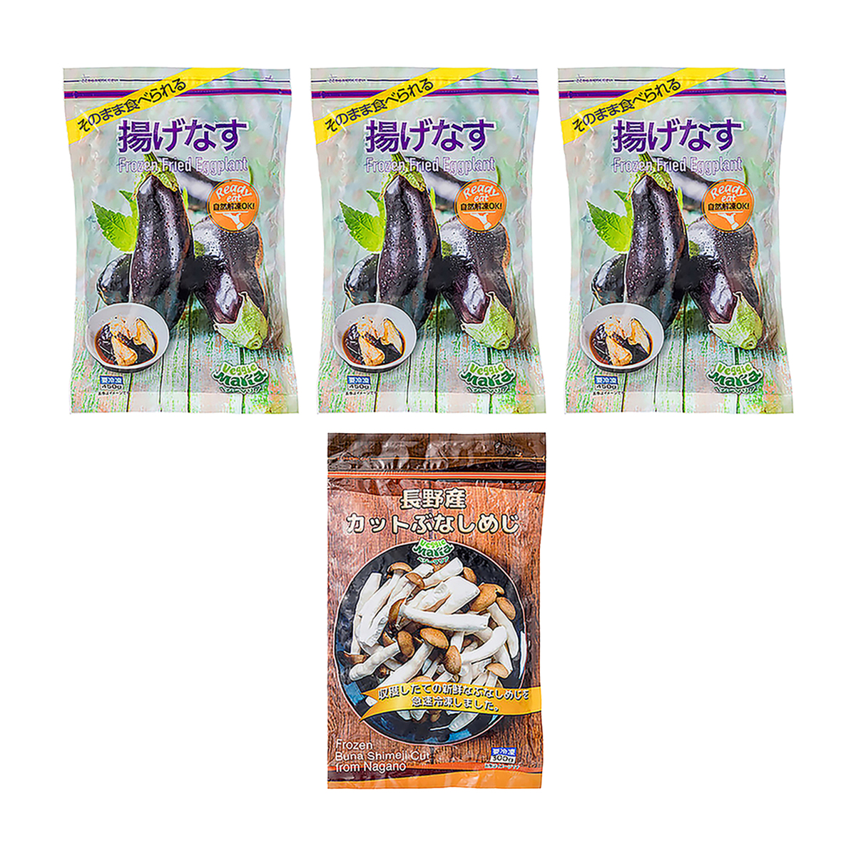 [アレルギー物質特定原材料8品目] なし [商品内容] ・揚げナス 450g×3袋 ・ぶなしめじ 300g [保存方法] 開封前:冷凍(‐18℃以下)で保存してください 開封後:開封後はお早めにお召上がりください [お召し上がり方] <揚げナス> 解凍してそのままお召上がりいたけます。室温約20℃で2時間〜2時間30分を目安に解凍してください 【電子レンジの場合】 凍ったままの本品を皿にのせ、ラップをかけずに下記の時間を目安に加熱してください 1/4袋の場合 500W:約2分40秒 600W:約2分20秒 1/2袋の場合 500W:約4分40秒 600W:約4分 機種によって加熱時間は多少異なります ラップをかけずに加熱してください 調理後はかなり熱くなっておりますので、やけどに十分ご注意ください <ぶなしめじ> 加熱してお召上がりください。調理中にやけどにご注意ください [注意事項] <揚げナス> ※再凍結はお避けください ※解凍後はすぐにお召し上がりください ※冷蔵庫内での保存はおすすめしません <ぶなしめじ> ※本商品は加熱調理してありません ※調理時のやけどにご注意ください ※解凍後の再凍結はお止めください ※電子レンジで加熱する場合は袋から出してから加熱してください ※個体差があるため大きさにバラつきがあります。ご容赦ください [原料原産地] ぶなしめじ:長野県 [原産国] 揚げナス:ベトナム ぶなしめじ:日本 [原材料] 揚げナス:なす、植物油(パーム油) ぶなしめじ:ぶなしめじ ※原料原産地:長野県