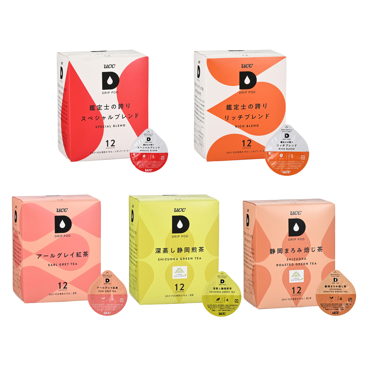 [アレルギー物質特定原材料8品目] なし [内容量] 90g(7.5g×12個) [保存方法] 開封前:直射日光、高温多湿をさけてください 開封後:できるだけ早めにお召し上がりください [お召し上がり方] 専用抽出マシンの湯量を5(160ml)に合わせ、コーヒー抽出モードを選択してドリップすることをおすすめしますが、お好みに応じてご調整ください [注意事項] ※この商品には専用の抽出マシンが必要となります ※それぞれのマシンの使用方法については、取扱説明書をご覧ください ※マシンの説明書に従って正しく安全にお使いください ※コーヒーを抽出する際、火傷にご注意ください ※ポッド天面部の色のついた点はコーヒー粉が挟まったものです。安心してお召し上がりください [原料原産地] コーヒー豆(生豆生産国名:ブラジル、ホンジュラス) [加工地] 日本 [セット内容] ・UCC ドリップポッド カプセル アールグレイ紅茶 ・UCC ドリップポッド カプセル 深蒸し静岡煎茶 ・UCC ドリップポッド カプセル 静岡まろみ焙じ茶 ・UCC ドリップポッド カプセル スペシャルブレンド ・UCC ドリップポッド カプセル リッチブレンド [原材料] コーヒー豆(生豆生産国名:ブラジル、ベトナム) [原材料] コーヒー豆(生豆生産国名:ブラジル、ホンジュラス) [原材料]紅茶(インド)/香料 [原材料]緑茶(静岡県) [原材料]緑茶(静岡県)