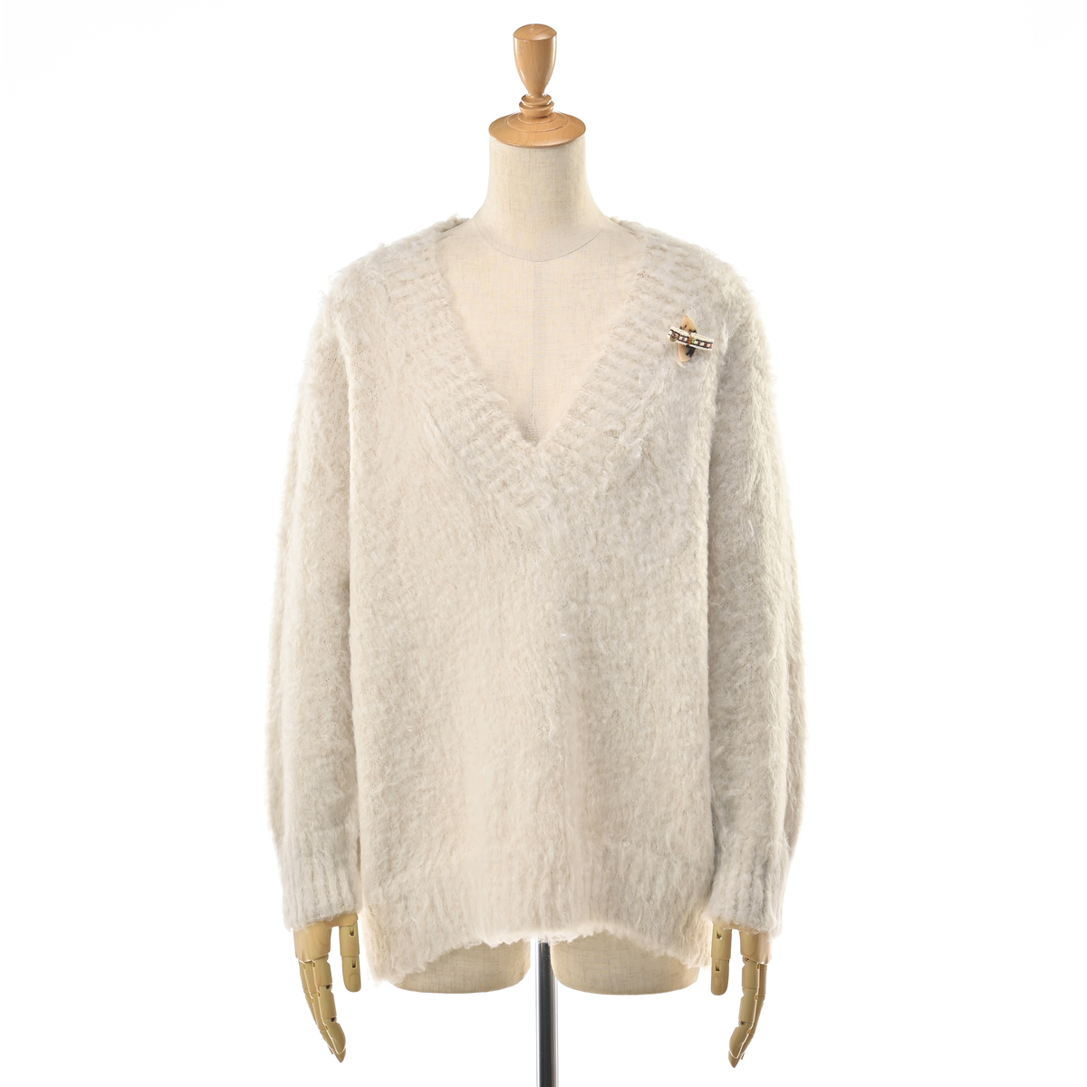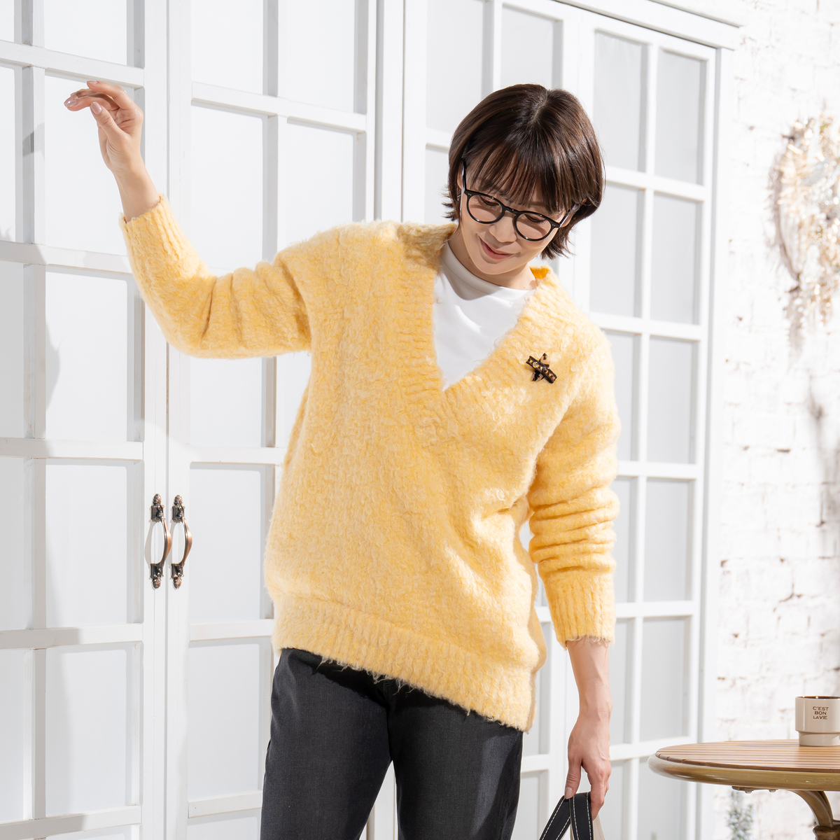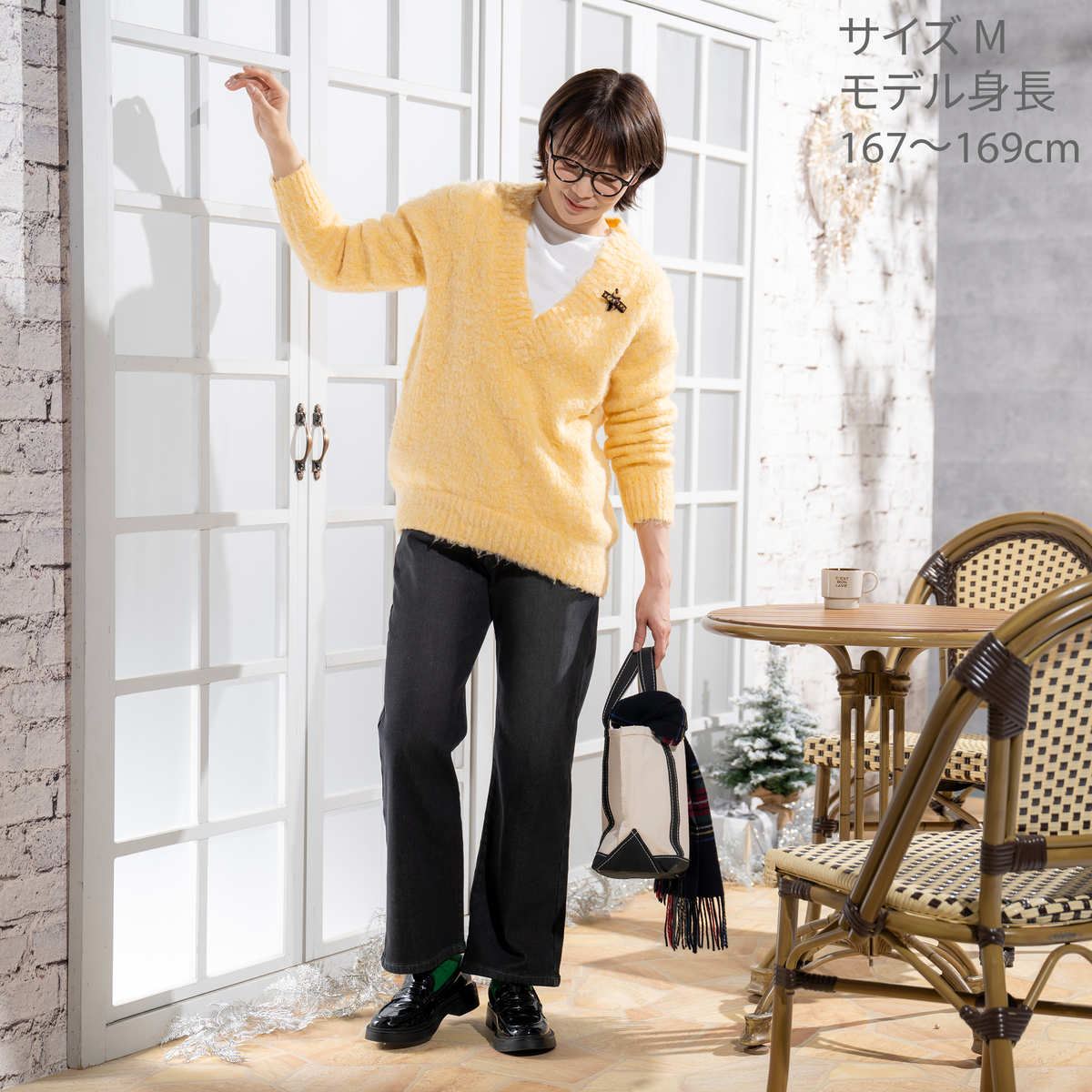 起毛感のあるニットをすっきり見せる深いVネック。ストレッチヤーンを引き揃えた太幅リブで編み地に安定感を持たせ、小顔効果や肩の華奢感を演出します。肩幅はジャストに設定し、ふんわりシルエットとのコントラストでスタイリッシュに