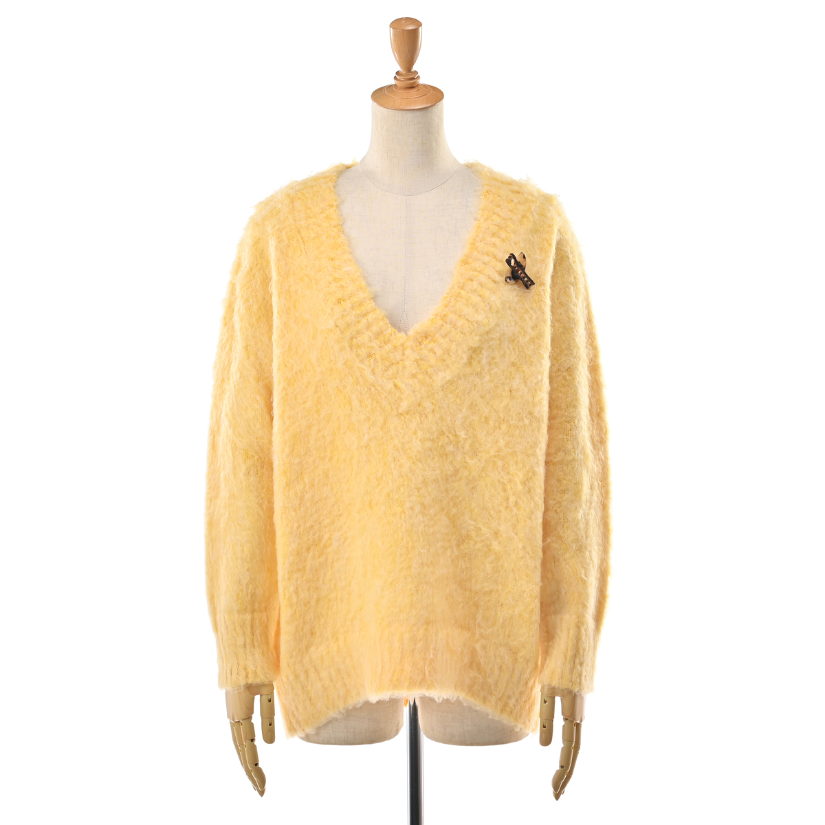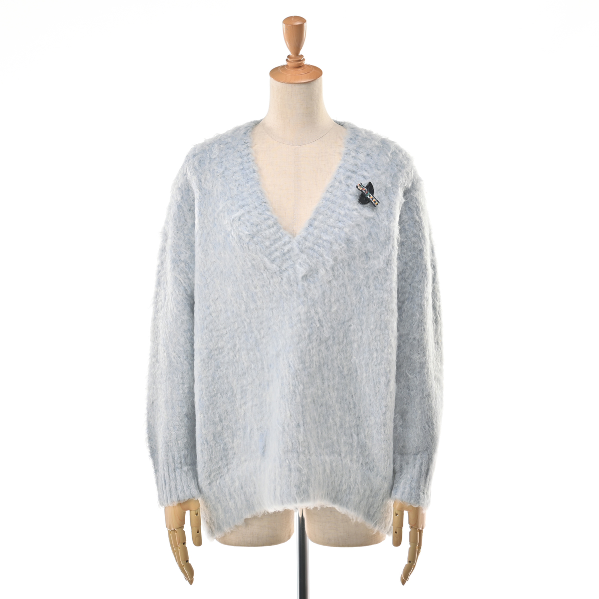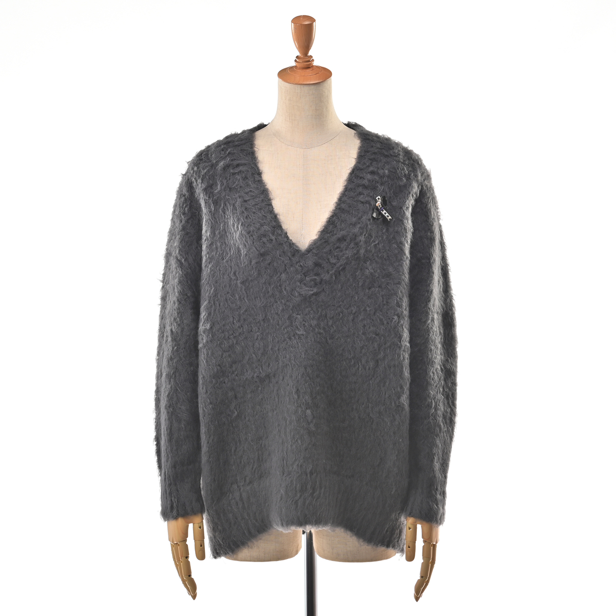 起毛感のあるニットをすっきり見せる深いVネック。ストレッチヤーンを引き揃えた太幅リブで編み地に安定感を持たせ、小顔効果や肩の華奢感を演出します。肩幅はジャストに設定し、ふんわりシルエットとのコントラストでスタイリッシュに