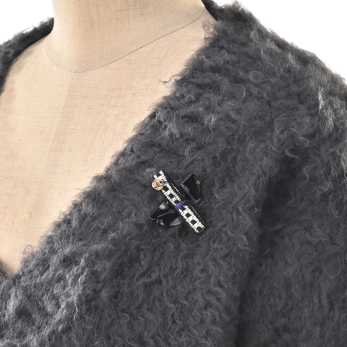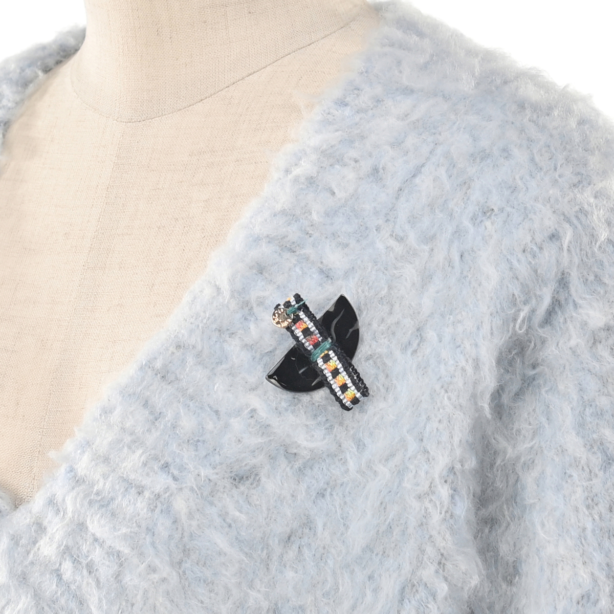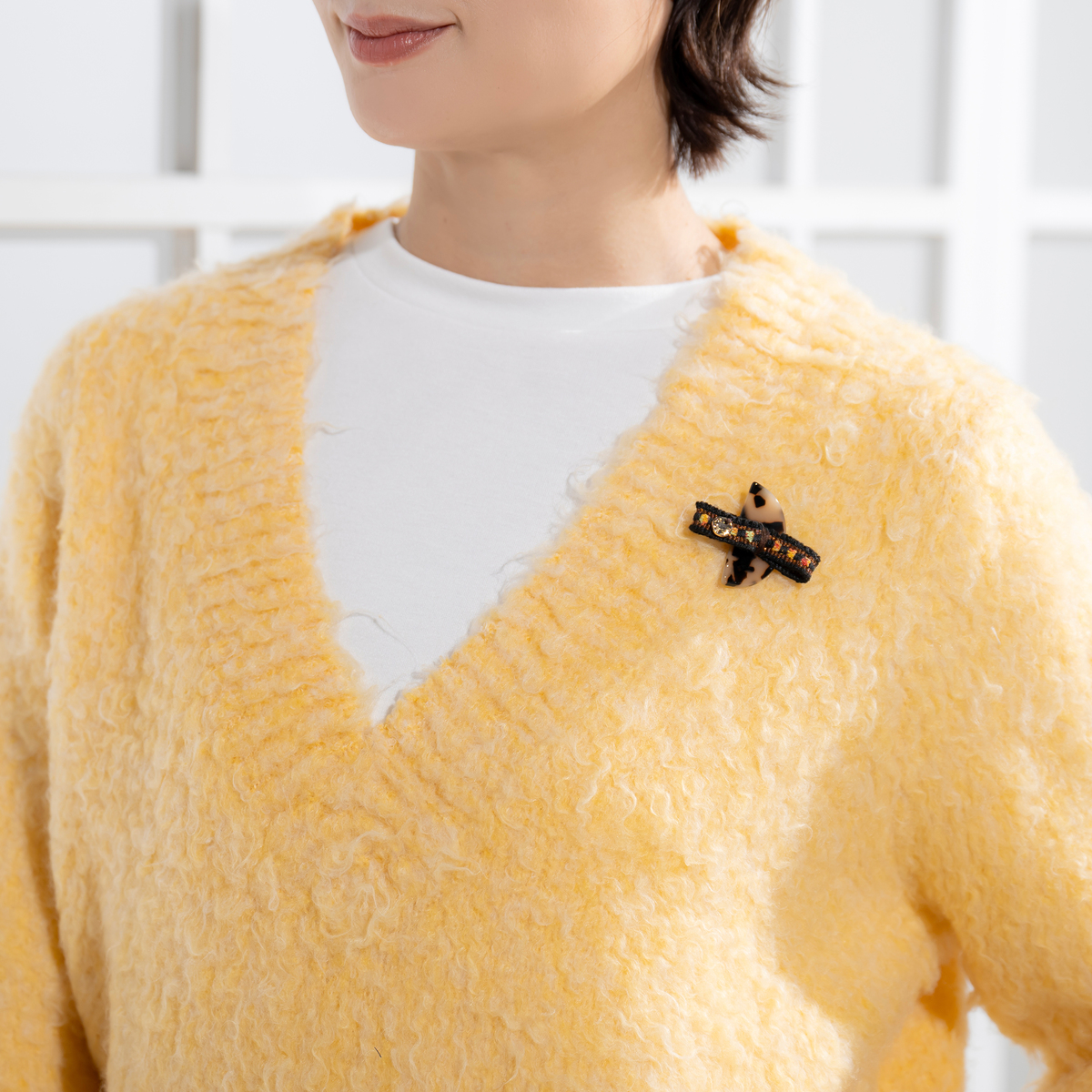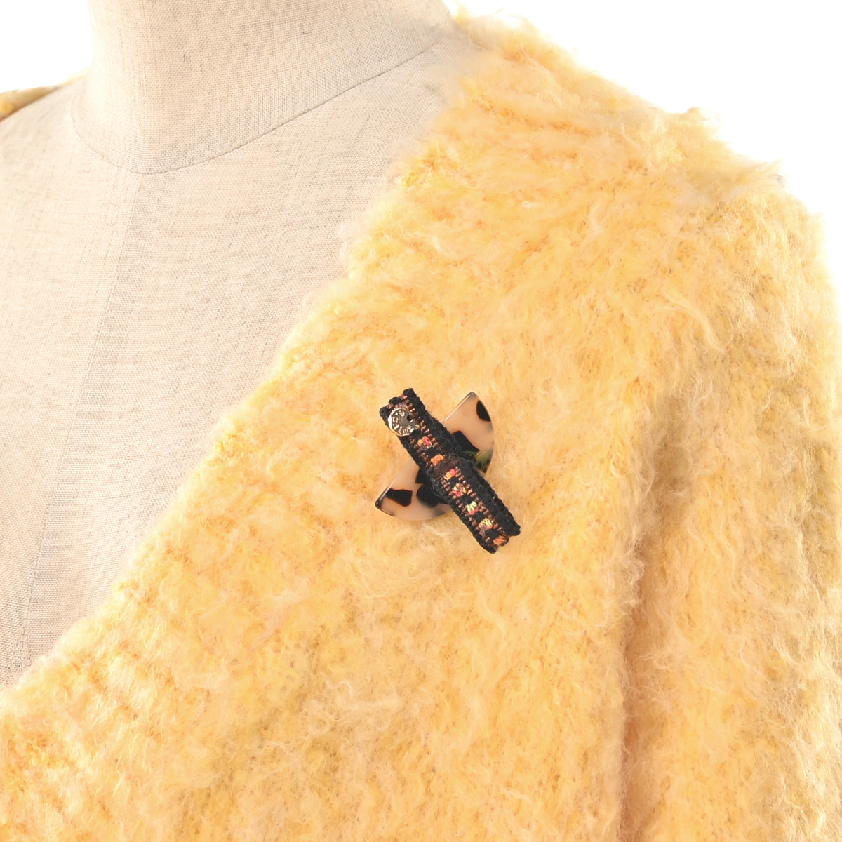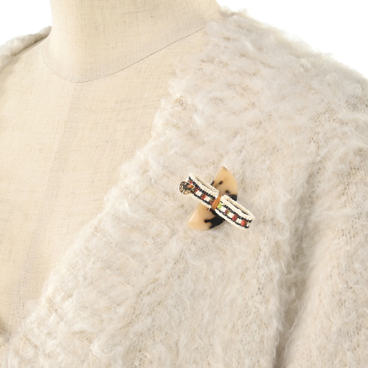 半月型のボタンにデザインテープとブランドロゴ入りチャームを組合せ、胸元にブローチ風モチーフを縫い付けました。シンプルな中にさりげないアクセントを添え、コーディネートにおしゃれ感をプラスします