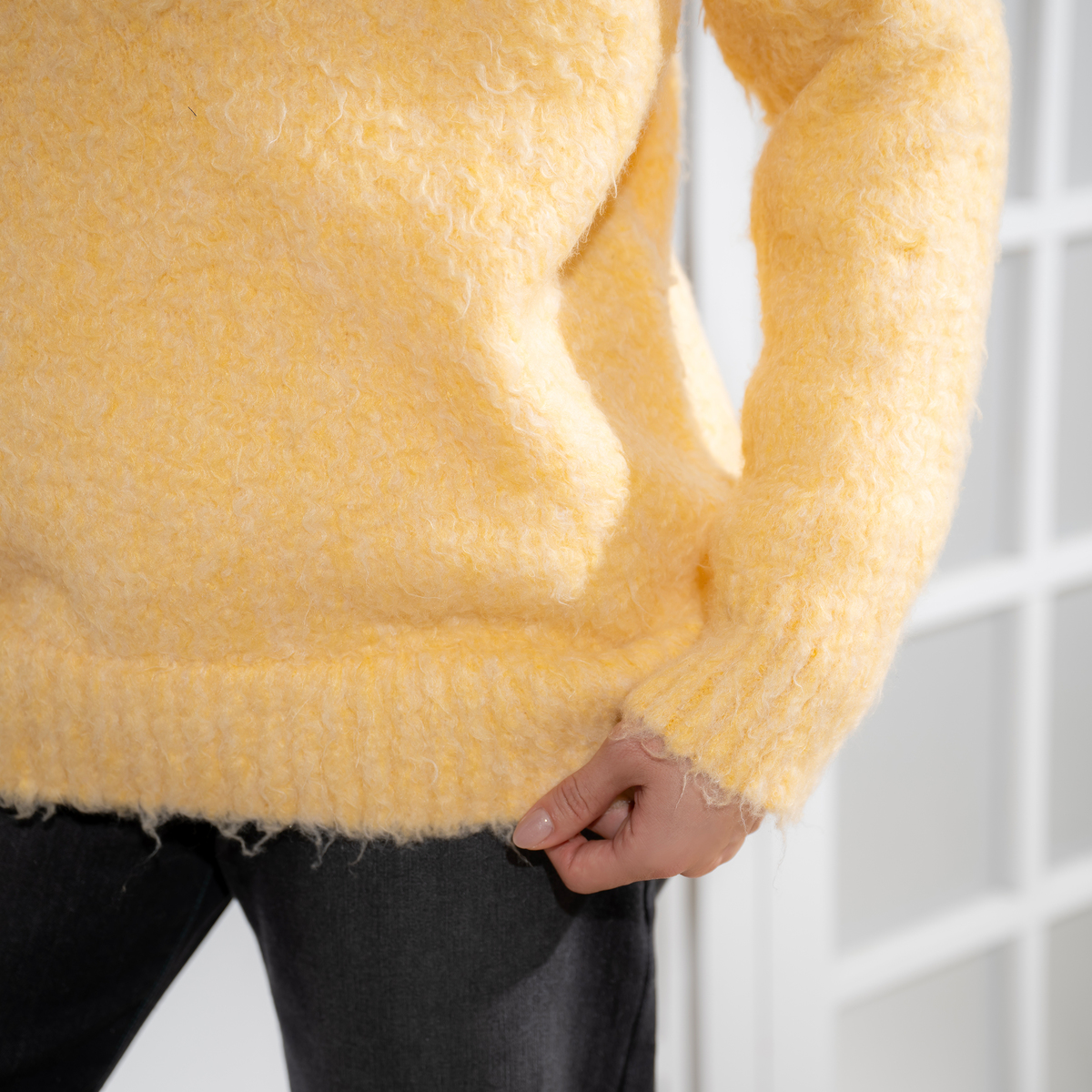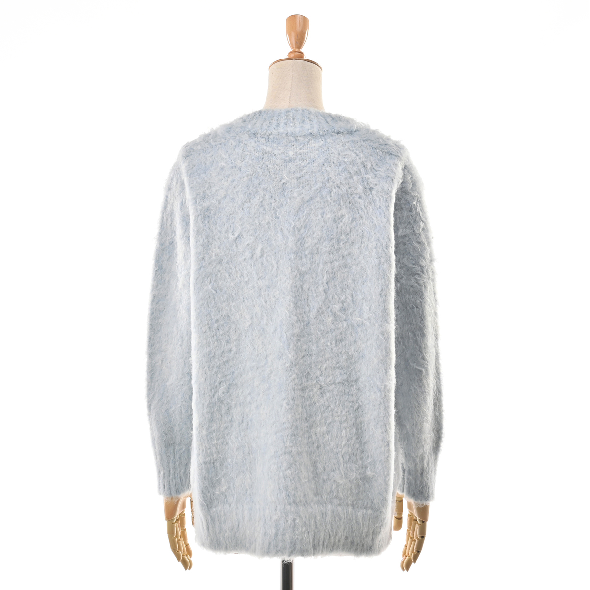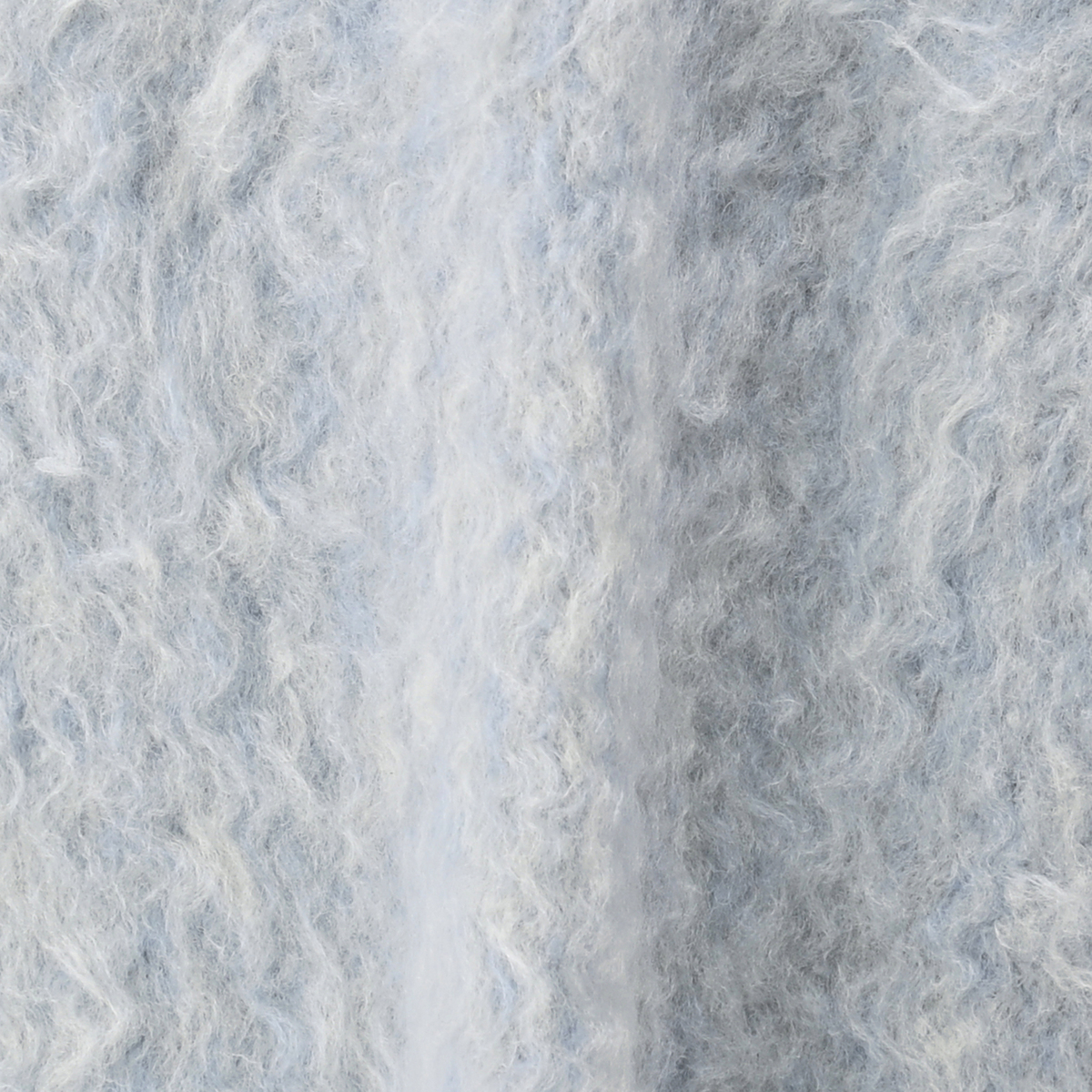 ブークレヤーンを使い、表面に起毛加工を施したニットプルオーバー。5ゲージ2本取りで編み上げ、ふんわりもこもこした質感と柔らかな肌触りに仕上げました。ウェービーな毛流れがファーのような雰囲気を演出し、色合いも優しく見える一枚です
