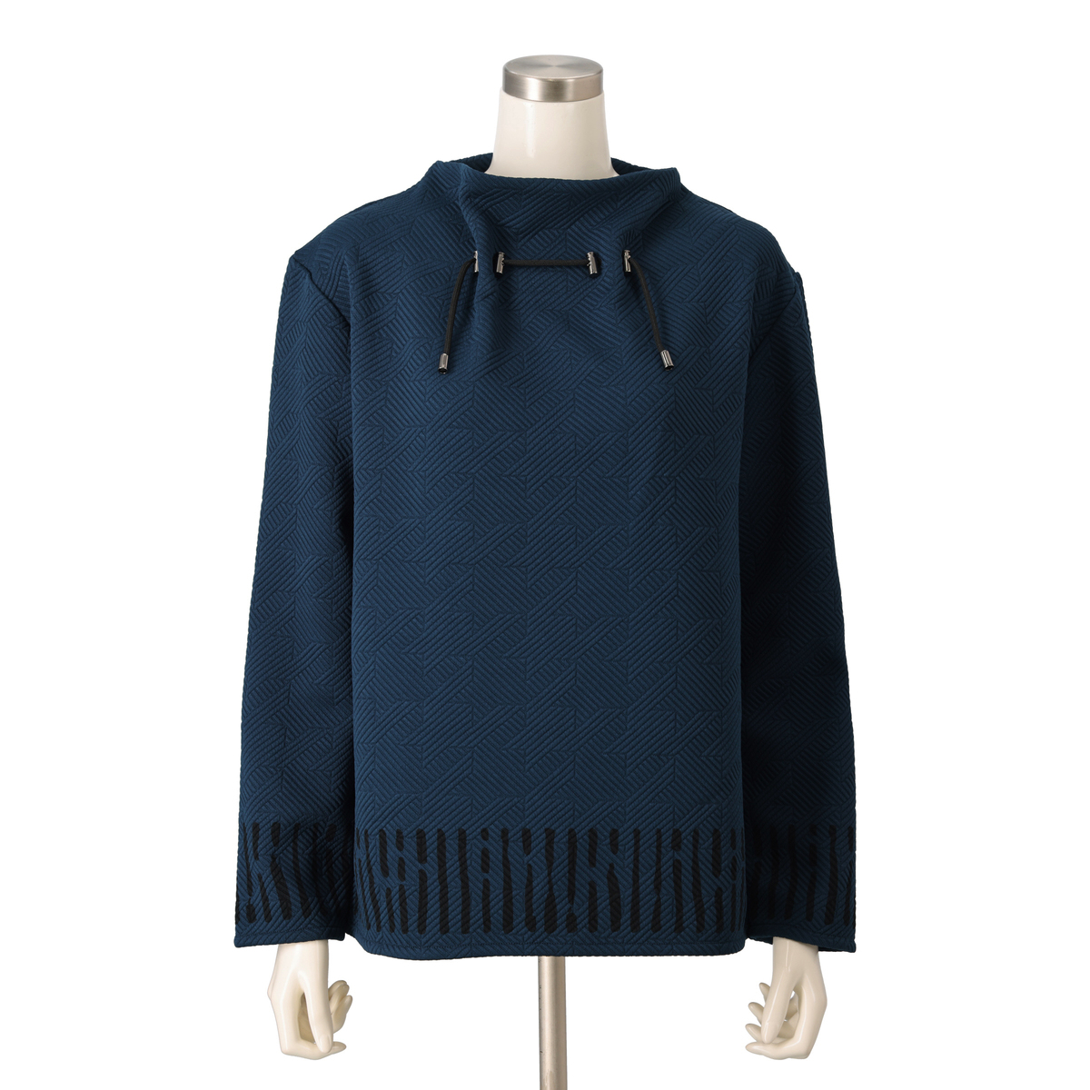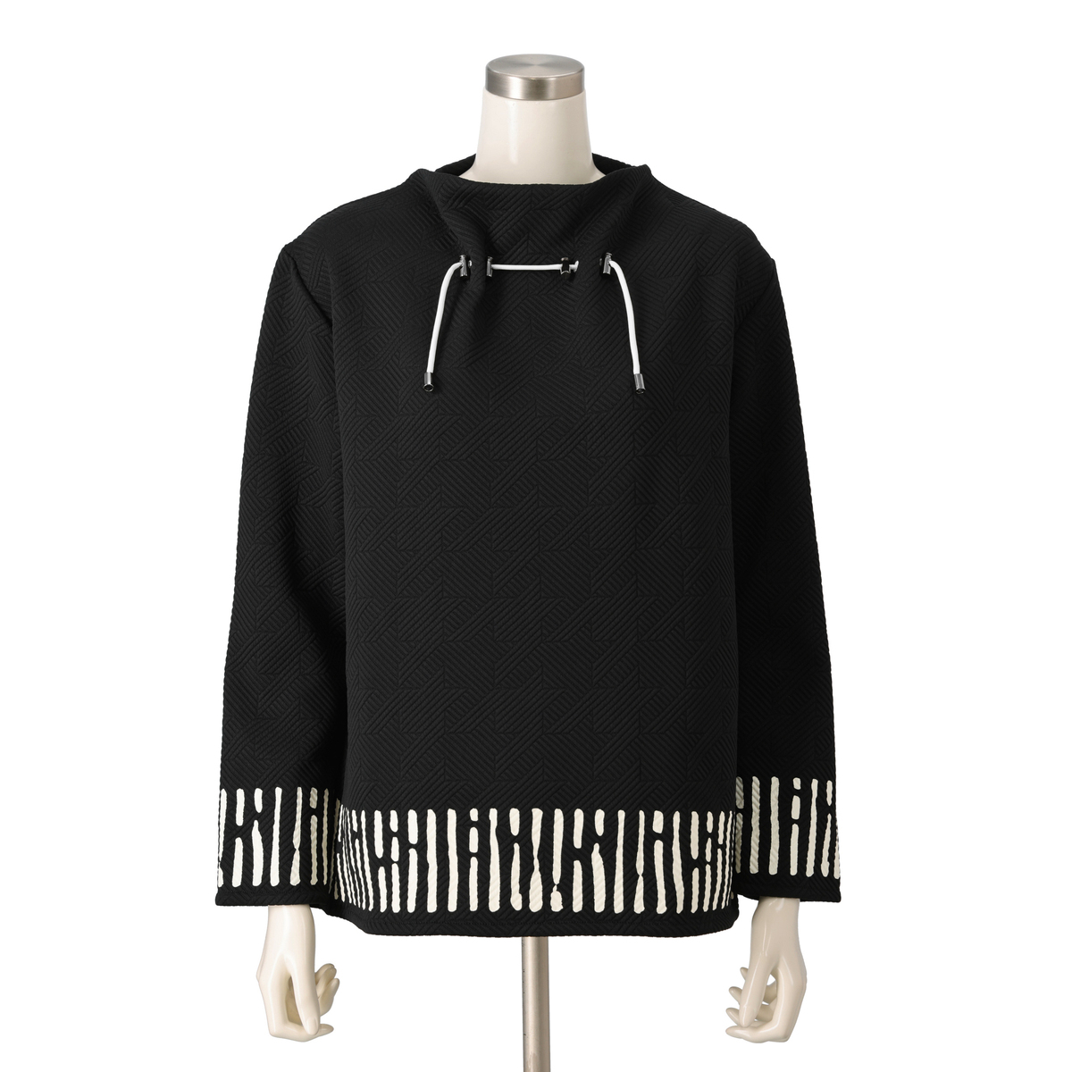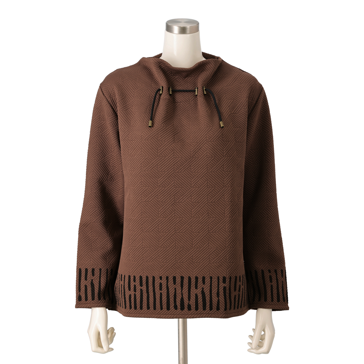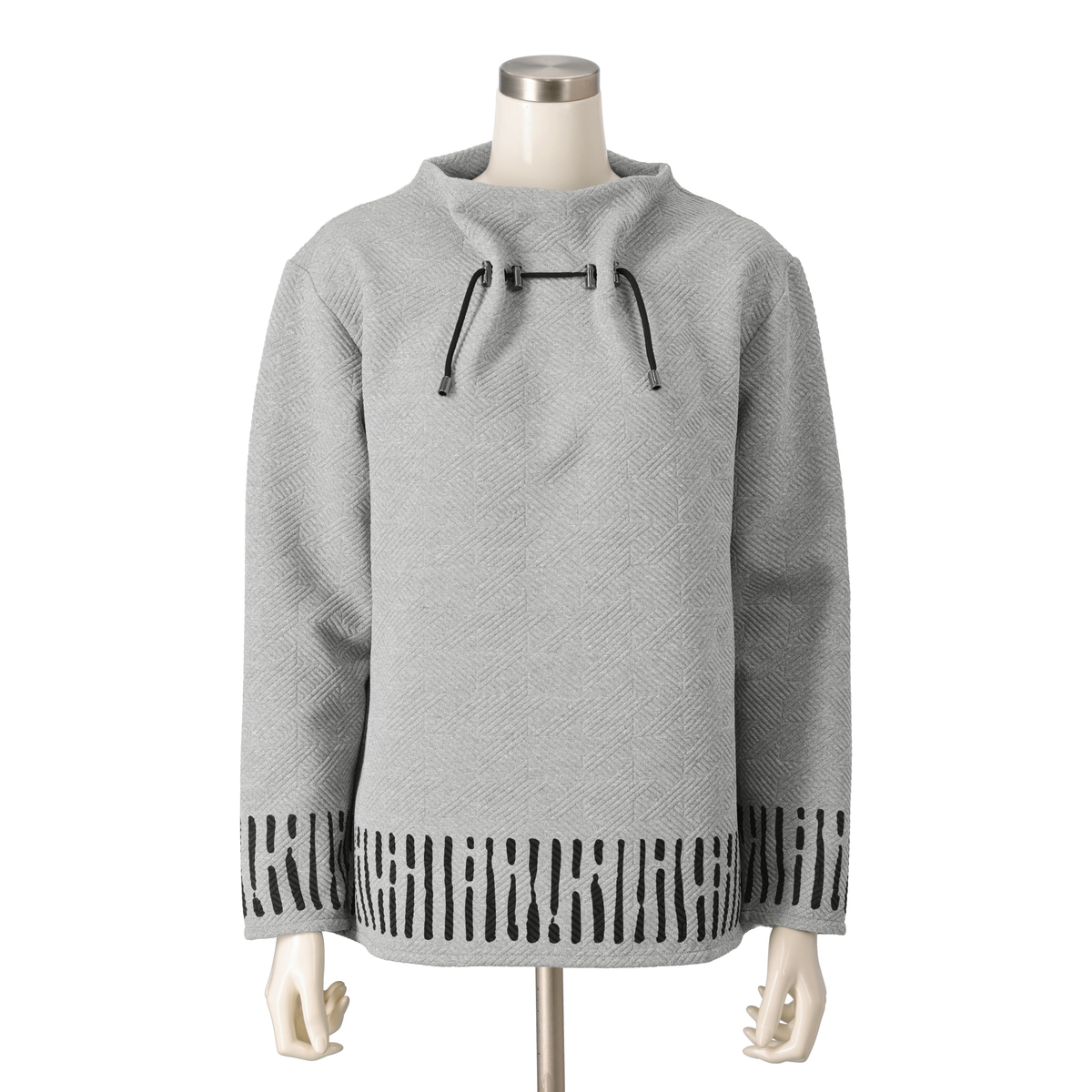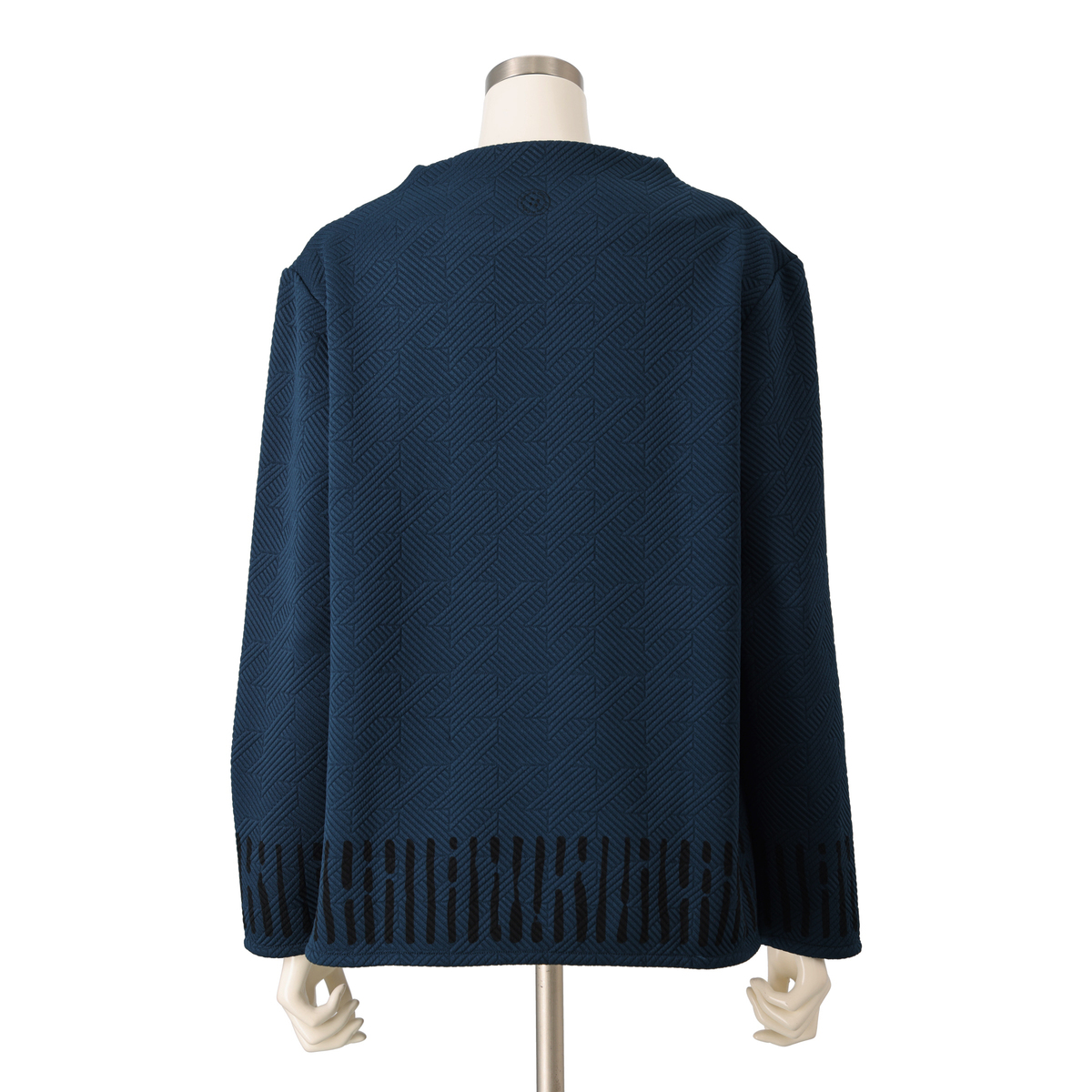 ジオメトリックな凹凸感が特徴のふくれジャガードのプルオーバー。身体のラインを拾いにくい反発感のある生地です