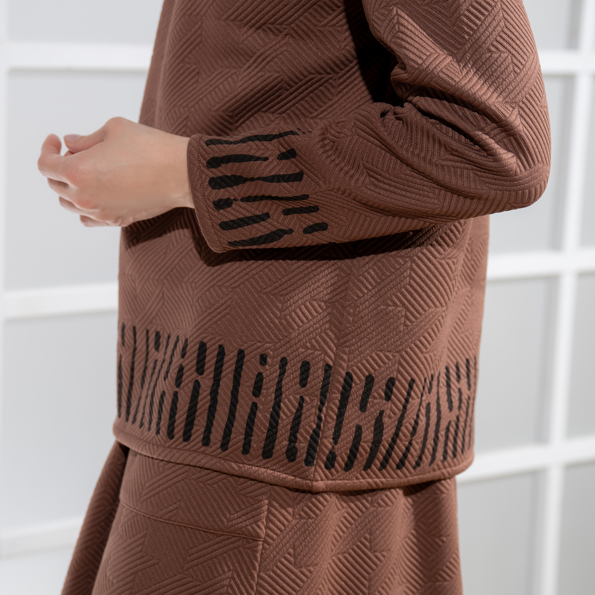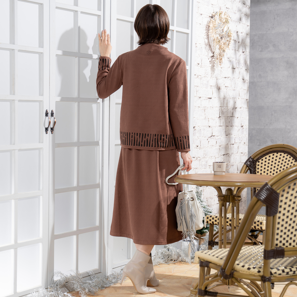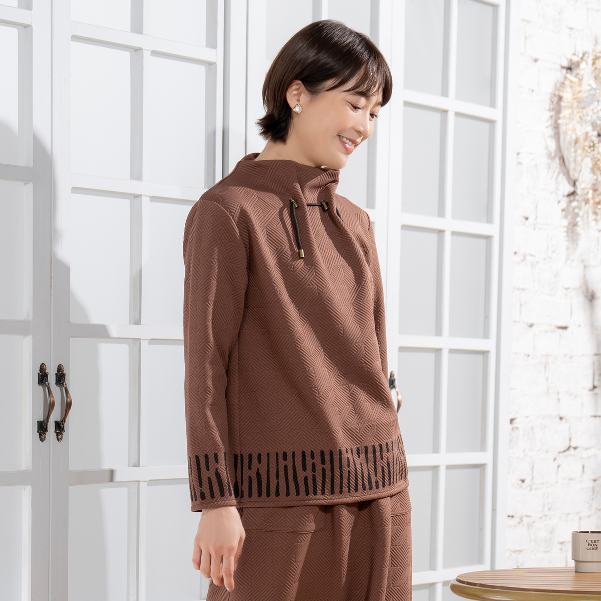 ジオメトリックな凹凸感が特徴のふくれジャガードのプルオーバー。身体のラインを拾いにくい反発感のある生地です