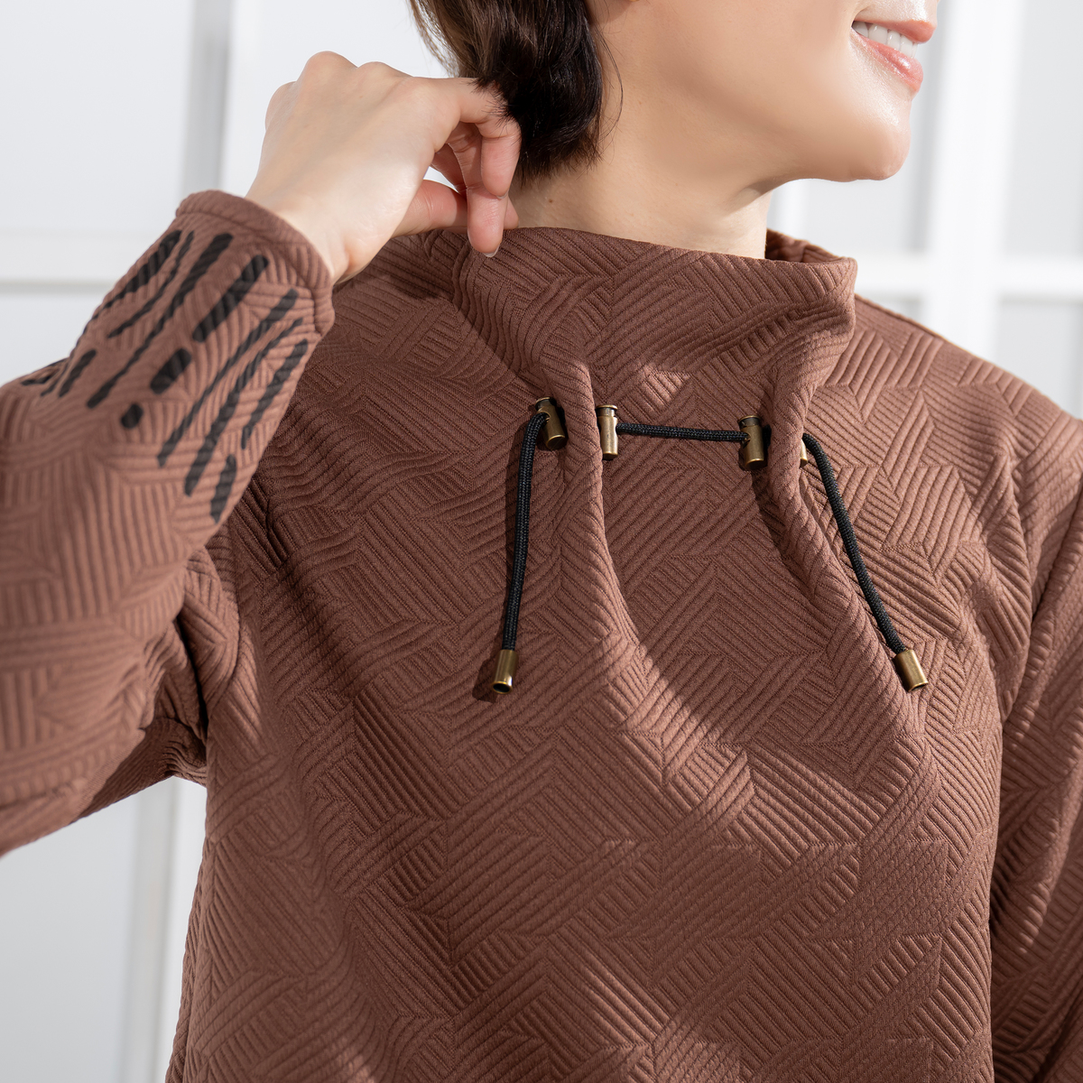 首元はドロスト付きの変形ボトルネックデザイン。4カ所にストッパー付きで、好みの形に絞ることで顔周りを華やかに見せてくれます