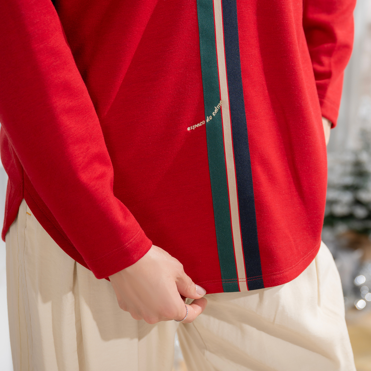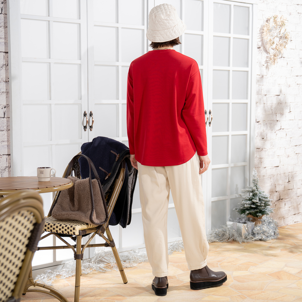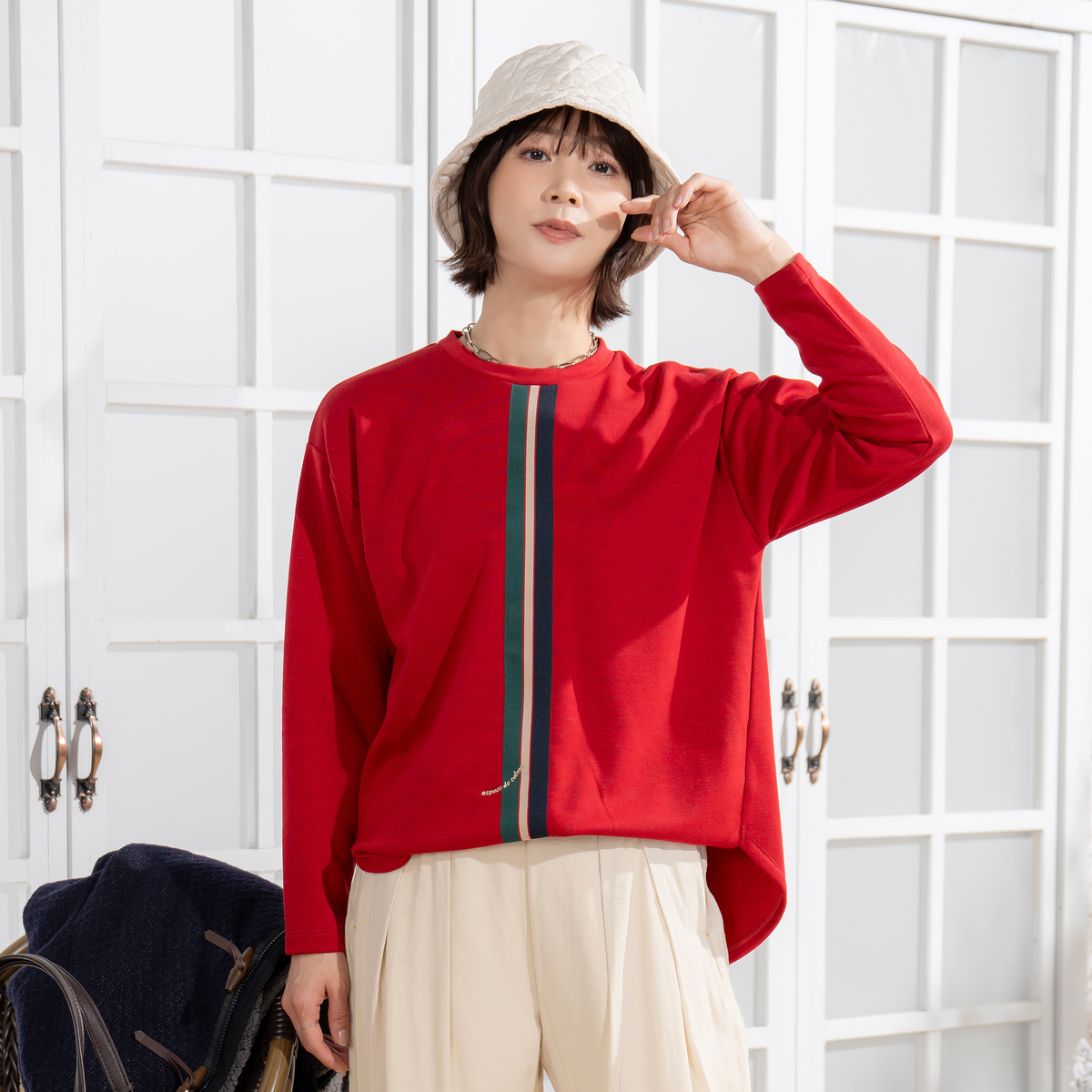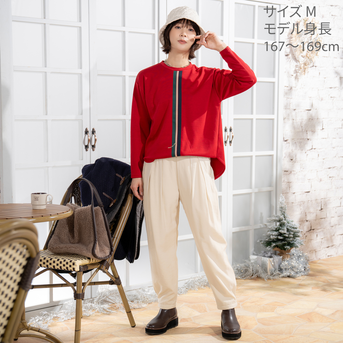 昨年「両面起毛とろみチュニック」のとろみ感が着心地抜群で暖かく、2枚購入。このテープアクセントチュニックも仕様が同様タイプを期待して、レッドLLをオンエア前に先行オーダー。レッド配色と中央テープアクセントが良いが、「両面起毛とろみチュニック」に比べて裏起毛だけだから、暖かさと生地感が劣る!!昨年のとろみチュニックは、トロトロ感が本当に気持ち良かったけど、このもっちり裏起毛はトレーナーやスエットみたいな製品の肌触りで、期待半減から、星マイナス1。