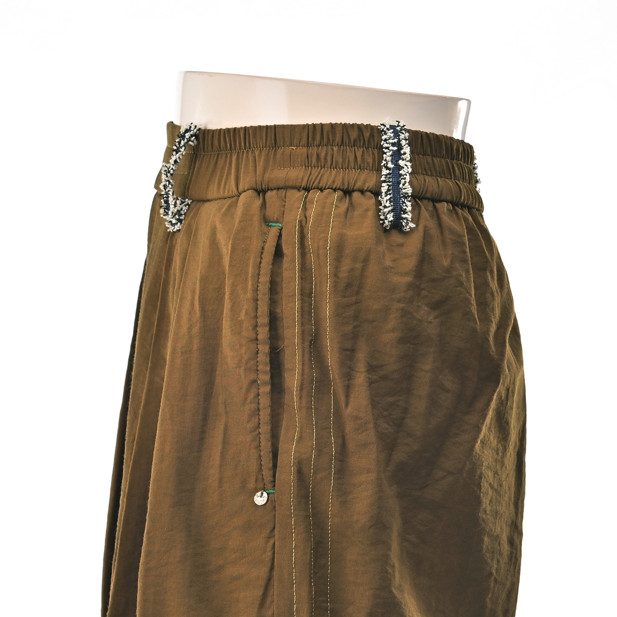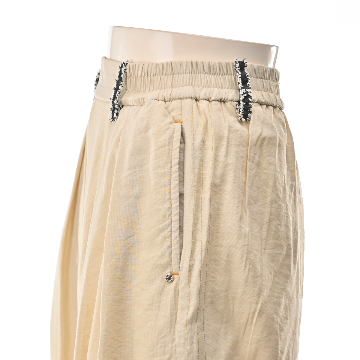 上品な表面感でほんのりシアーな平織り素材を表に、薄手のフリースを重ねたパンツ。暖かくコーディネートしていただけながら、大人上品な着こなしが楽しめるデザインにしました。裾先までフリースを重ねています