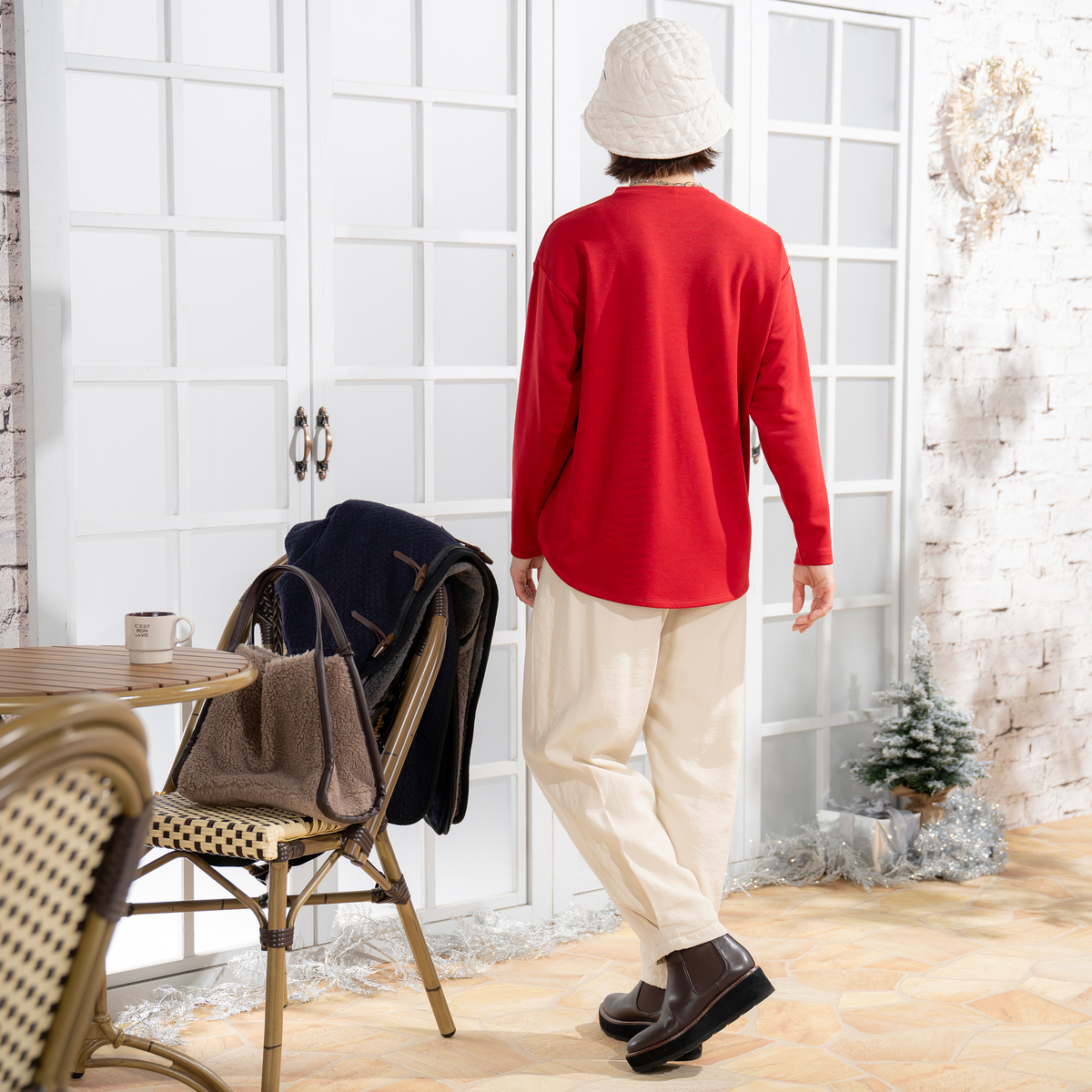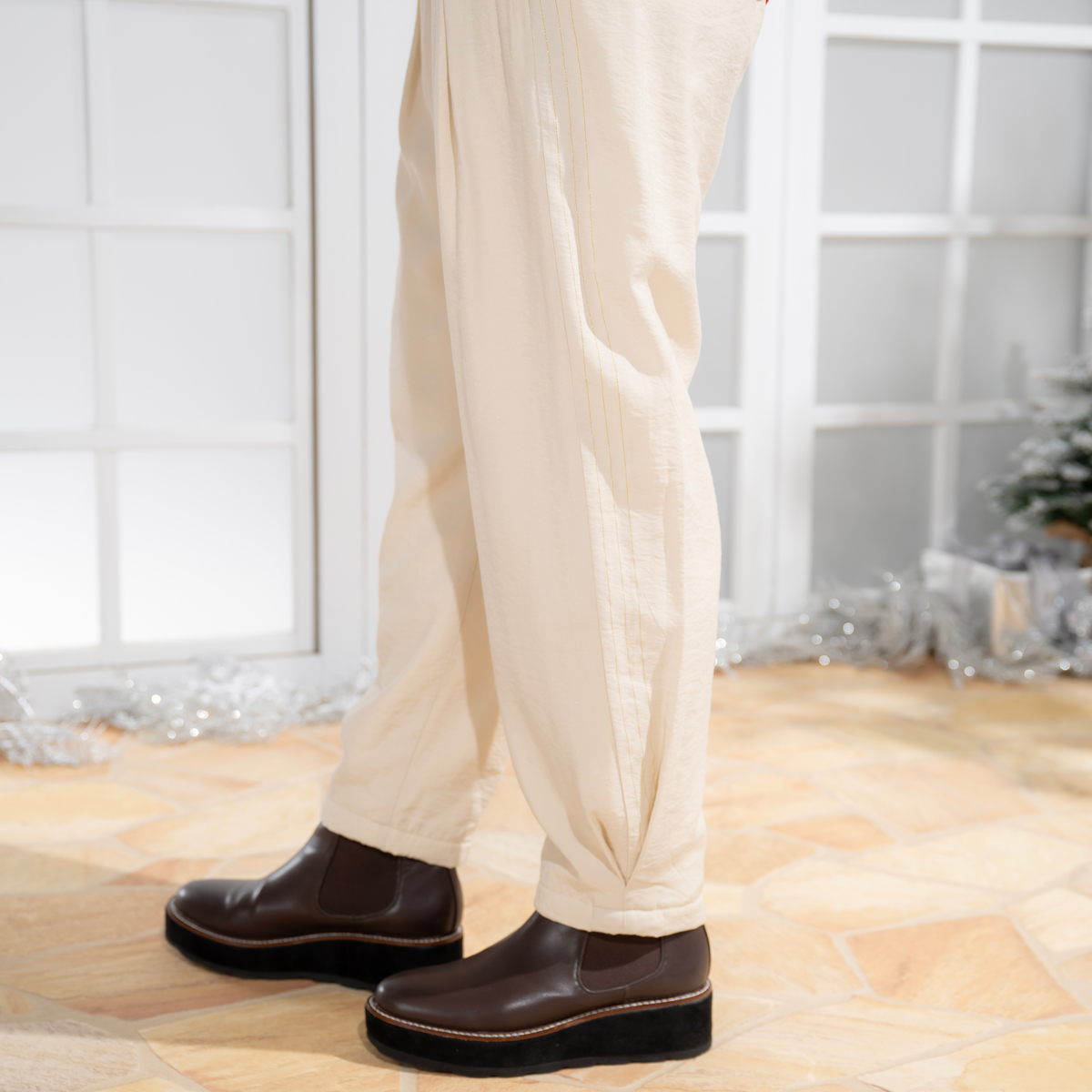 上品な表面感でほんのりシアーな平織り素材を表に、薄手のフリースを重ねたパンツ。暖かくコーディネートしていただけながら、大人上品な着こなしが楽しめるデザインにしました。裾先までフリースを重ねています