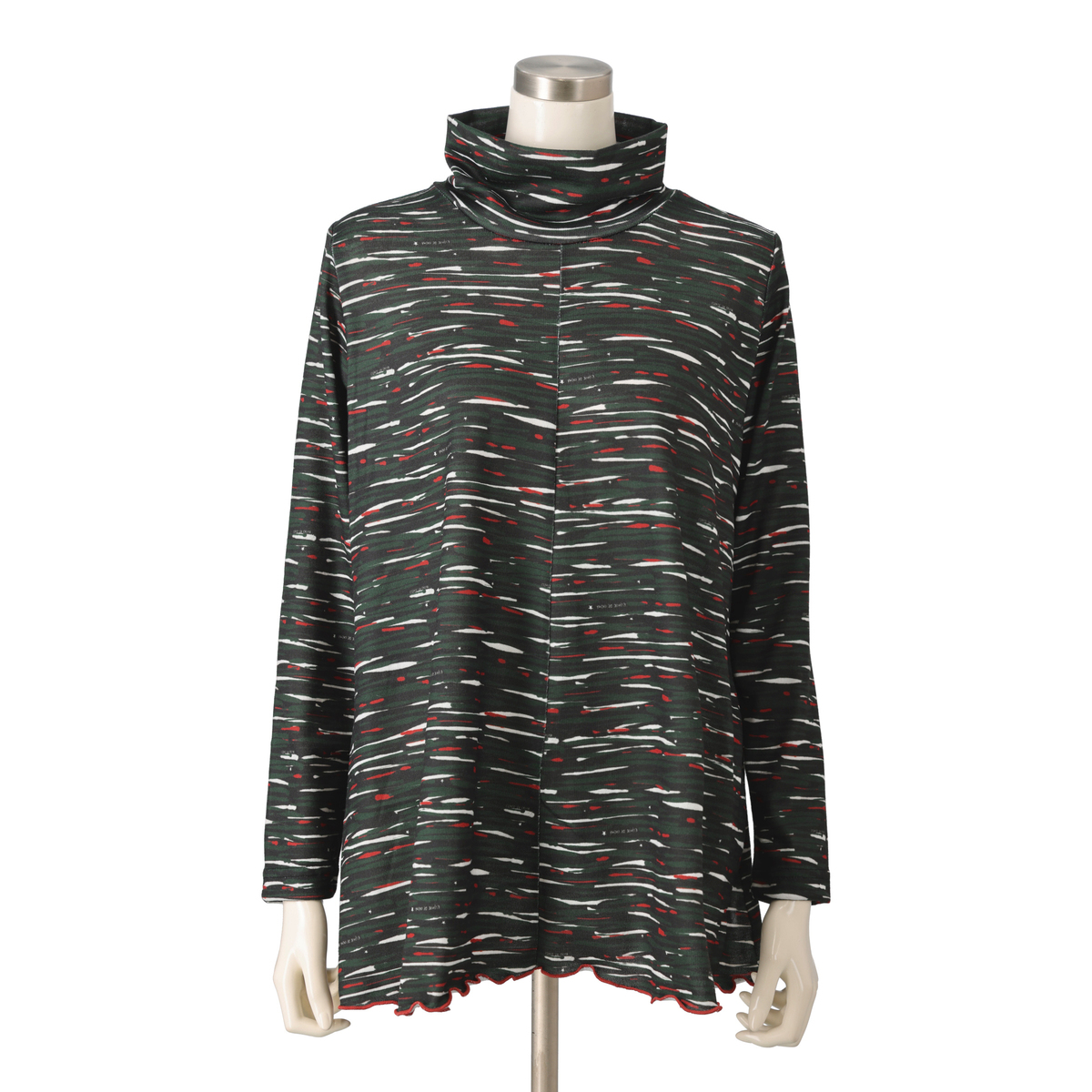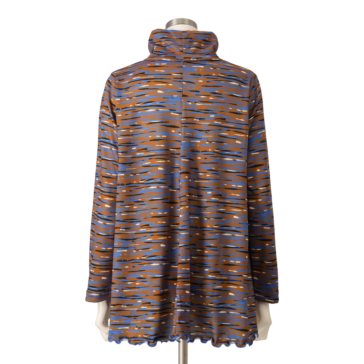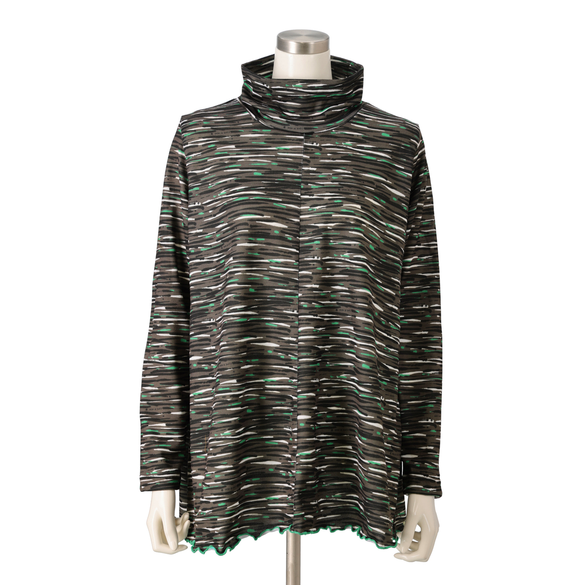 首元は2枚仕立てのハイネックで心地よくフィットし、くしゅっとしたアレンジも可能です。シルエットは全体にフレアポイントが入るようなパターンニングで、前後中心の切り替えが縦ラインを作り、すっきりとした印象に。裾は配色メローロック仕上げで軽やかなアクセントを添えます