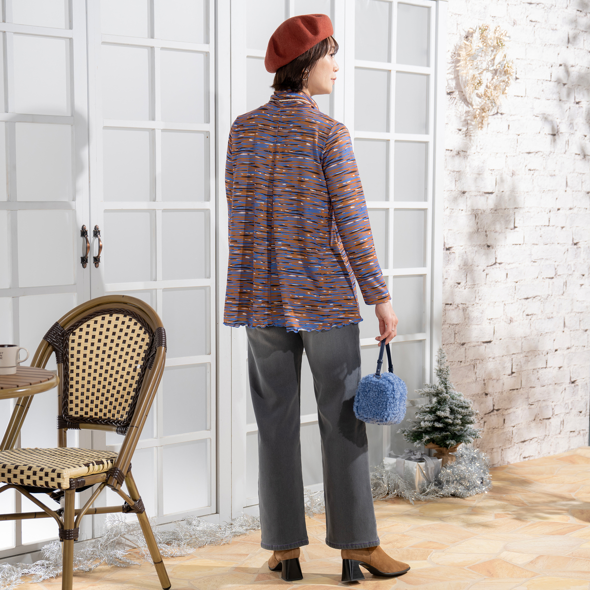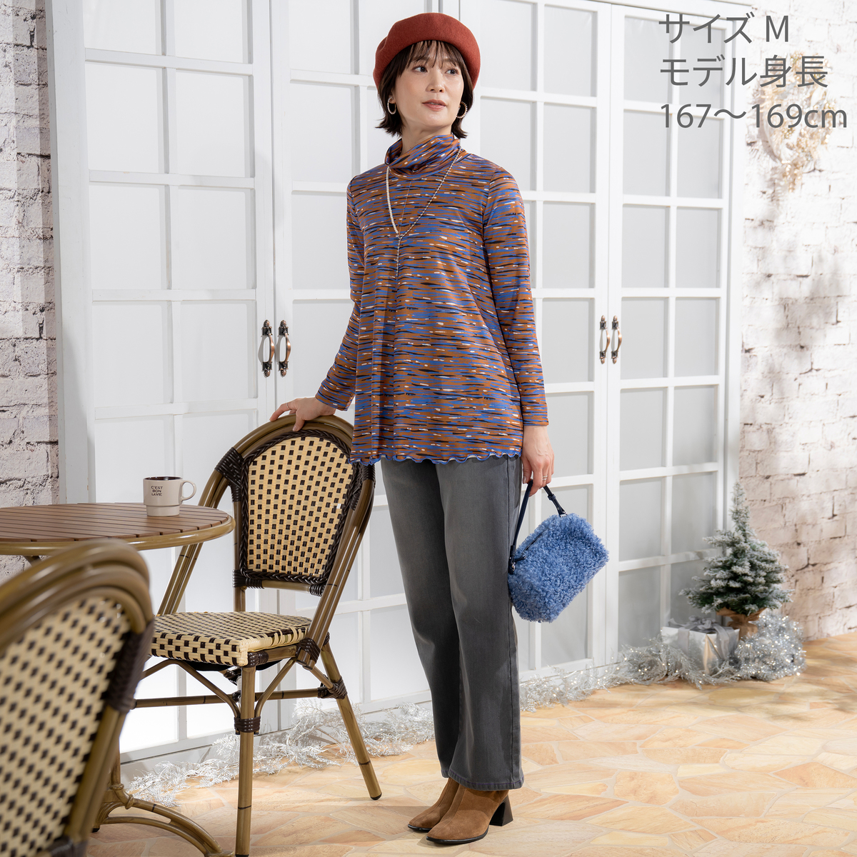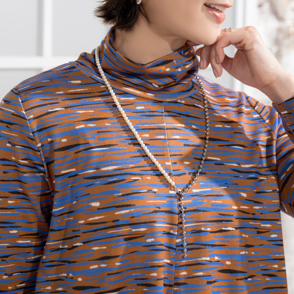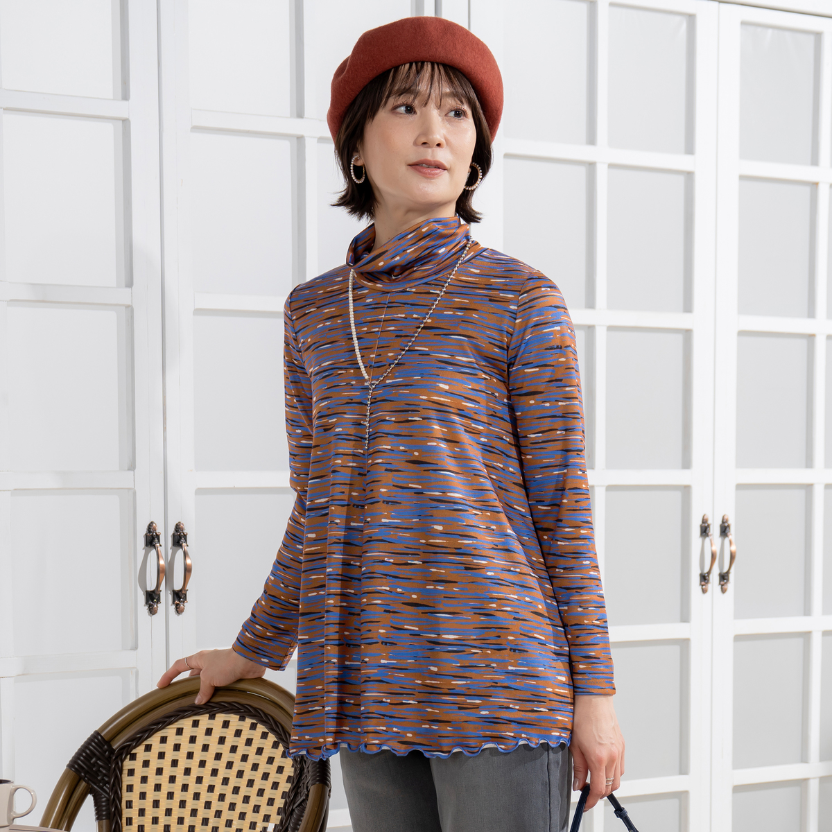 首元は2枚仕立てのハイネックで心地よくフィットし、くしゅっとしたアレンジも可能です。シルエットは全体にフレアポイントが入るようなパターンニングで、前後中心の切り替えが縦ラインを作り、すっきりとした印象に。裾は配色メローロック仕上げで軽やかなアクセントを添えます