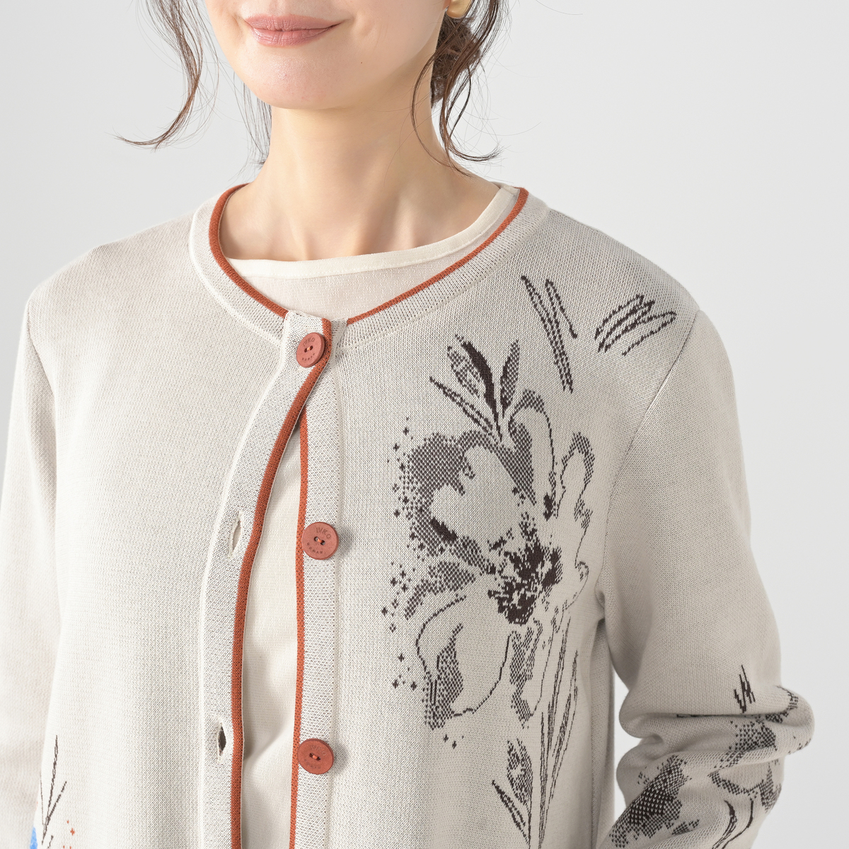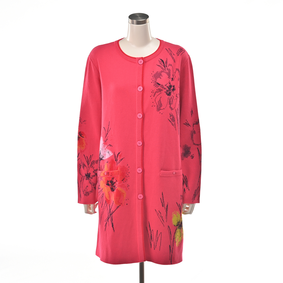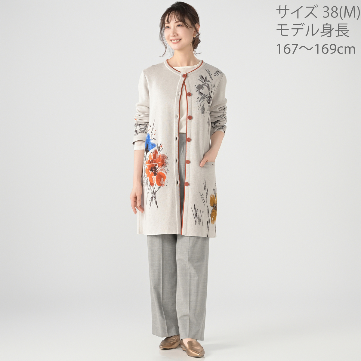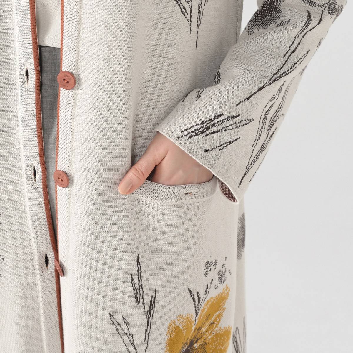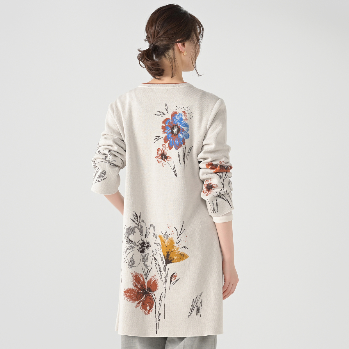 すっきりとした細身のロング丈カーディガンです。大胆な花柄が魅力で、季節の変わり目の軽やかなコートとしても幅広く活躍。自然の色彩とリズムから着想を得たデザインが、着る人の個性を引き立てます