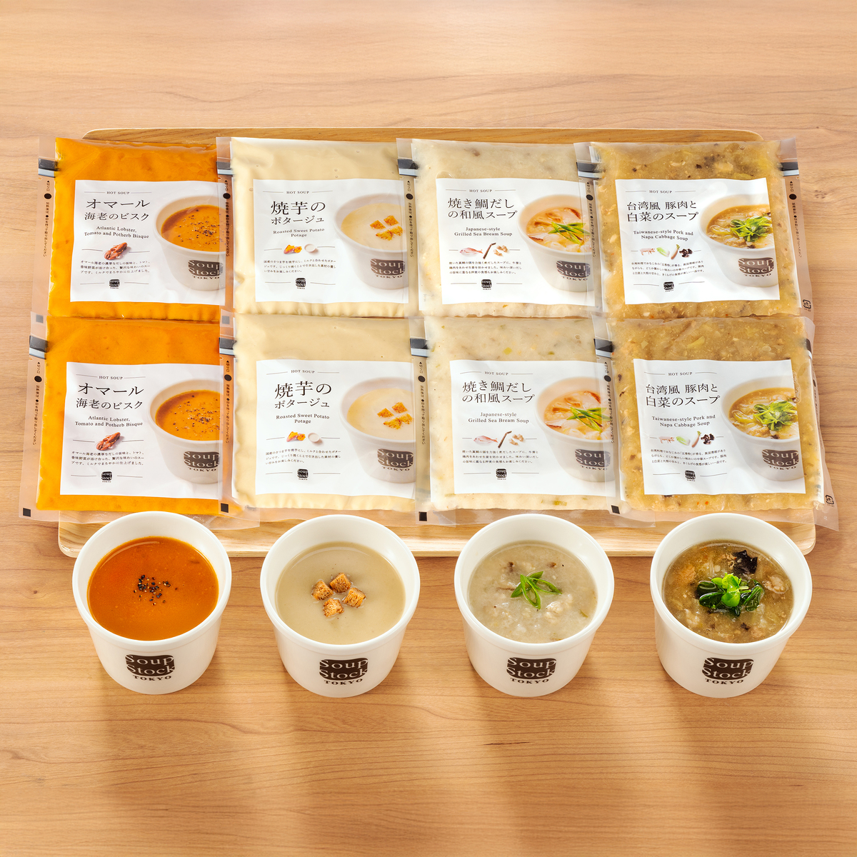[アレルギー物質特定原材料8品目] 小麦、乳、えび、かに <オマール海老のビスク> ※はちみつを使用しておりますので、1歳未満のお子様には与えないで下さい。 [セット内容] ・オマール海老のビスク ・焼芋のポタージュ ・焼き鯛だしの和風スープ ・台湾風豚肉と白菜のスープ 各180g×2 [賞味期限]出荷時点で賞味期限まで180日以上ある商品をお届けします [保存方法] 開封前:ー18℃以下で保存してください 開封後:開封後はすぐにお召し上がりください [お召し上がり方] <電子レンジで温める場合> ・凍ったまま開封せずに蒸気吹出口を上にしてお皿にのせ、電子レンジに入れ、500w 4分30秒、600w 4分を目安に加熱してください ・加熱中は、袋が膨らみますが、一定以上に膨らむと蒸気が吹き出し口から抜けてしぼみます ・加熱終了後はお皿に袋をのせたまま取り出し、蒸気吹き出し口を上にして、切り口部を開封してください <湯煎での加熱方法> ・凍ったまま開封をせずに袋ごと、沸騰したお湯の中で約5分間温めてください。鍋にフタはしないで下さい [注意事項] ※加熱しすぎると品質が劣化、分離する場合があります ※商品は冷凍室(ー18℃以下)で保存してください ※一度解凍したものを再冷凍しないでください ※開封後はすぐにお召し上がりください ※開封時に袋のフチで手を切らないようにご注意ください ※写真は盛り付け例とイメージです <オマール海老のビスク> ※はちみつを使用しておりますので、1歳未満のお子様には与えないで下さい [原料原産地] オマール海老のビスク:オマール海老ブイヨン〔オマールエビヘッド、野菜(玉葱、人参、セロリ、にんにく、パセリ)、トマトペースト、ワイン、トマト・ピューレーづけ、ブランデー、オリーブ油、大豆油、酢漬けタラゴン、食塩、香辛料〕(国内製造) 焼芋のポタージュ:牛乳(国内製造) 和風スープ:大根(国産) 台湾風豚肉と白菜のスープ:白菜(国産) [原産国]日本 [原材料] オマール海老のビスク:野菜(玉葱、人参、セロリ、にんにく)、オマール海老ブイヨン〔オマールエビヘッド、野菜(玉葱、人参、セロリ、にんにく、パセリ)、トマトペースト、ワイン、トマト・ピューレーづけ、ブランデー、オリーブ油、大豆油、酢漬けタラゴン、食塩、香辛料〕(国内製造)、牛乳、クリーム、トマトペースト、ワイン、澱粉、ホタテブイヨン、バター、豚脂、カニブイヨン、食塩、はちみつ、ブランデー、香辛料、(一部に乳成分・えび・かに・大豆・豚肉を含む) 焼芋のポタージュ:牛乳(国内製造)、焼き芋(さつま芋)、赤レンズ豆、玉葱、甘酒、クリーム、バター、食塩、チキンブイヨン、香辛料、(一部に乳成分・鶏肉を含む) 焼き鯛だしの和風スープ:野菜(大根(国産)、ごぼう、ねぎ、生姜)、ブイヨン(真鯛頭、清酒、根昆布だし、その他)、押麦、鶏肉、魚醤加工品(魚醤、昆布エキス、食塩、酵母エキス)、クリーム、醤油、片栗粉、豚脂、食塩、乾しいたけ、香辛料、(一部に乳成分・小麦・大豆・鶏肉・豚肉を含む) 台湾風豚肉と白菜のスープ:野菜(白菜(国産)、大根、玉葱、長葱、にんにく、生姜)、豚肉、醤油、澱粉、塩こうじ、豚脂、魚醤加工品(魚醤、昆布エキス、食塩、酵母エキス)、チキンブイヨン、食塩、砂糖、香辛料、乾きくらげ、(一部に小麦・大豆・鶏肉・豚肉を含む)