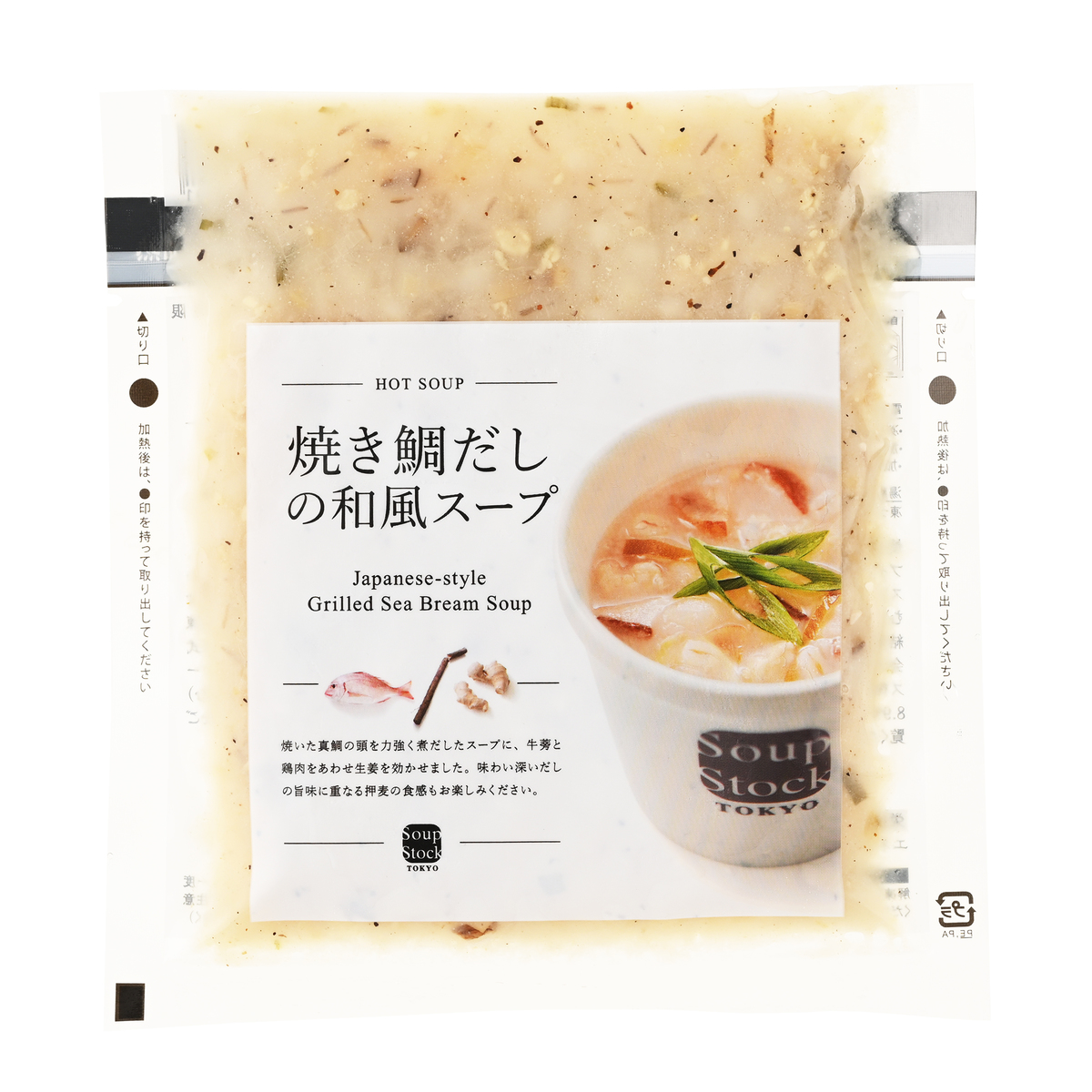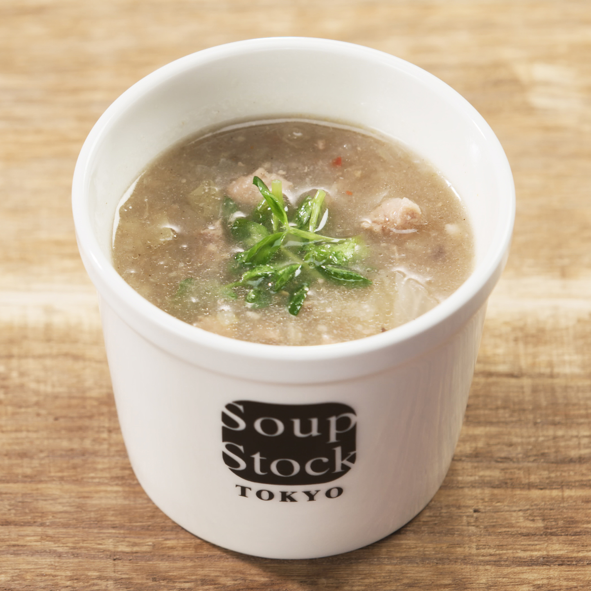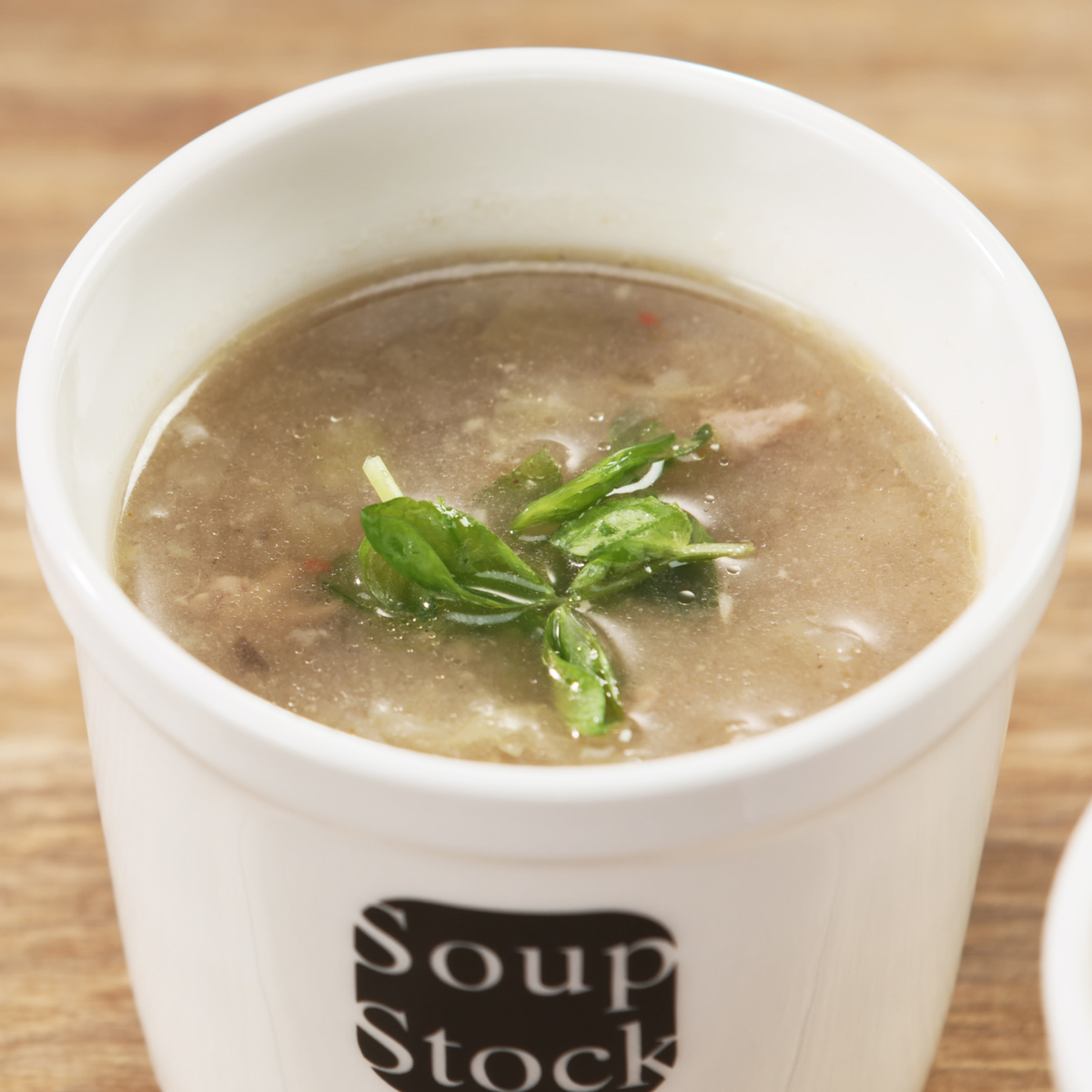 焼いた真鯛の頭を煮だしたスープに、牛蒡と鶏肉をあわせ生姜を効かせました。味わい深いだしの旨味に重なる押麦の食感が楽しめます。牛蒡、大根、ねぎ、鶏肉、押麦などの具材入りで、満足感のある一杯に仕上げています