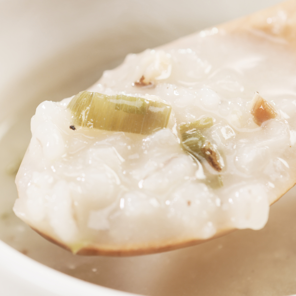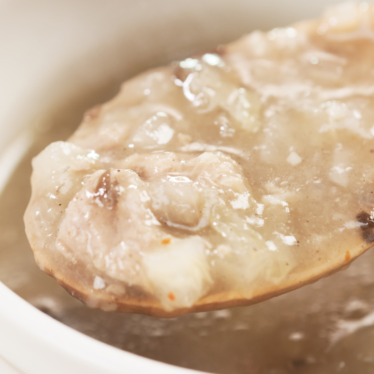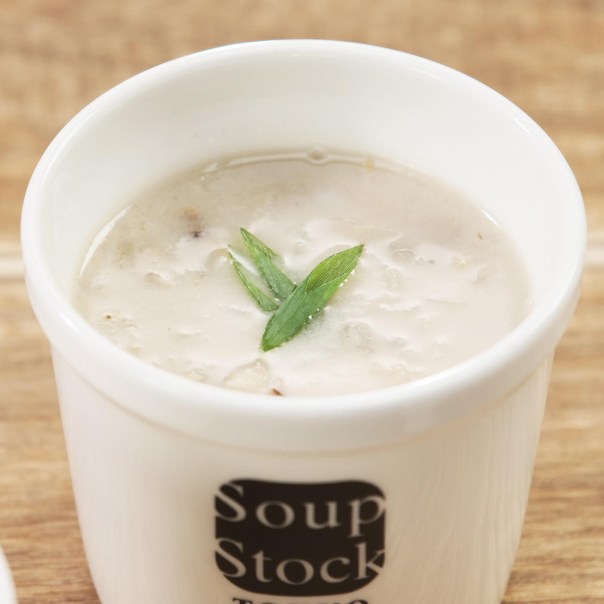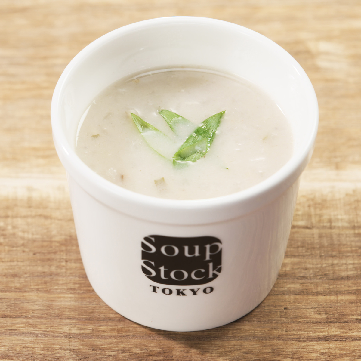 焼いた真鯛の頭を煮だしたスープに、牛蒡と鶏肉をあわせ生姜を効かせました。味わい深いだしの旨味に重なる押麦の食感が楽しめます。牛蒡、大根、ねぎ、鶏肉、押麦などの具材入りで、満足感のある一杯に仕上げています