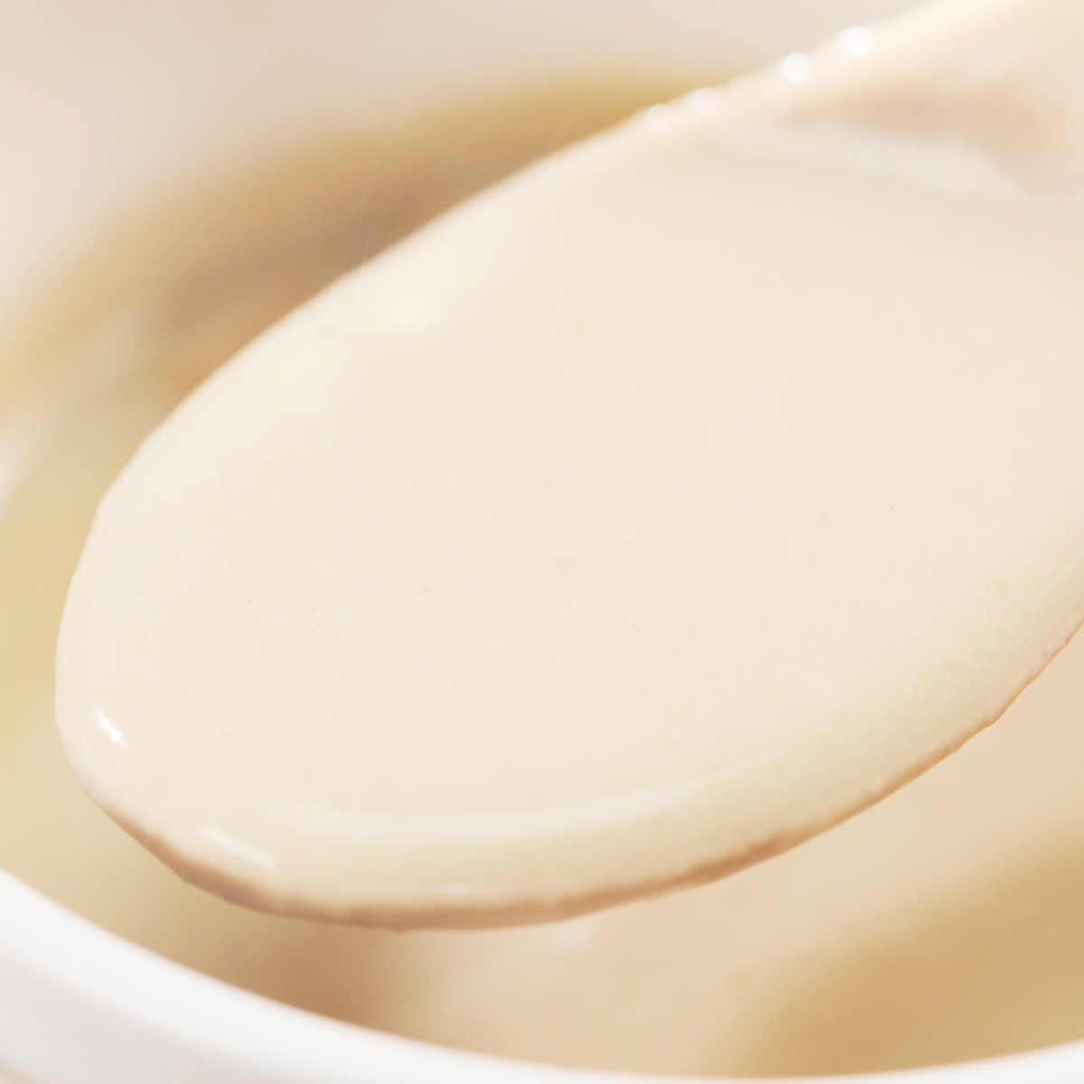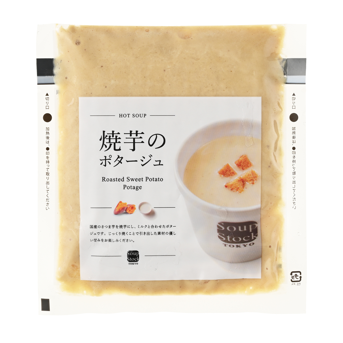 国産のさつま芋を焼芋にし、ミルクと合わせたポタージュ。焼芋は皮ごと使用し、香ばしさを引き出しています。玉ねぎ、バター、チキンブイヨンと合わせて、お食事の1品として楽しめるスープに。赤レンズ豆でコクをプラスし、甘酒を隠し味に自然な優しい甘みを出しています