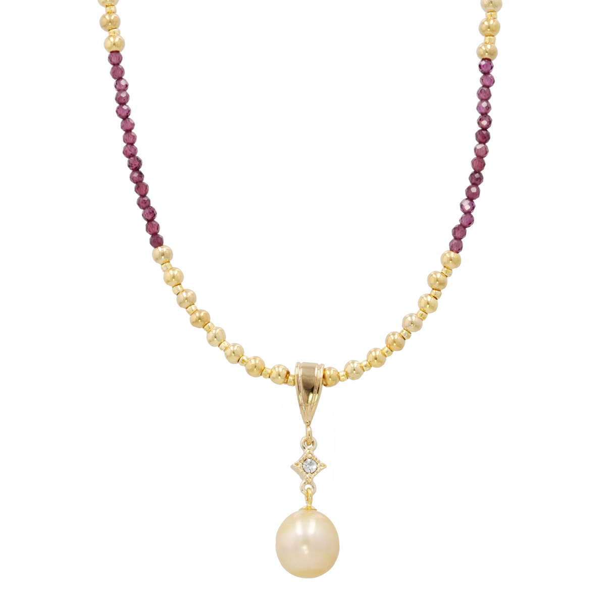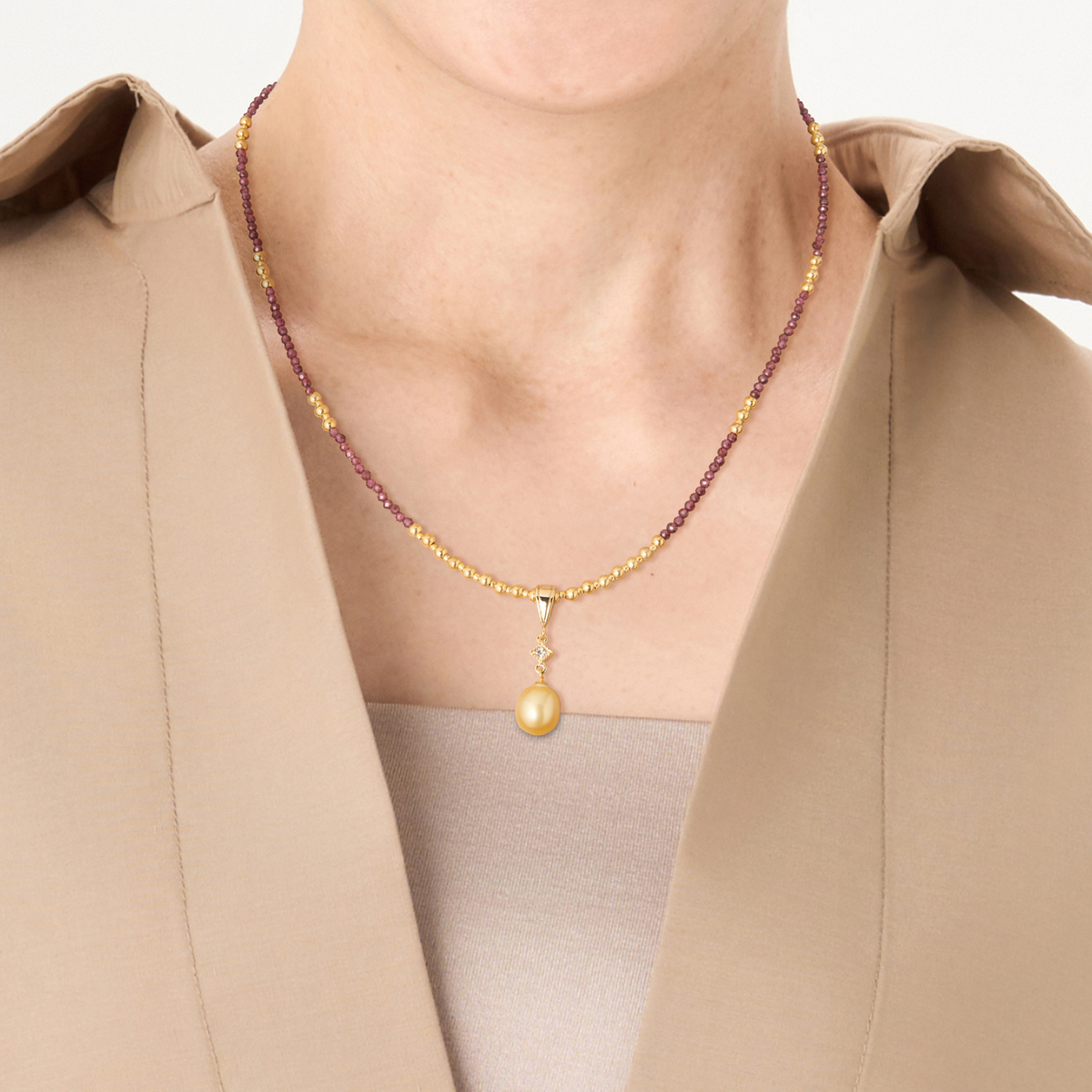南洋ゴールデンパールが胸元でやさしく輝く、エレガントなペンダントネックレス。上品な光沢と気品ある色合いが、装いに洗練された印象を与えてくれます