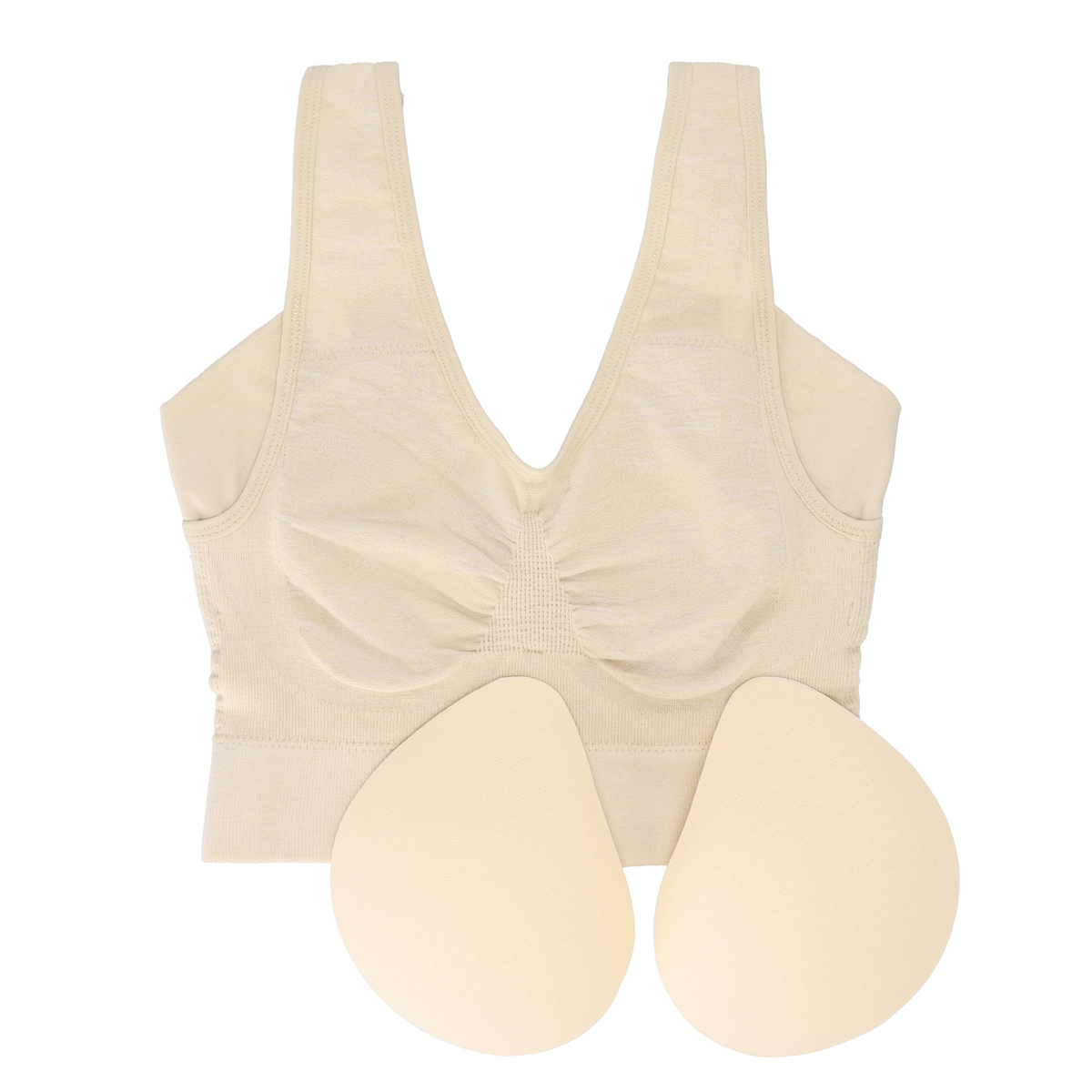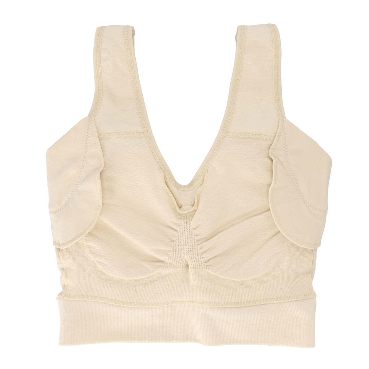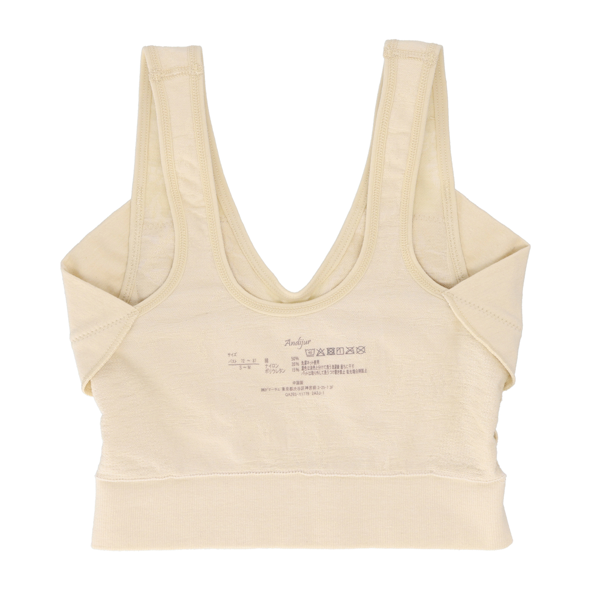 [商品寸法(ヌード)cm] サイズ バスト S-M :(72〜87) L-LL :(86〜101) 3L-4L:(100〜115) [仕様] ・ワイヤー無 ・パッド有(取外し可) [素材] 綿 50% ナイロン35% ポリウレタン15% [お手入れ] 洗濯機洗い可 [注意事項] ※濃色は淡色と分けて洗う ※洗濯後直ちに干す ※パットは取り外して洗う ※つけ置き禁止 ※蛍光増白剤禁止 【中国製】