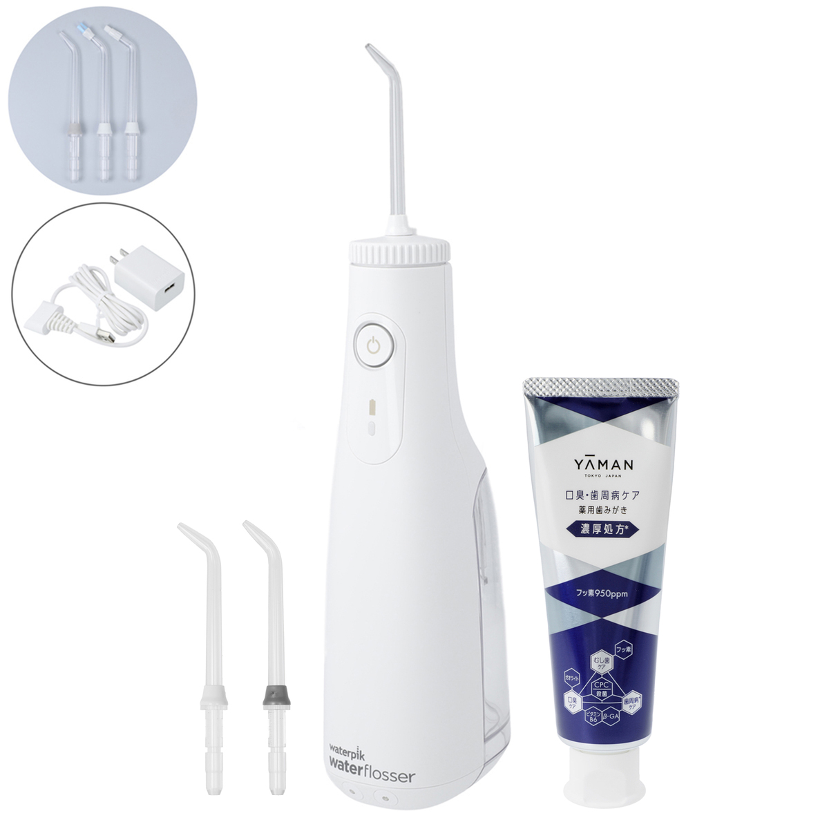 [商品内容] ヤーマン薬用歯みがきG(医薬部外品) 70g [認められた効能] 歯周炎(歯槽膿漏)の予防、歯肉(齦)炎の予防、歯石の形成及び沈着を防ぐ、虫歯の発生及び進行の予防、口臭の発生の防止、タバコのやに除去、歯を白くする、口内を浄化する、口内を爽快にする [使用方法] 適量を歯ブラシにとり、歯及び歯ぐきをブラッシングしてください [注意事項] ※発疹・発赤、かゆみ、はれ等の症状があらわれた場合は、使用を中止し、医師、歯科医師、または薬剤師にご相談ください ※ご使用後は必ずしっかりとフタをしめてください ※直射日光や高温多湿を避け、乳幼児の手の届かない場所に保管してください ※歯周病とは歯肉炎、歯周炎の総称です ※処方上、水を配合しておりません 【日本製】 [セット内容] ・「ウォーターピック」コードレスセレクト充電式 ・本体 ・ジェットチップ×2 ・プラークシーカーチップ ・歯列矯正用チップ ・USB充電ケーブル ・ACアダプター ・ウォーターピック ジェットチップ 2本 ・YA-MAN 口臭・歯周病ケア 薬用歯みがき ※本製品にヒビや破損、不具合がある場合は使用しない。口腔内を傷める原因となります ※本体をアルコール、シンナー、ベンジン、除光液などの溶剤で拭かない。本体の表面に損傷を与える原因となります ※チップの先端を歯や歯ぐきに強くあてないでください。けがの原因となります ※1日2回の使用目安を守る。舌や口腔内を傷める原因となります。(あくまで目安のため、ご自身の状態をよく見てご使用ください) ※保管のしかた ※使用後は、必ず水分を拭き取り十分に乾燥させてから保管してください ※本体に水分がついた状態で放置すると、本体内部が腐食する原因となります ※長期間使用しないときは、本体のお手入れをしてから保管してください ※長期間使用しないときは、保管する前に完全に充電しから保管してください ※火のそばや直射日光の下、浴室など高温多湿の場所、不安定な場所に放置せず、風通しの良い清潔な場所に保管してください ※子供の手の届かない場所に保管してください [成分] <基剤>歯磨用リン酸水素カルシウム、無水ケイ酸 <溶剤>1,3-ブチレングリコール、無水エタノール <薬用成分>ポリエチレングリコール600(PEG-12)、ゼオライト、フッ化ナトリウム(フッ素)、ピリドキシン塩酸塩(ビタミンB6)、β-グリチルレチン酸(β-GA)、塩化セチルピリジニウム(CPC) <発泡剤>グリセリン脂肪酸エステル、ラウロイルメチルタウリンナトリウム <甘味剤>キシリトール、サッカリンナトリウム <粘度調整剤>ヒドロキシプロピルセルロース <安定剤>酸化亜鉛 <香味剤>香料(クールハーブミントタイプ) <清涼剤>l-メントール<保存剤>安息香酸ナトリウム <吸着剤>B‐シクロデキストリン <矯味剤>チャ乾留液 <洗浄剤>ムクロジエキス <湿潤剤>ビワ葉エキス
