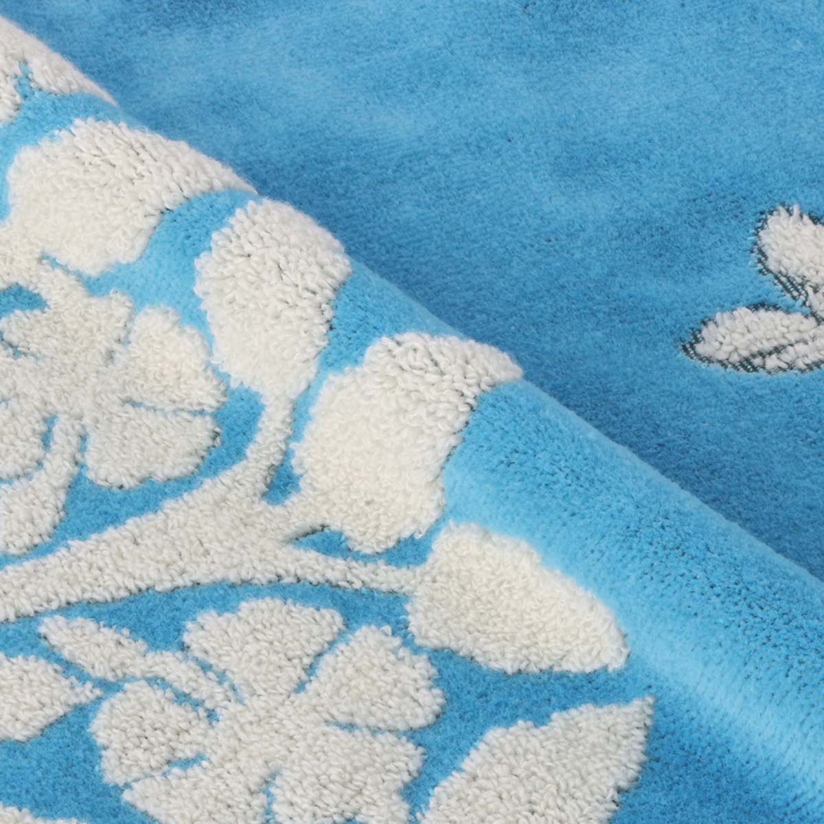 無撚糸蒸シャーリング加工で、柄の部分はループ状になり鮮やかに表現。グランド部分はシャーリングカットすることで、凹凸感のある仕上がりになっています