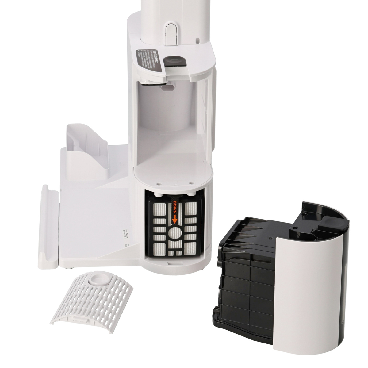 [商品内容] ・ハンディクリーナー(掃除機本体) ・フレックスパイプ ・電動フロアノズル ・ダクト ・自動ゴミ収集ドック(充電機能付き) ・ブラシ付き隙間用ノズル ・マルチノズル ・ミニモーターヘッド ・アクセサリードック ・リチウムイオンバッテリー×2(バッテリーはハンディクリーナーとバッテリー充電スロットに1個ずつ装着されています) [サイズ]高さ×幅×奥行 コードレススティック:104.0×22.8×16.0cm ハンディ本体:51.0×9.1×7.1cm 充電ドック収納時:106.1×28.0×25.7cm [重量] 約1.7kg(ハンディクリーナーにバッテリー、パイプ、電動フロアノズル装着時) [充電時間] 約3.5時間充電で最大約50分(コードレススティック時)使用可能 [消費電力]225W [充電使用時間] <コードレススティックでの使用時>※バッテリー2個連続使用時 ブーストモード:約15分、iQモード:約15〜50分、エコモード:約50分 <ハンディでの使用時>※バッテリー2個連続使用時 ブーストモード:約15分、iQモード:約15〜70分、エコモード:約70分 [使用方法] <製品の組み立て> 1、ハンディークリーナー(掃除機本体)、パイプ、電動フロアノズルを接続・固定する 2.、ドック用ダクトを自動ゴミ収集ドックに差し込む <充電> 1、電源プラグをコンセントに差し込む 2、充電方法:ハンディ本体で直接充電 <使用方法> 1、ハンドル部にある電源ボタンを押す 2、電源を切るには、もう一度ボタンを押す [お手入れ] <ダストカップを空にする> 1、ゴミ捨てボタンを前方にスライドさせてダストカップを開きゴミを捨てる 2、乾いた布で汚れを拭き取る <ダストカップとフィルターの清掃> 1、フィルターリリースボタンを押し、フィルター容器を引き出す 2、フィルターとフィルター容器を水洗いし24時間以上自然乾燥させる 3、取り外したダストカップは、水で洗うか湿らせた布で拭き取る。洗浄後は十分に自然乾燥させる <フロアノズルのお手入れ> 1、フロアノズルをパイプから取り外す 2、フロアノズルを湿らせた布で拭き上げる <ゴミ詰まりの点検> ハンディークリーナー、パイプ、フロアノズルを取り外し、中にゴミや異物が詰まっていた場合は取り除く ■組み立て式(組み立て所要時間:5分以内) ■取り扱い説明を充分にご確認の上、ご使用下さい 【中国製】 [注意事項] ※本製品の構成部品には電気端子や配線、可動部品が含まれているため、ご使用の際は十分ご注意下さい ※使用する前に、必ずすべての部品を点検し、破損がないことを確認して下さい ※必ず取扱説明書の説明に従って使用して下さい。取扱説明書で説明する目的以外のいかなる目的にも本製品を使用しないで下さい ※本製品の部品は、フィルターおよびダストカップを除き、水などの液体にさらさないで下さい ※本製品を業務用や掃除以外の目的に使用しない ※本製品や電源プラグを濡れた手で取り扱わない ※本製品が通常どおりに動作しない場合や、本製品を落とした場合、破損させた場合、屋外に放置した場合、浸水させた場合は使用しない ※本製品の部品は、フィルター(HEPAフィルターを除く)、ブラシロール、ダストカップを除き、水などの液体にさらさない