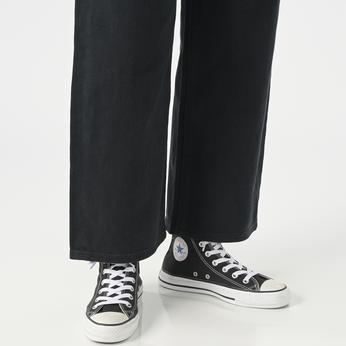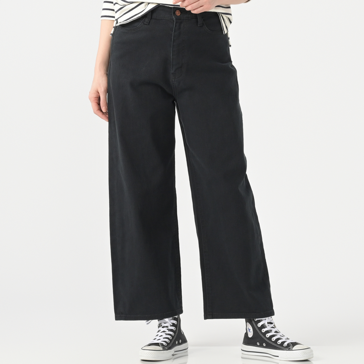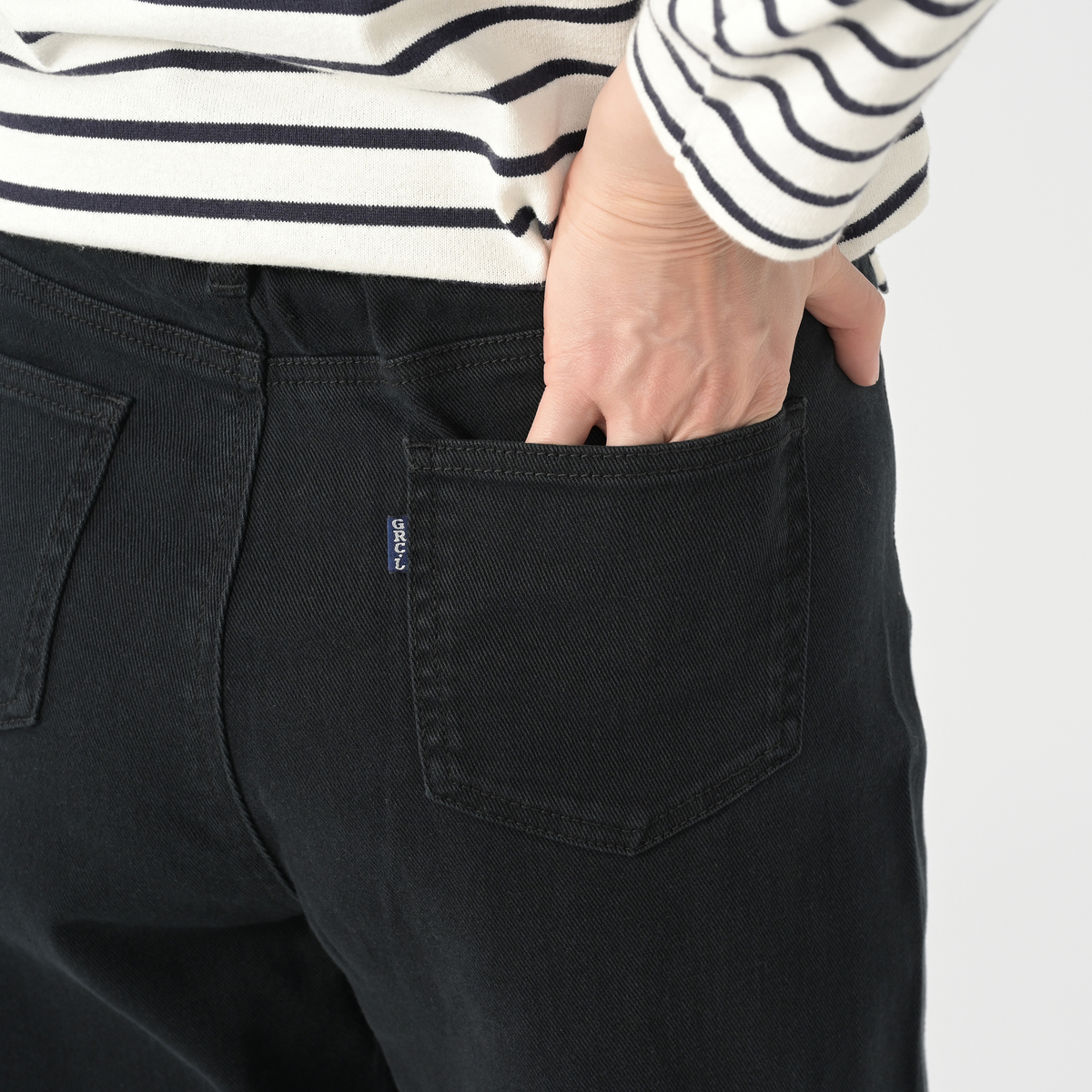 脚のラインを拾いにくいセミワイドシルエットのカラーデニムパンツ。有名デニムブランドの加工もしている世界有数のデニム加工工場、SAAB社で一貫して縫製、加工を施しました