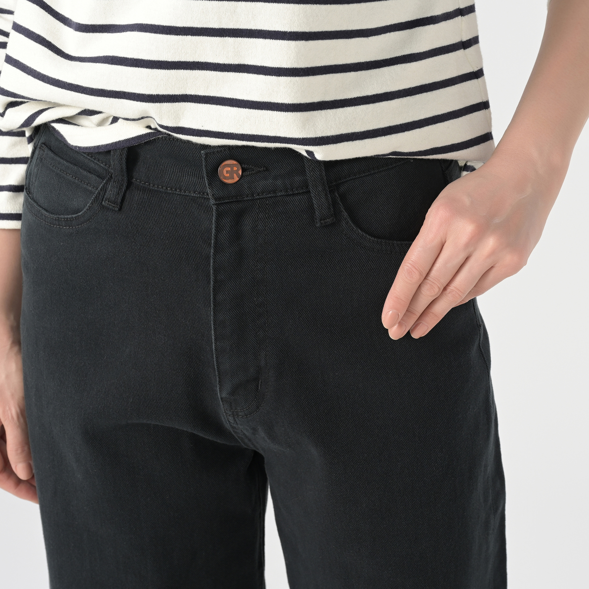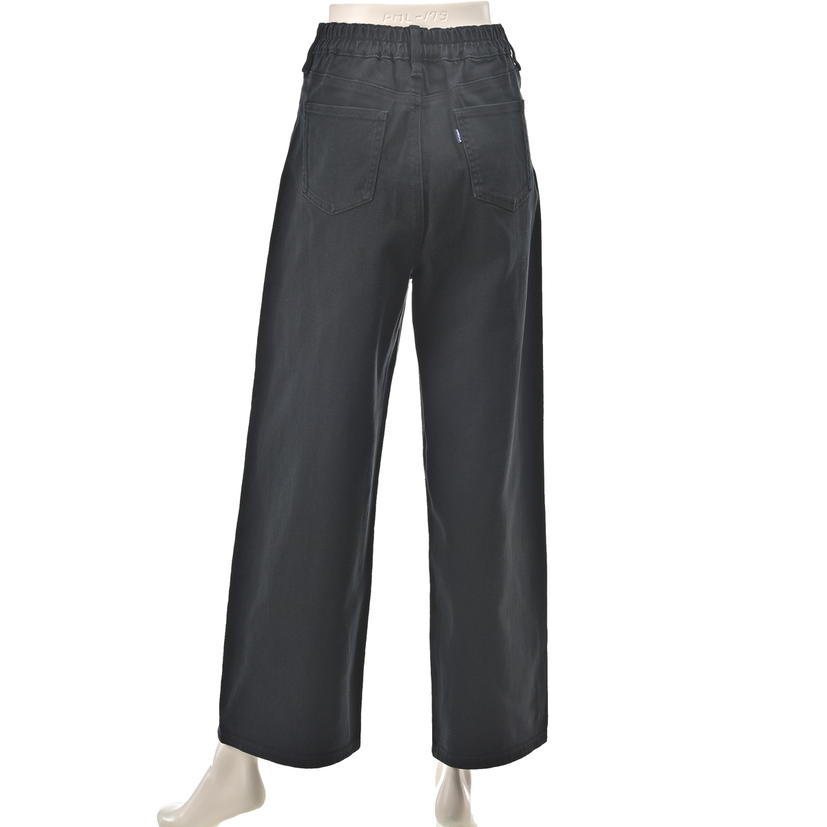 カッパーカラーのボタンやロゴ入りピスネームなど、細部までこだわった本格的な仕立て。ウエスト後ろはゴム入りギャザー仕様、前はファスナー開きで穿き心地の良いアイテムです