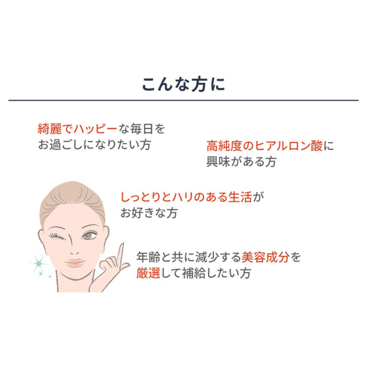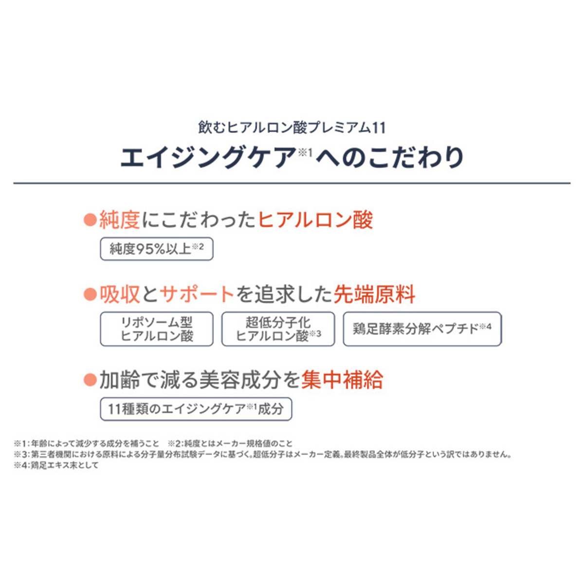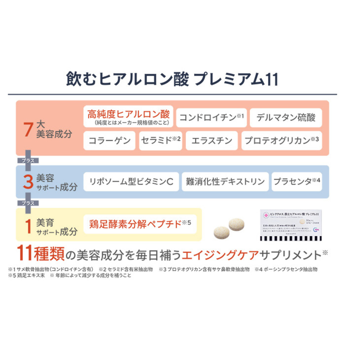 ヒアルロン酸(*4)のほか、コラーゲン(*4)、デルマタン硫酸、エラスチン、ポーシンプラセンタ抽出物、セラミド含有米抽出末、プロテオグリカン含有サケ鼻軟骨抽出末、リポソーム型ビタミンC(*4)、サメ軟骨抽出末(コンドロイチン含有)、難消化性デキストリン、鶏足エキス末を配合しています