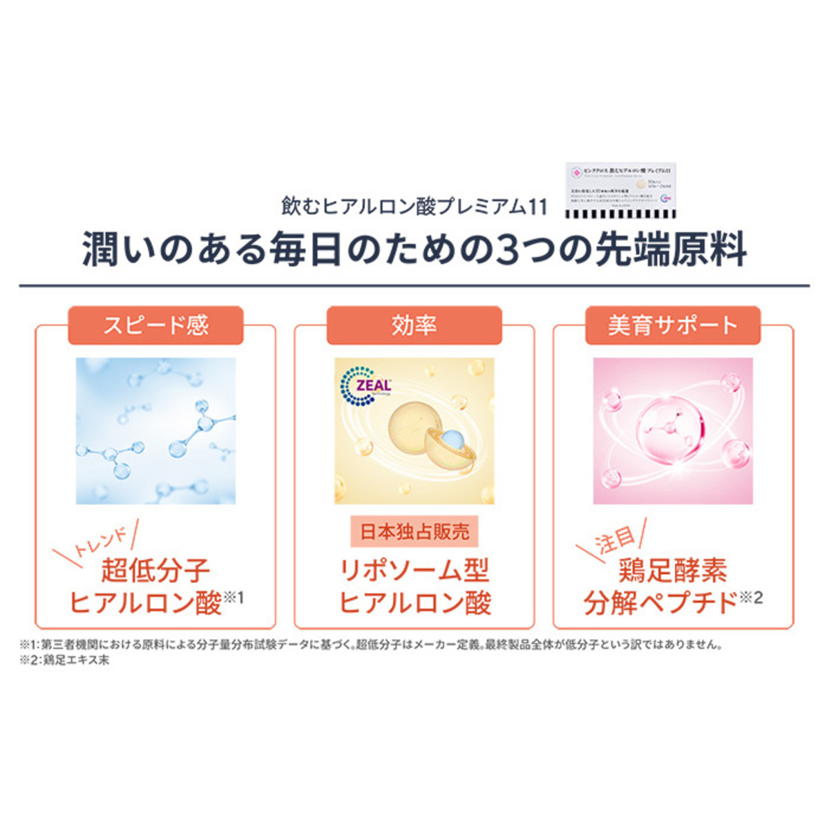 *2)第三者機関における原料による分子量分布試験データに基づく。超低分子、低分子、中分子、高分子はメーカー定義です。最終製品全体が低分子という訳ではありません