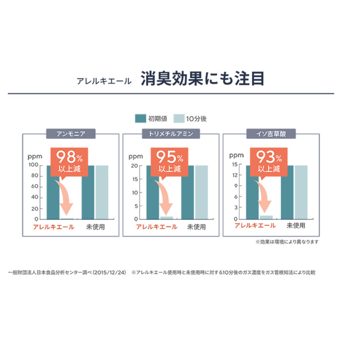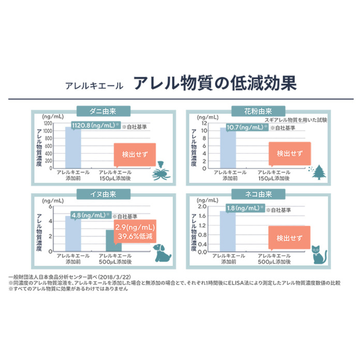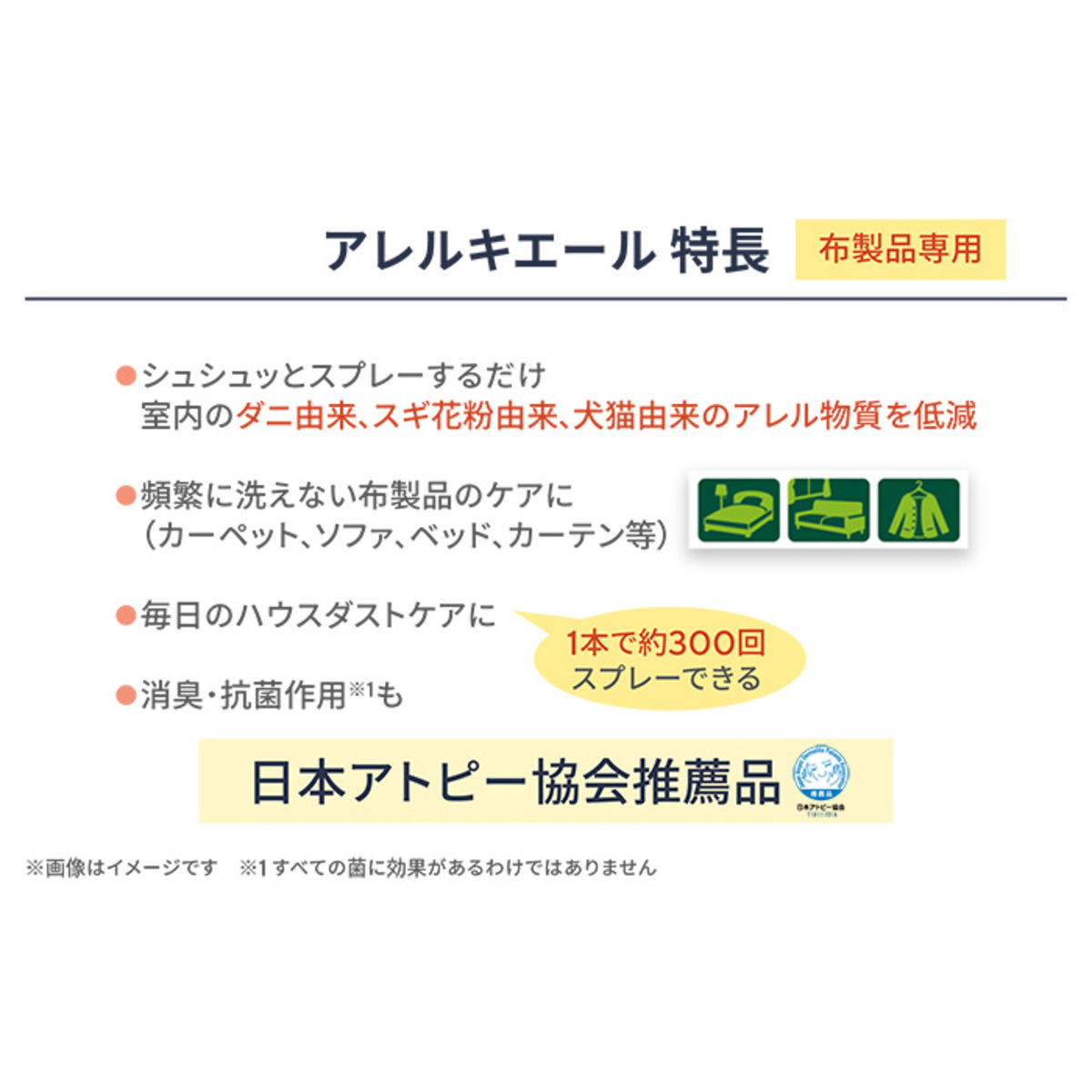 室内のダニ由来、スギ花粉由来、犬猫由来のアレル物質を低減。毎日のハウスダストケア、頻繁に洗えない布製品(カーペット、ソファ、ベッド、カーテン等)の毎日のケアに便利な「アレルキエール」です(*1)。布製品の消臭・抗菌に役立ちます(*2)